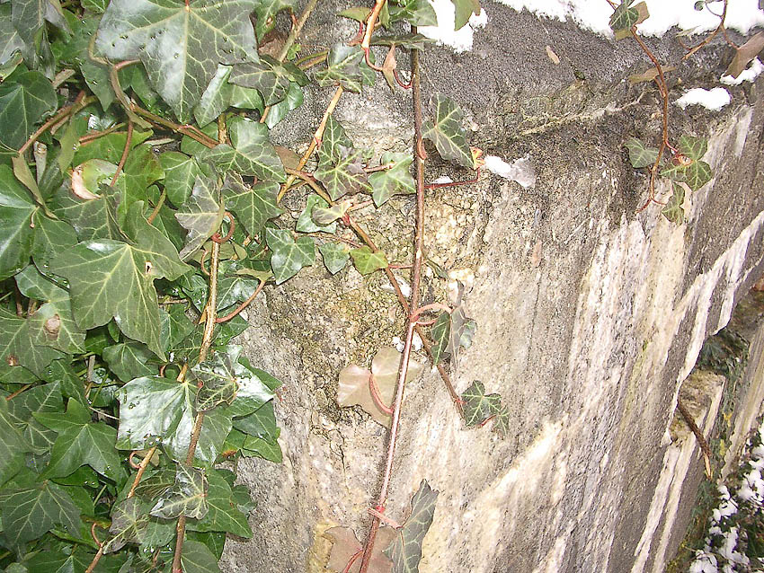 Die Nordseite ist total bewachsen. In der Scharte befinden sich Klinkersteine. Die Südseite weist aufgrund der Metallverblendung keine Scharte auf. Eine dortige Scharte wäre auch sinnlos gewesen, da das angrenzende Gebäude schon immer vorhanden war und somit zwangsläufig die Sicht versperrt hätte...