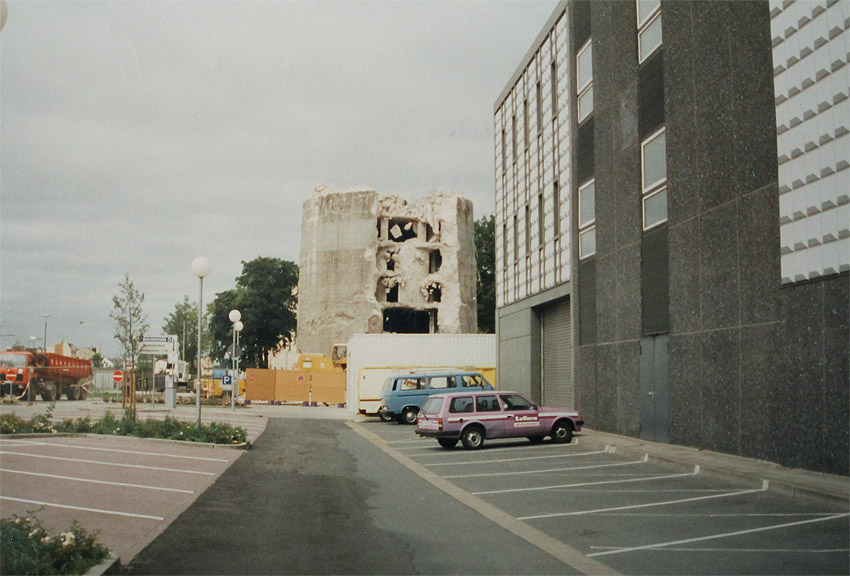 Gut zu sehen der aufgesprengte Bereich und weitere, wohl durch die Sprengung entstandene Schäden an der Turmwand. In dem Raum dahinter, teilweise fehlten einzelne Etagen durch die Sprengung, hatte Firma "Leffers" ein Lager.