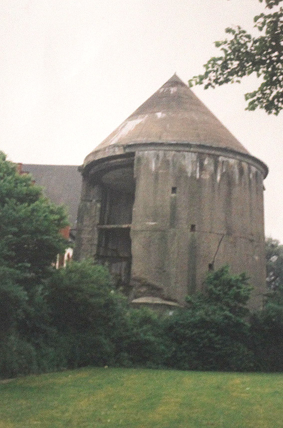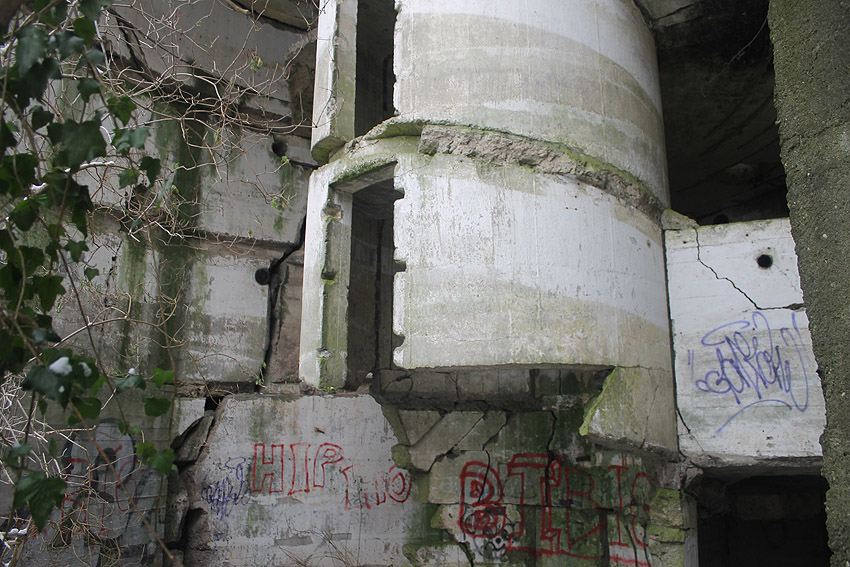 Nach der Sprengung. Der LS-Turm kippte nicht nach Norden zwischen die Kasernenbauten, wie von den Besatzern gewollt. Er blieb in diesem Zustand stehen, war aber augenscheinlich demilitarisiert und wurde der Stadt überlassen. Später wurden zwei Betonblöcke an die Bruchstellen des Sockelbereiches gegossen, um den Turm zu stabilisieren.