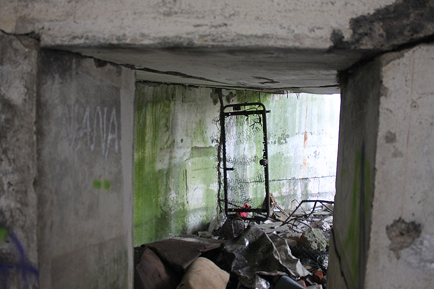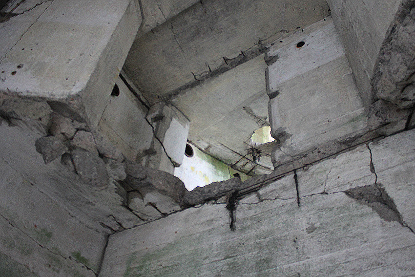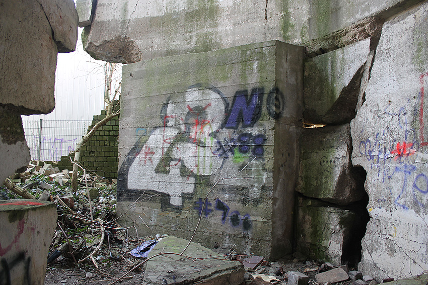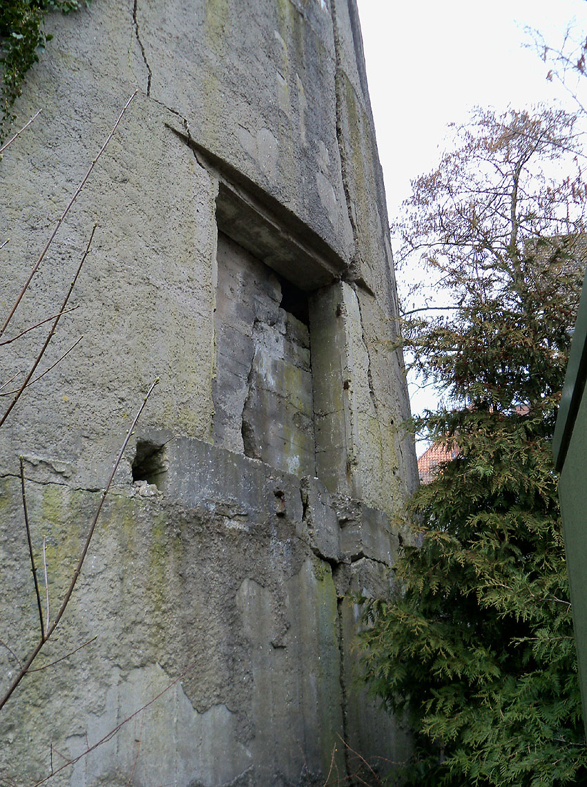 "Detonation einer Bombe nach Abgleiten vom Spitzdach direkt vor dem Bunkereingang (gemeint ist der zweite Eingang, beziehungsweise Notausgang - leicht erhöht - rechts des Haupteinganges) während eines Luftangriffes 1943 / 1944. Dadurch wurde die komplette Eingangstreppe weggesprengt (auch vor diesem Notausgang befand sich eine Treppe, siehe Bild oben) und die Schutzsuchenden im Bunker mussten nach der Entwarnung von Marineangehörigen der benachbarten Werft mit Leitern herausgeholt werden*. Danach wurde provisorisch eine Holzleiterkonstruktion angebracht."