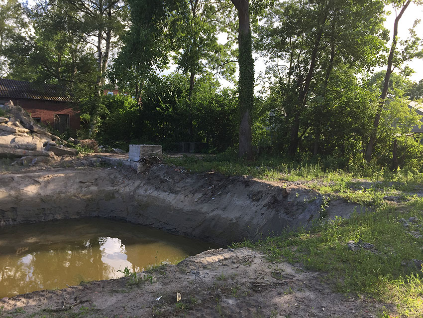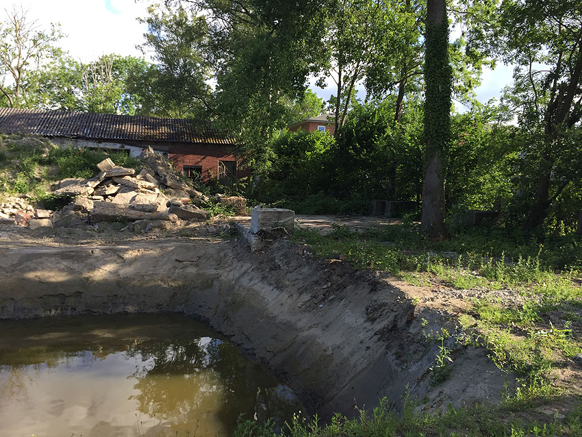 2023 finden hier wieder Arbeiten statt. Ein weiterer verbliebener Gebäudebereich wurde bereits vor einiger Zeit abgebrochen und eine Art Teich wurde nun geschaffen. Ein neuzeitlicher Feuerlöschteich soll dies doch wohl nicht werden (?). Gut zu sehen nun der Turm-Sockelbereich mit Fundament. Eventuell muss auch dieses Relikt nun bald weichen?