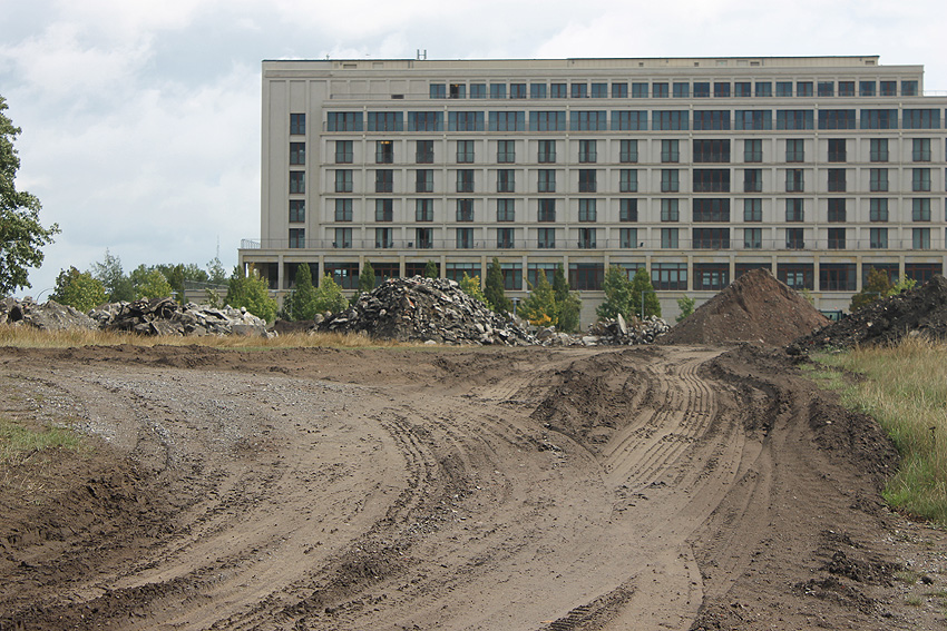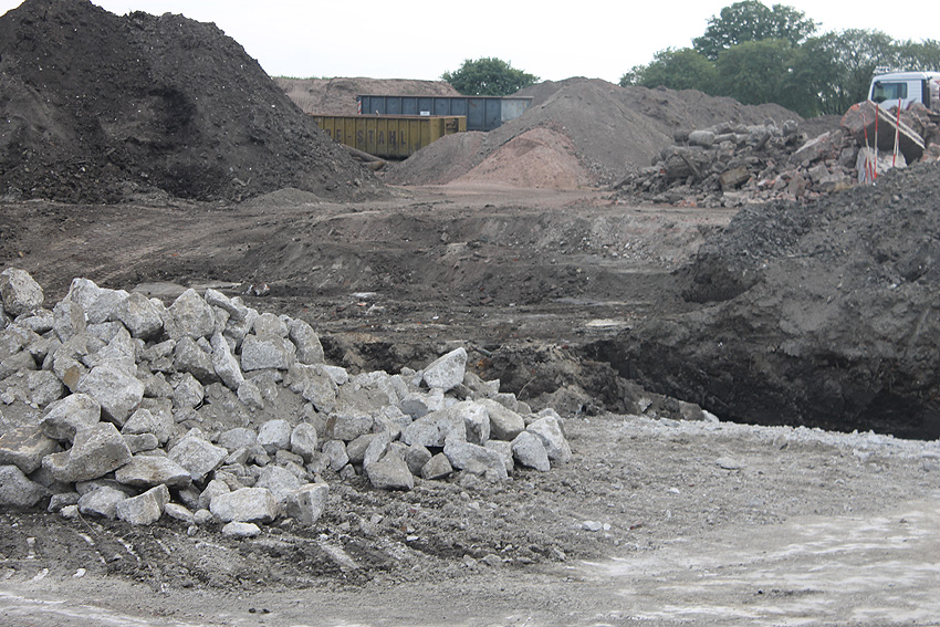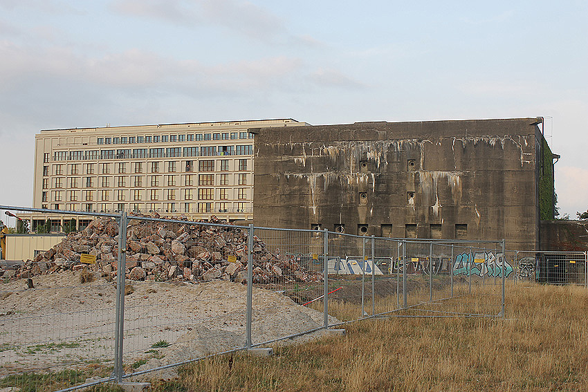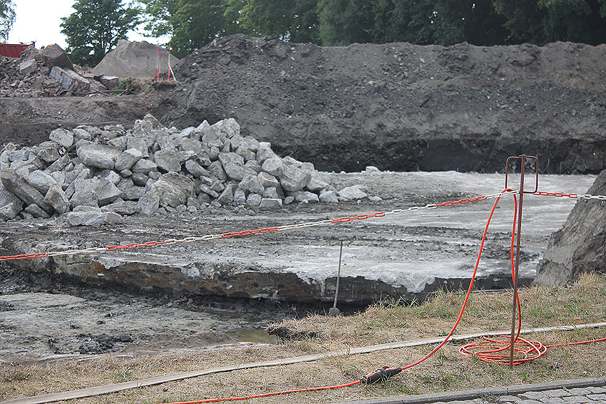 Im westlichen Bereich der Zerschellerplatte des T 750 wurde ein Teilstück weggebrochen und ein "Tunnel" bis etwa einen Meter unter das eigentliche Bunkerfundament getrieben. Hiermit sollte festgestellt werden, auf wieviel Pfählen der Bunker gegründet ist. Die Freilegung von zwei Pfählen reichte dafür wohl zur Berechnung aus. Die Maßnahme soll nach unseren Informationen nötig gewesen sein, um Statikwerte bezüglich des geplanten Überbaues des T 750 zu berechnen. Nach etwa einer Woche wurde die Öffnung dann wieder verfüllt und die zerstörte Zerschellerplatte in dem Bereich neu mit Betonschlemme ausgefüllt. Die eigentlichen Sanierungsarbeiten auf dem Gelände "wandern" nun weiter in Richtung Westen in etwa abschließend mit der westlichen Bunkerwand. Im Oktober sollen die Arbeiten abgeschlossen sein. Auch die verbliebene Fundament-Sohlplatte des Öltanks "Grodenfähre Nord" wurde mittlerweile zerkleinert und abgetragen.