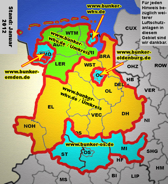 Diese Karte zeigt, unter welchen unserer Internetadressen ausführliche Informationen über Luftschutzanlagen der einzelnen Städte und Landkreise aufgezeigt werden. Anlage zur Tabelle Bunker Wilhelmshaven / heutige und frühere Straßennamen der Stadt. Um den Rahmen der Luftschutzanlagen-Haupttabelle nicht zu sprengen, finden Sie hier separat ein Verzeichnis heutiger und früherer Straßennamen Wilhelmshavens. Über dieses Verzeichnis können Sie die damaligen Namen der Standorte vieler Wilhelmshavener LS-Anlagen erfahren.