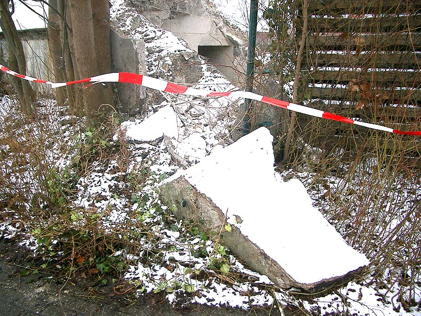 09.03.06: Seit den ersten Abrissarbeiten vor einer Woche ist nichts weiter geschehen. Ein Abrissstop ist eingetreten, da durch die Erschütterungen der ersten Maßnahme das gegenüberliegende Gaststättengebäude drohte, beeinträchtigt zu werden! Nun soll versucht werden, den Bunker mit einer speziellen Diamantsäge zu zerkleinern! Die Kosten dürften bei dieser Art des Abrisses höher sein, als zunächst eingeplant...