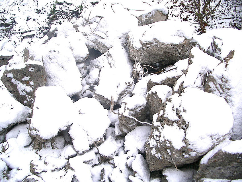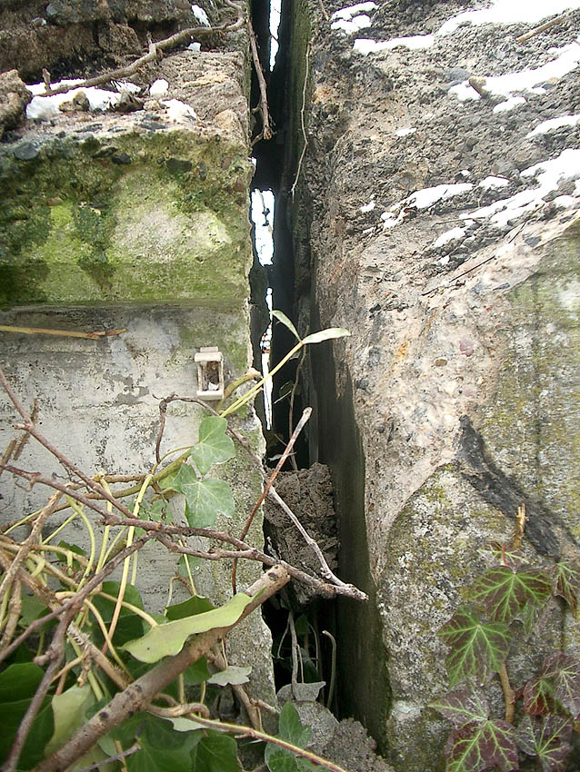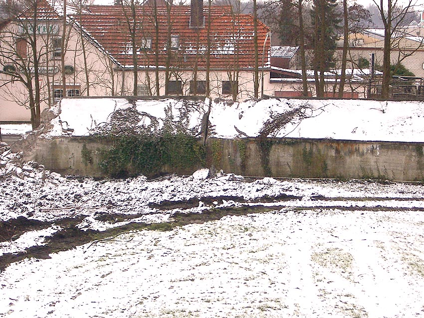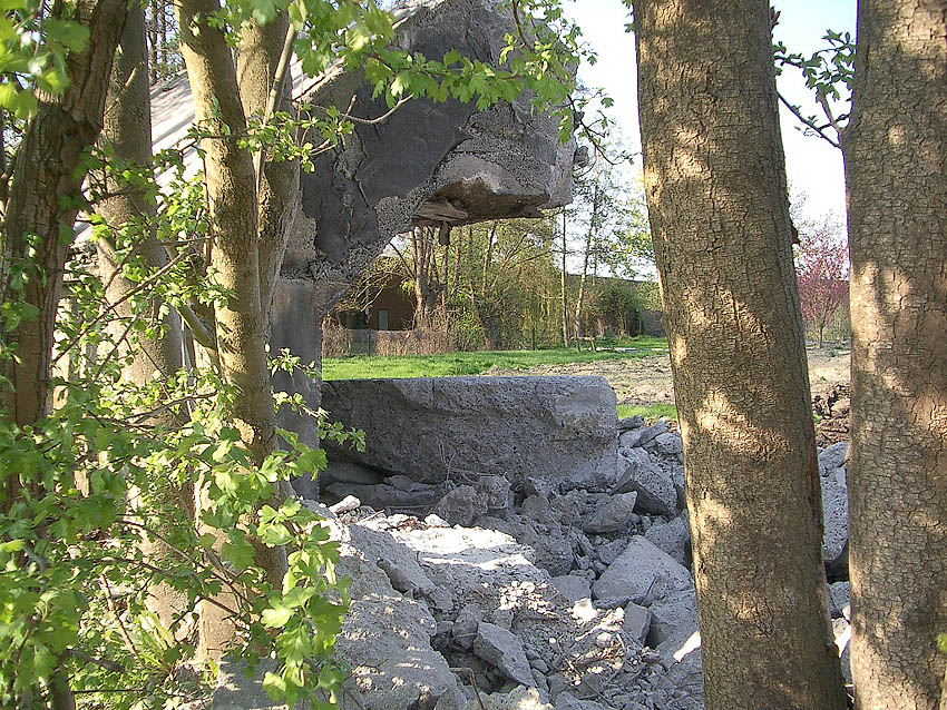 05.05.06: Der Abriss wurde letzte Woche weiter fortgeführt! Die frühere mittlere Kammer wurde nun seitlich aufgebrochen, zusammen mit dem Druckprellwandbereich und Teilen der darauf folgenden zweiten Kammer aus Nordrichtung. Wasser ist von der vorherigen Kammer aufgrund der Öffnungen und der Erschütterungen, sowie der daraus erfolgenden Bewegung des Objektes (dies stützt unsere These vom Absacken des südlichen Teiles in den letzten Jahrzehnten, anscheinend ist der Boden in diesem Bereich sehr nachgiebig...) im weichen Bodengrund in die aufgebrochene ehemalige mittlere Kammer sowie in die folgende Kammer in Richtung Norden gelaufen. Einzelne große Trümmer liegen seitlich östlich und südöstlich des Grabens. Erstaunlich, dass ein Bagger derartige Leistungen vollbringen kann: