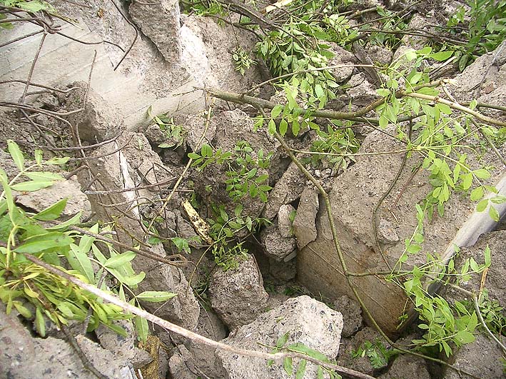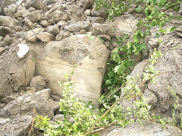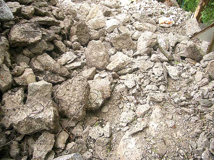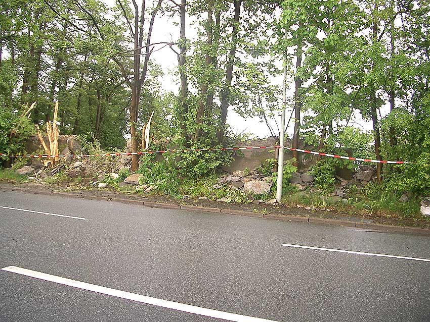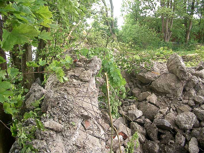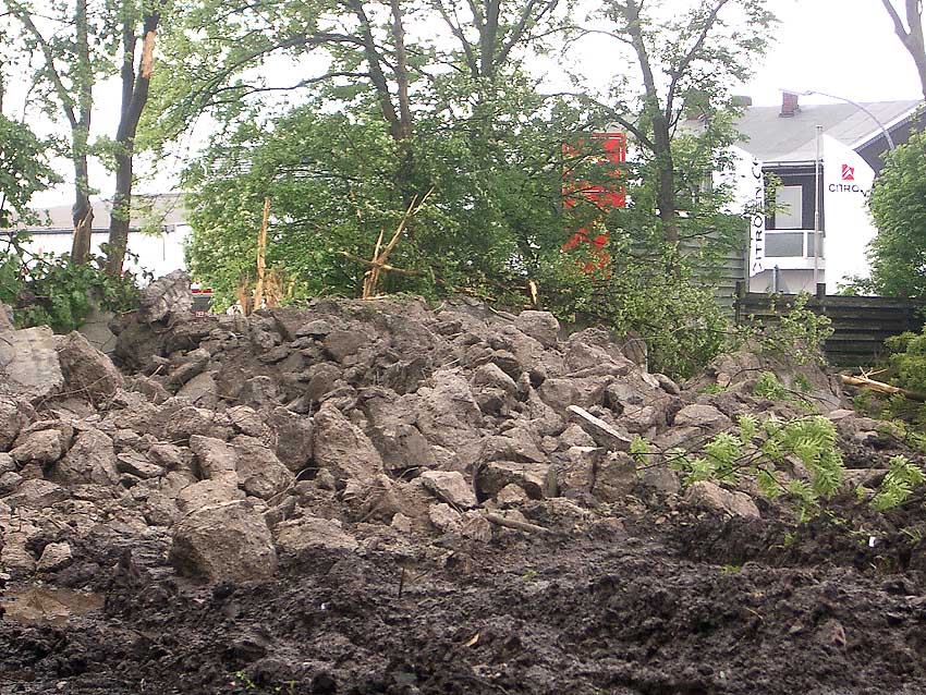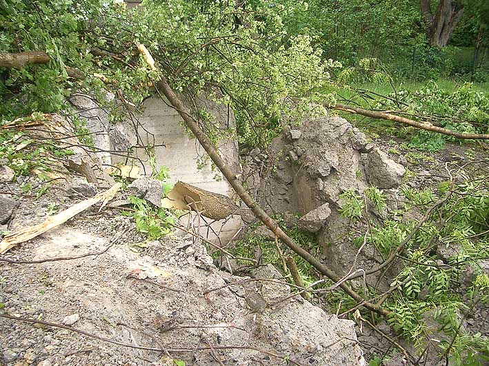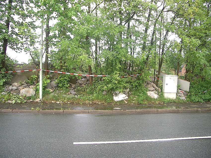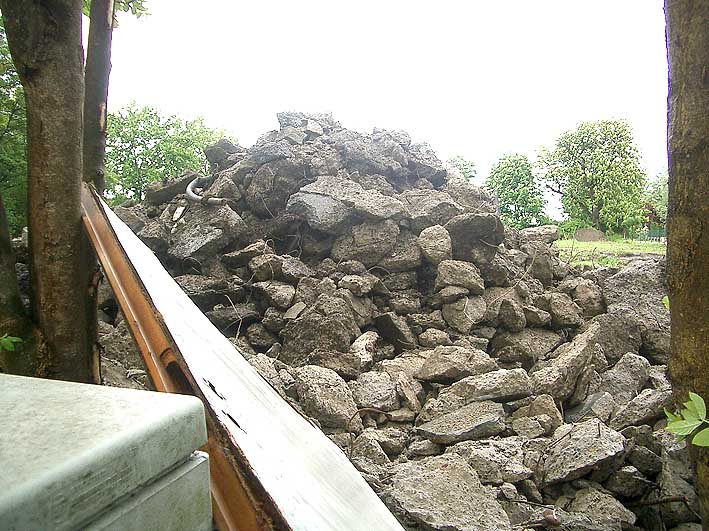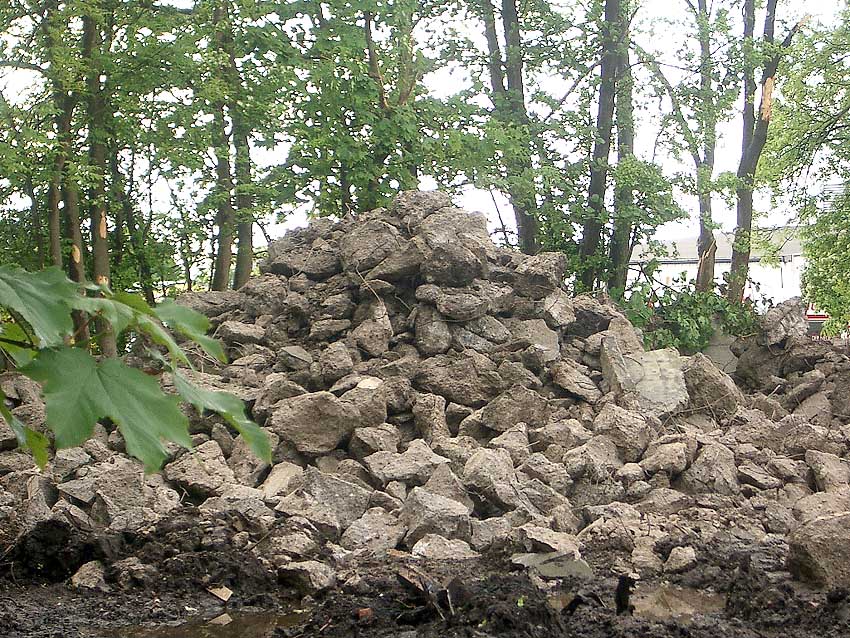 24.05.06: In nur drei Tagen wurde ab Montag bis heute fast der gesamte noch vorhandene Rest des betonierten Deckungsgrabens zerkleinert. Zwei Betonbrockenberge des anfallenden Schuttes sind inzwischen aufgetürmt. Nach den zögerlichen ersten Abrisswochen kann man sagen, dass nun "ganze Arbeit" geleistet wurde. Man sieht wieder einmal, es lag wohl doch nicht an der Technik sondern an anderen "Hürden". Vielleicht war diese Abrissdauer auch geplant. Jedenfalls wird in einigen wenigen Etappen wohl (über Erdgleiche) nichts mehr an den Graben erinnern.