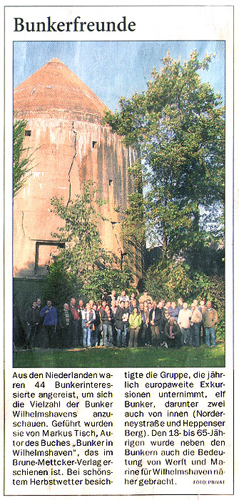 Vor einigen Tagen reisten "Bunkerfreunde" aus den Niederlanden an, um sich über die Wilhelmshavener LS-Anlagen zu informieren. Die WZ berichtete hierüber in ihrer Ausgabe vom 16.10.07: Weitere Aufnahmen in die neue Rubrik: Wilhelmshavener Bunkerimpressionen - von Hartmut Klose eingefügt. |