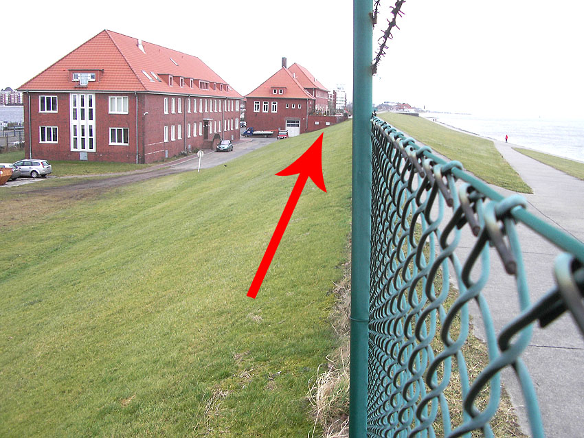 An den alten Kasernen am Südstrand, genauer am mittleren Gebäude, befindet sich zum Deich hin ein angesetztes Bauwerk mit Terrasse. Hinweise besagen, dies wäre ein Bunker. Stimmt das? Hier |