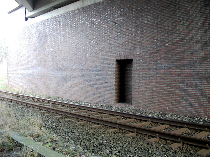 Wieder ein interessanter Hinweis von Herrn Haake: Die "Sander Berge" bei Sande sind zwei 1942 gebaute Brücken für die Einfallstraße in Richtung Wilhelmshaven. Die nördliche Brücke befindet sich über dem Ems-Jade-Kanal, die zweite, südliche Brücke über der Bahnstrecke Sande-Esens. In den beiden Widerlagern dieser Brücke sind zwei vermauerte Eingänge vorhanden. Was war das? Eventuell zwei LS-Räume der Reichsbahn (Zug hielt unter der Brücke bei Vollalarm an, Reisende und Personal suchten die Räume auf...)? Oder waren es zwei Räume zur Sprengstofflagerung im Falle eines Zerstörungsbefehls der Brücke? Wer hat Infos? Hier |