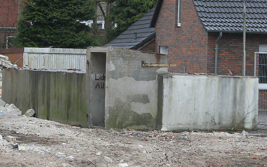 Der kleine Schutzbau Rüstersieler Straße 67 befindet sich seit gestern, 15. April 2016, im Abriss. Der Eingangsbau ist bereits zerstört, ebenso ein Teilbereich der Decke. Damit verschwindet wieder ein Relikt, das man ohne Mühe hätte als Anschauungsobjekt erhalten können. Gestört hätte allein platzmäßig das kleine Bauwerk für das Neubauvorhaben bestimmt nicht... Hier