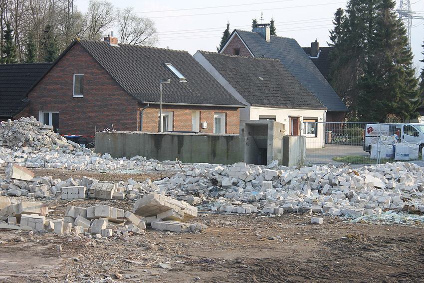 Wieder Abriss - Kleinbunker Rüstersieler Straße 67: Der Schutzbau wird zusammen mit der anliegenden, seit einiger Zeit nicht mehr genutzten Firmenbebauung Anfang April 2016 abgerissen (Standort für einen neuen Kindergarten). Die Firmenbebauung ist mit Stand von heute schon teilweise Geschichte. An den Gebäuden begann der Abbruch bereits Mitte des laufenden Monats. Hier