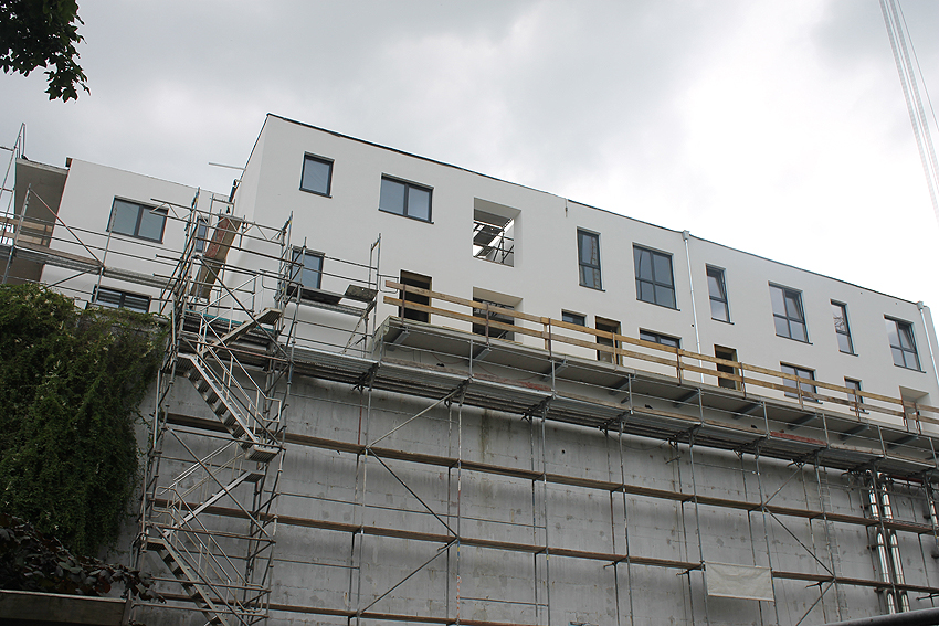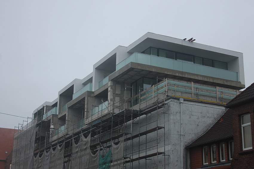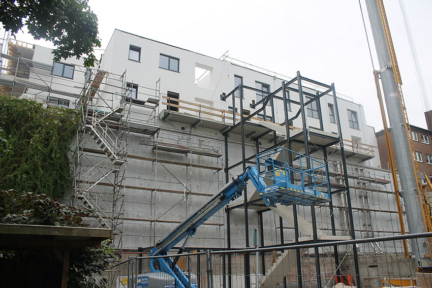 Am ehemaligen OP-Bunker Virchowstraße wird nun an der rückwärtigen Ostwand der Treppenhaus- und Fahrstuhlanbau für die aufgebauten Wohnungen errichtet. Wo genau der Fahrstuhl installiert wird, ist uns allerdings noch etwas unklar. Die Arbeiten gehen stetig weiter ihrer Vollendung entgegen. Hier Klein Wangerooge: Die beiden westlichen Tanks werden weiter zerkleinert und die Reste vor Ort zerschreddert. Der Splitterschutzzugangsrest von Tank Süd-West ist noch existent. Wir bleiben weiter dran. Hier