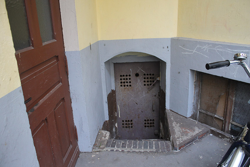 Im Hinterhof der Börsenstraße 2 befindet sich diese inzwischen "durchlöcherte" LS-Tür. Früher war sie intakt. Die "Durchsiebung" erfolgte wohl aus Lüftungszwecken für den Keller dahinter. Bereits vor etwa 40 Jahren war sie nachweisbar an dem Ort. Befand sie sich auch im WK 2 hier? War dies der Einstieg zu einem LS-Keller oder wurde sie nach dem Krieg hier eingesetzt? Danke an Frank für den Tipp!