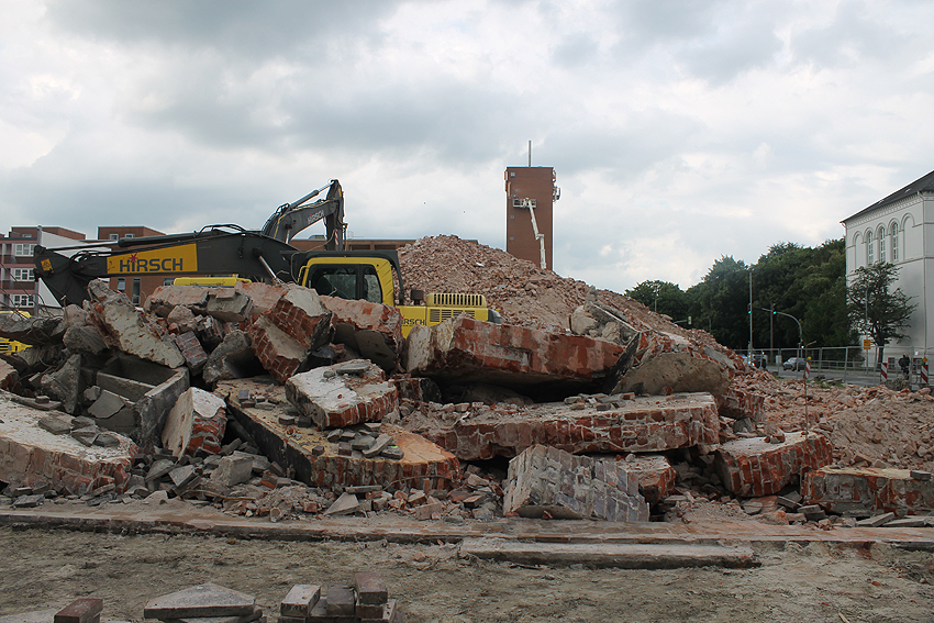 Kiel: Am Tiefbunker "Augustenbunker" im Bereich der ZOB-Baustelle erfolgen weitere Maßnahmen: Die Innenwände des Bunkers werden entfernt. Sie hatten die seinerzeitige Sprengung teilweise überstanden. Die durch die Sprengung nach dem Krieg teilzerstörte Decke ist bereits fast komplett beseitigt. Scheinbar wird der Innenbereich im Anschluss daran verfüllt und die Außenwände bleiben vermutlich großteilig erhalten. Vielen Dank wieder an Herrn Schwabedissen für das Bildmaterial! Hier