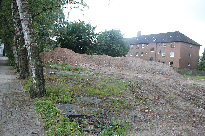Rüstersieler Straße 67: Der kleine Schutzraum ist Vergangenheit. In der Woche vom 25. April bis 29. April 2016 wurden die letzten Reste der Wände zerkleinert. Was nun noch vorhanden ist, ist eine mit Trümmern verfüllte Kuhle, die einst der Innenraum war. Das unsinnigerweise abgerissene Bauwerk kann daher als entfernt bezeichnet werden. Wieder einmal wird "Abrisshaven" seinem Namen gerecht. Hier