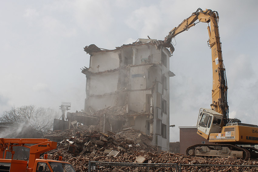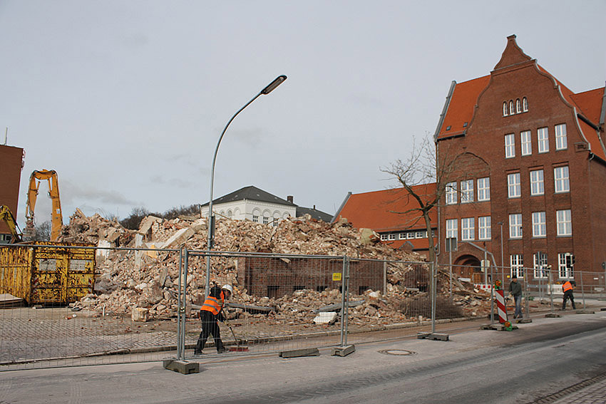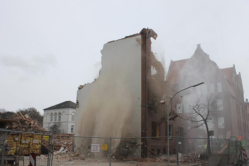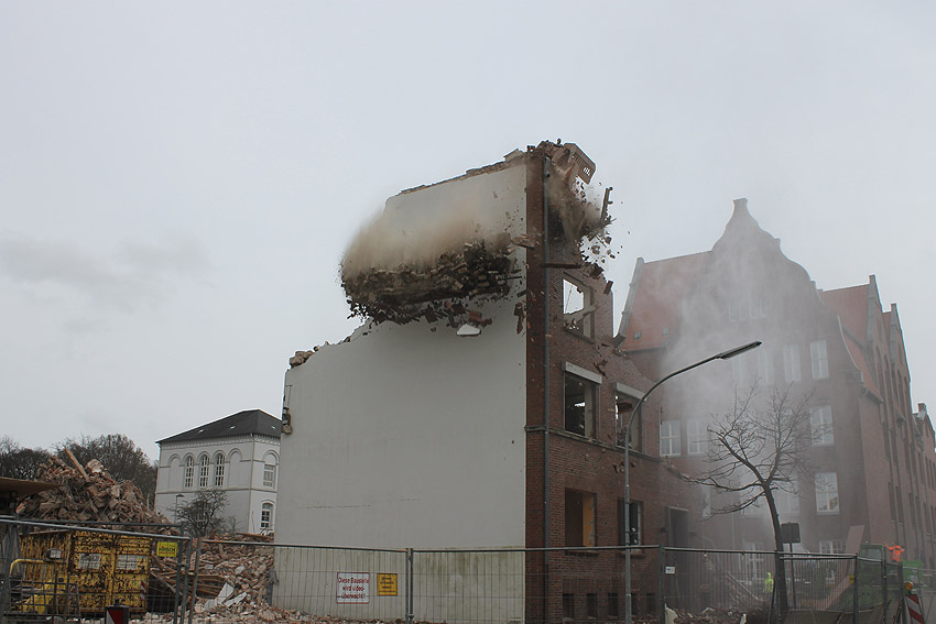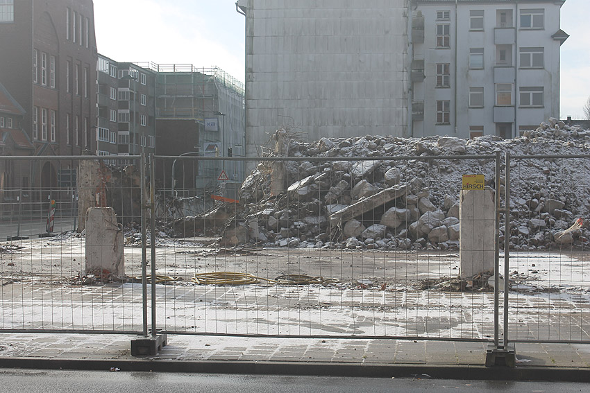 Vorgestern erfolgte die letzte Phase des Abrisses vom alten Möller-Gebäude, welches sich nachmittags beim Abbruch des Türrestes Rheinstraße 75 (und einmal bereits kurz vorher) mit einem kleinen Regenbogen - wohl hervorgerufen durch die abrissbegleitende Wasser(Schnee)-Maschine - in die Geschichte verabschiedete. Nicht ganz wahr ist jedoch, dass neben dem Gebäude ein gewaltiger Truppenmannschaftsluftschutzturm TM-LST 2250 stand. Es kann aber nicht ganz ausgeschlossen werden, dass es für das Bauunternehmen im Hof einen externen Schutzraum zusätzlich zum Luftschutzkeller im Gebäude gab. Unser Leser Walter, der sich gestern fasziniert bei uns meldete, wusste zudem von einem unterirdischen Gang vom alten Hauptbahnhof zum Möller-Gebäude und weiter bis zum OP-Bunker Virchowstraße zu erzählen. Weiterhin stellte er die These auf, der "TM-LST 2250" sei nach dem Krieg in die fünfte Dimension (!) verschwunden und in den 1990ern als Nordseepassage schließlich leicht errötet wieder aufgetaucht. Da kriegt man ja graue Haare! ;-) Ob eine Wilhelmyna die Dritte das Motto „LET it OUT“ bekannt machte, ist leider nicht belegt. Ebenfalls ist unklar, ob und wann sie überhaupt existierte. Durchaus belegt war in den vergangenen Tagen allerdings der Bereich Virchowstraße / Rheinstraße mit einer feinen Staubschicht. Die Leser mögen uns den diesjährigen kleinen Aprilscherz nicht übel nehmen.