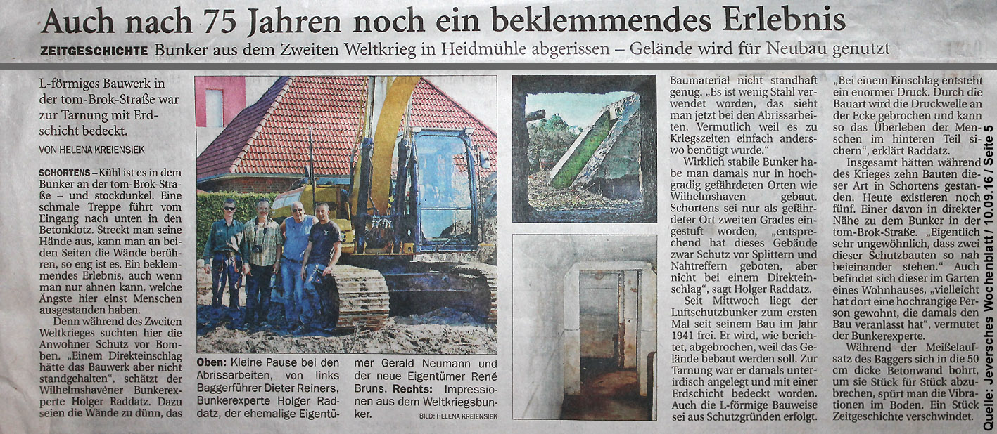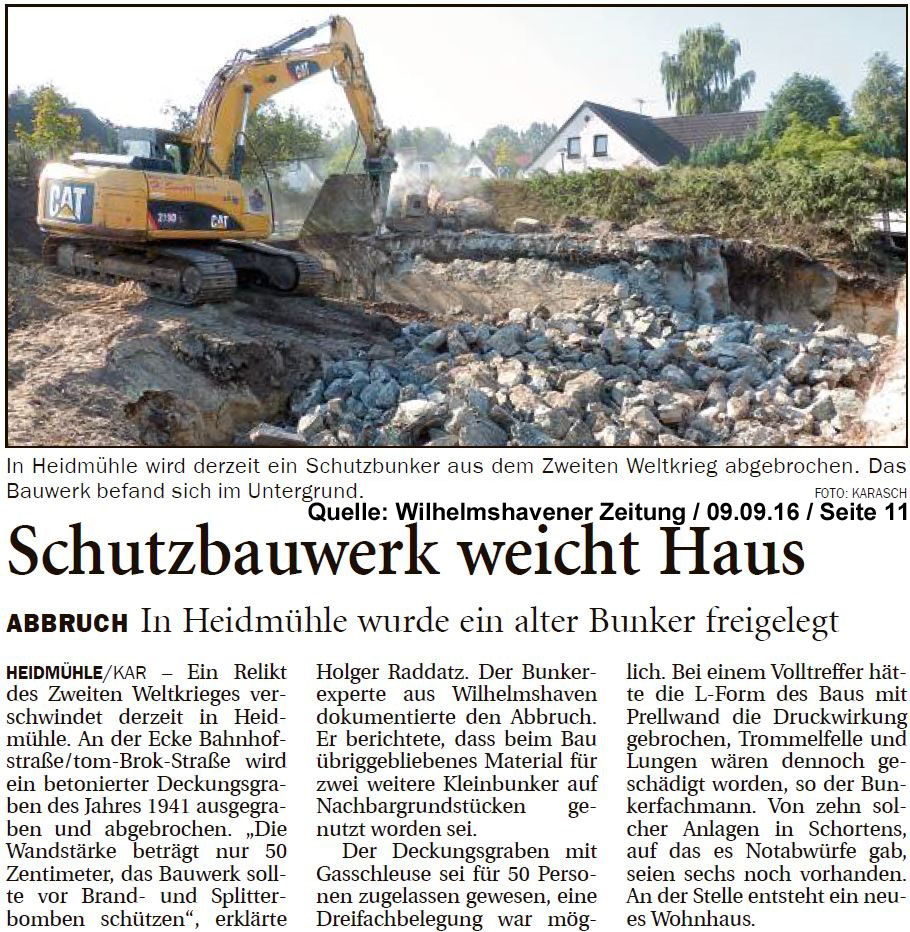 Vorgestern und gestern wurde nun der betonierte Deckungsgraben an der tom-Brok-Straße Ecke Bahnhofstraße in Schortens / Heidmühle abgerissen. Das Bauwerk konnte beim besten Willen nicht in das geplante Neubauvorhaben (Einfamilienwohnhaus) integriert werden und musste deshalb leider weichen. Der Abbruch erfolgte durch die Firma Swyter GmbH aus Jever. Wir hatten die Gelegenheit, den Abbruch ausführlich zu dokumentieren. Unser herzlicher Dank an den Eigentümer des Grundstückes, Herrn Bruns, für die Ermöglichung! Abrissdokumentation Hier und Hier Kurzfilm 1 Kurzfilm 2 Kurzfilm 3 Der NWZ-Artikel auch auf der NWZ-Webseite hier