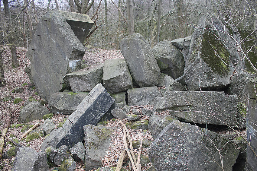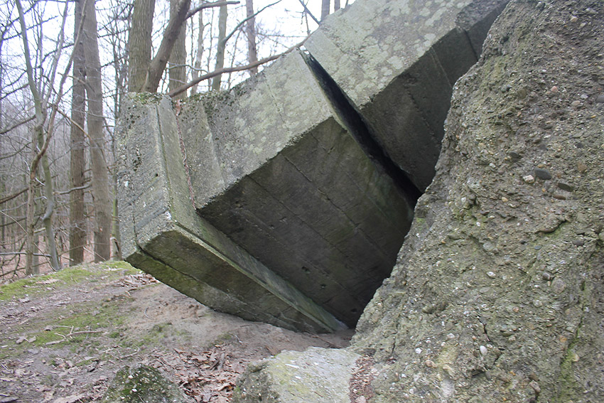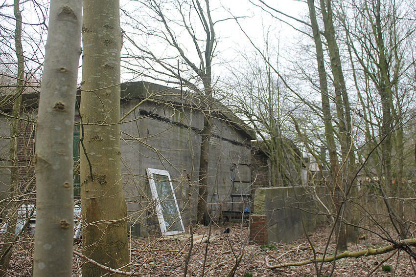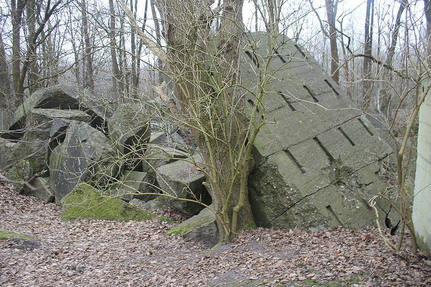 Wittmundhafen / Jackstede: Jetzt besucht - Wohl bombensichere Wartung und Unterbringung von bis zu 2 Flugzeugen in einem ausladend dimensionierten Bunker nördlich von Wittmundhafen. Explizit besaß das Objekt den Zweck einer Bordwaffen-Justieranlage. Man kann sich dies wie einen überdimensionalen Schießstand vorstellen, daher auch die enorme Massivbauweise. Ein Ausweichplatz für Flugzeuge in der für den Justierstand ausgehobenen Schneise zwischen einem langen Splitterschutzdoppelwall westlich angrenzend an den Bunker (im Falle einer Bombardierung des Einsatzhafens Wittmundhafen) wurde angelegt. Dieser Graben zwischen den Wällen diente jedoch hauptsächlich für die Bordwaffentests. Noch heute ist der Halbkreis der ehemaligen betonierten Hauptzuwegung vom Fliegerhorst zum hier anliegenden Munitionslager aus der Luft zu sehen... Ein zweiter Bunker für Justierzwecke befand sich südlich des Einsatzhafens. Davon scheint jedoch nichts mehr vorhanden zu sein. Weder Wälle noch Reste des Bunkerkörpers. Nach dem Krieg schnell demilitarisiert liegen die diversen Betontrümmer der unbewehrten Anlage noch heute eindrucksvoll mitten im Wald. Das Gelände ist in Privateigentum und darf nur mit Genehmigung betreten werden. Hier