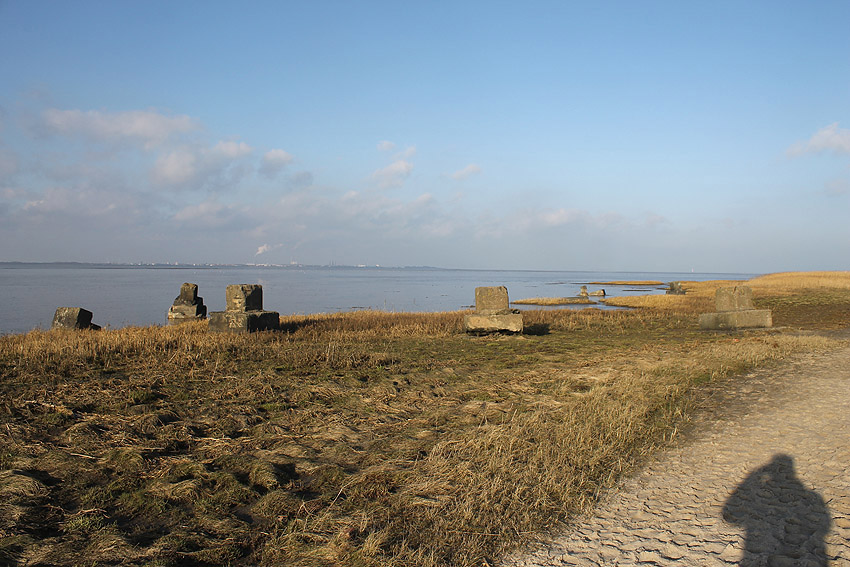 Vermuteter Scheinwerferstandrest (Stand 12) bei Dangast: Ein Stück weiter östlich der ehemaligen schweren Flakstellung Dangast befindet sich dieses massive Betontrümmerstück auf einer Weide am Deich. Der Scheinwerferstand 12 befand sich zunächst direkt an der Flakbatterie auf dem Deich in Dangast. Im Buch "Die Luftverteidigung im Abschnitt Wilhelmshaven 1939-1945 (2. Marineflakbrigade)" von Friedrich August Greve ist jedoch in der Skizze im Buchdeckel der Scheinwerferstand 12 genau hier eingezeichnet, wo sich das Betonrelikt befindet. Es dürfte wohl wahrscheinlich sein, dass der Stand in späteren Kriegsjahren hierhin auf einen verbunkerten Sockel versetzt wurde. Das Objekt wurde nach dem Krieg gesprengt und größtenteils abgetragen. Auch befindet sich das ehemalige Infanteriewerk Wehgast unweit südwestlich des Objektes. Besteht hier ein Zusammenhang? Im kleinen Dreieckswäldchen westlich des Trümmerstückes sind zudem Fundamentreste zu sehen... Danke an Jan Ellerbrock für das Fotomaterial! Hier