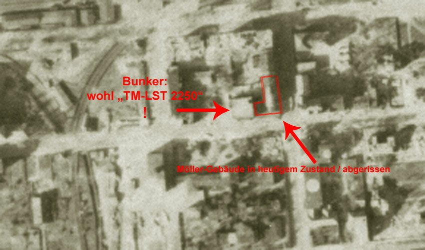 Bauunternehmen Hermann Möller / diverse Wilhelmshavener Bunker wurden durch diese Firma errichtet - eventuell auch der nahe OP-Bunker an der heutigen Virchowstraße unten im Hintergrund (gerade im Überbau). Das heutige Wohnhaus Rheinstraße 114, ein Bunker der Reichsbahn nahe gegenüber, wurde von Möller für die Reichsbahn errichtet. Man hat hier die Baufortschritte seines Projektes sozusagen aus dem eigenen Bürofenster mit verfolgen können... Abgerissen wird seit heute das alte Gebäude vom ehemaligen Bauunternehmen Hermann Möller an der Virchowstraße Ecke Rheinstraße (Rheinstraße 75 / Virchowstraße 8). Zuvor wurde bereits das ehemalige C&A-Kaufhaus planiert. Hier soll ein neues Verkaufszentrum entstehen: "Wilhelm's Outlet". Das Bauunternehmen Möller koordinierte Bunkerbauvorhaben und entwarf auch viele der Bunker in Wilhelmshaven im WK 2. Die Aktivitäten reichten hier bis in diverse andere norddeutsche Städte. Unter anderem war man auch beim U-Bootbunkerbau beteiligt. Das historische Hermann-Möller-Tor von 1934 wurde bereits gesichert und wird im Neubau ausgestellt, ebenso der historische Mauerstein mit Gründungsdatum 1934. Er wird in die neue Fassade eingearbeitet. Mit dem Gebäude verschwindet auch der Luftschutzkeller im Inneren. Mehr Bilder auf unserer Facebookseite: Luftschutzbunker in Wilhelmshaven Zur Info: Das Möller-Gebäude ist entgegen anders lautender Meldungen durchaus in den 1930er Jahren erbaut worden und KEIN Nachkriegsgebäude. Zerbombt wurde ein nördlicher Teilbereich an der heutigen Virchowstraße (obere Geschosse). Nach dem Krieg wurde hier neu gebaut (später auch durch C&A). Auf das Dach des den Krieg überstandenen Eckgebäudes Rhein-Virchowstraße wurde später ein Aufbau gesetzt. Das Eckgebäude selbst ist wie geschrieben ein Vorkriegsbauwerk (gewesen).