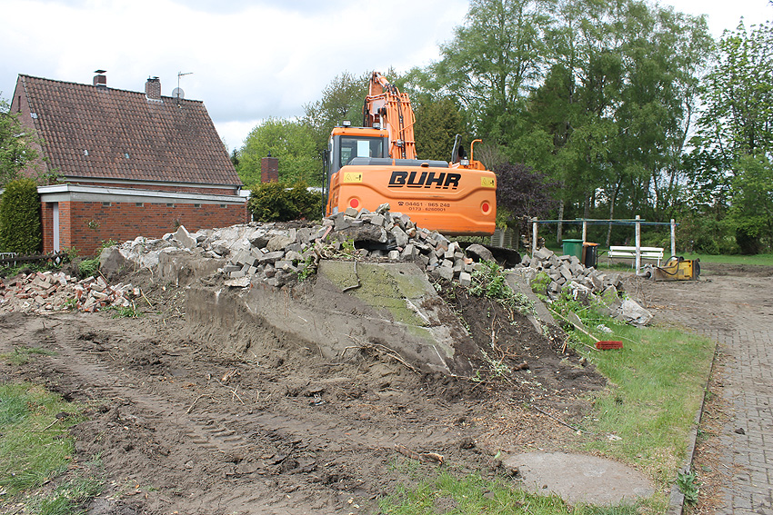 Betonierter L-Form-Deckungsgraben Am Tief 2 / Verbindungsstraße 20 in Middelsfähr: Der Graben wurde in diesen Tagen Ende April bis Anfang Mai 2020 über Erdgleiche abgerissen. Interessant: Die nahe Anlage Lindenstraße besteht lediglich im ersten Grabenabschnitt. Der hintere abgeknickte "L-Bereich" wurde für die nachkriegszeitige rückwärtige Erweiterung des anliegenden Wohnhauses beseitigt. Auch der Eingangsvorbau wurde entfernt (für eine Garageneinfahrt). Die Anlagen gehören einer Serie mit zwei Deckungsgräben in Heidmühle und einem in Moorwarfen an. Eine "verdoppelte" Version in Zickzackform existiert noch heute in Middelsfähr, eine weitere Anlage gab es in Sande. Vielen Dank an unseren Leser für den freundlichen Tipp und die netten Anwohner für die Fotografiererlaubnis! Über Erdgleiche ist sämtliche Baustruktur innerhalb weniger Tage entfernt worden (wohl am 28.04./29.04./30.04./04.05./05.05./06.05). Die unteren Wandbereiche (beginnend etwa 20 cm unter Erdoberfläche) und der Sockel sind erhalten geblieben. Ein Neubau mit Tiefgründung wird hier nicht geplant sein.