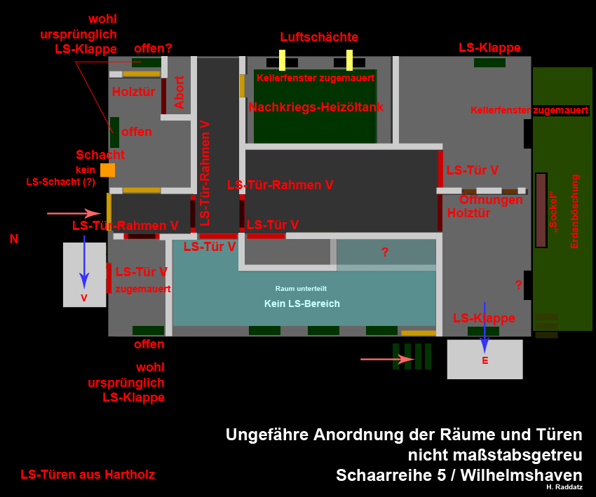 Aktuelles zum LS-Keller Schaarreihe 5: Es handelt sich bei der Erdaufschüttung um keine Überdeckung eines Splitterschutzbauwerkes. Der Luftschutzkeller verfügte an der Nordseite nahe der Westecke über einen Splitterschutzeingang. Dieser ist noch heute überbaut mit einem Nachkriegs-Treppenhausanbau vorhanden. Ein zweiter Schutzvorbau befand sich vorm Notausstieg an der Westwand nahe der Südecke. Dieses 1928 erbaute Ärztehaus wurde um 1935 mit einem umfangreich bestückten LS-Keller versehen. Hier fanden höchstwahrscheinlich im Krieg auch diverse Anwohner der Schaarreihe Schutz. Eventuell befand sich im Keller zudem eine Verwundetensammelstelle im Zusammenhang mit dem Ärztehaus. Heute konnten wir die Anlage besichtigen. Unser herzlicher Dank an die freundlichen Anwohner für die Begehungsermöglichung. Hier Interessant: Unmittelbar südlich des Gebäudes befand sich das bekannte Café Hillmers.