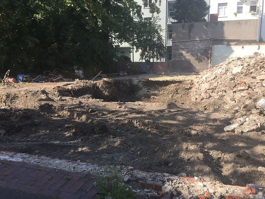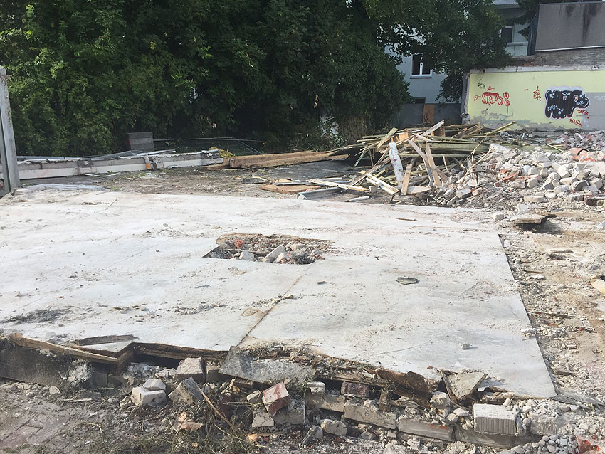 Abgerissene Garagenbebauung und Gebäude der ehemaligen Druckerei Wallner: Die LS-Kellerdecke des Gebäudes mitsamt Wandbereichen wurde beseitigt. Der LS-Keller existiert somit nicht mehr... Der anliegende Rundbunker ist weiterhin (noch...) unangetastet. Wir berichten bei jeder Entwicklung weiter. Hier Aktuellste Bilder vom 01.09.23