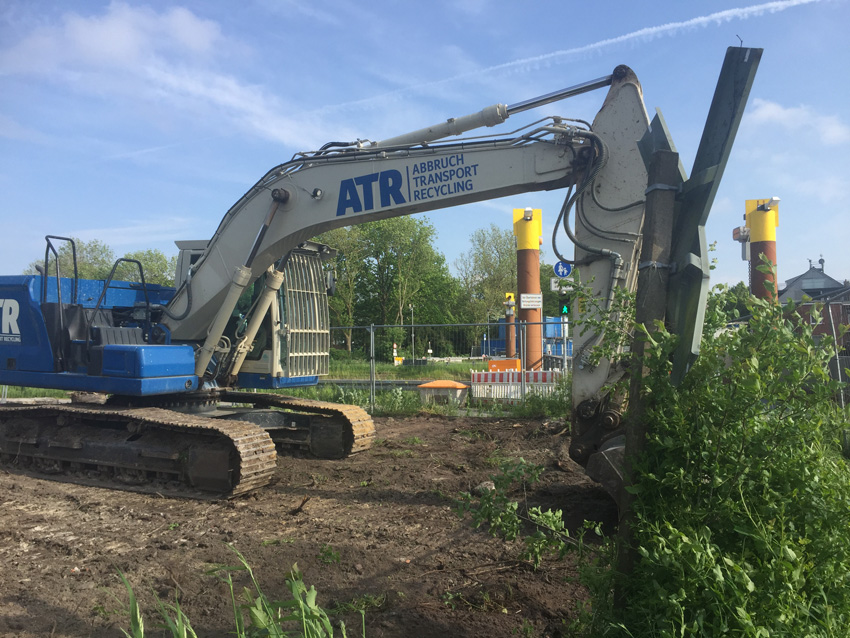 Bunker Am Handelshafen / bei Deichstraße 1: Stillstand. Seit Austritt der "seltsamen Flüssigkeit" in den ehemaligen Bunkerinnenraum vorgestern ruht nun die weitere Abrisstätigkeit der Unterbereiche des Bunkers...