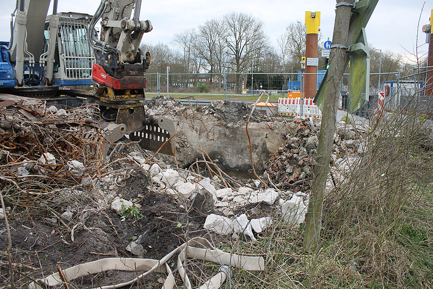 Bunker Am Handelshafen / bei Deichstraße 1: Der kleine Bunker wurde am Mittwochvormittag, 8. März 2023, innerhalb von nicht einmal zwei Stunden im oberirdischen Bereich gänzlich abgerissen. Dabei trat der mit Wasser gefüllte Innenraum ans Licht. Der Wasserstand stieg durch hineinfallende Trümmer. - Erhöhte sich später aber weiter merklich. An der Westwand trat im ehemals kleinen Nebeninnenraum eine Leitung ans Tageslicht. Am 9. März füllte sich der Innenraum, der mittlerweile von diversen Trümmern geräumt war, weiter. - Diesmal mit einer schwarzen Flüssigkeit, wohl ölbelastet, aus den höchstwahrscheinlich vorhandenen Leitungen zum Bunkerpumpwerk an der Deichbrücke nach Osten hin. Die (Nachkriegs...) Vermauerungen eben wohl dieser Leitungen wurden durch die Abrisstätigkeiten zerstört, so dass hier wohl nun eine Wasser-Maschinenölmischung hineinlief... Vorsicht ist diesbezüglich umweltschutztechnisch geboten: Eine weitere Verbindung vom (ehemaligen) Bunkerbereich befindet sich an der Südseite zum Hafen hin. So etwas passiert, wenn sich Verantwortliche vorher nicht richtig informieren. Der Abriss geschah ohne Vorankündigung. Damit ist wieder ein Stück Geschichte Wilhelmshavens verschwunden.
