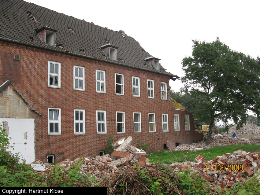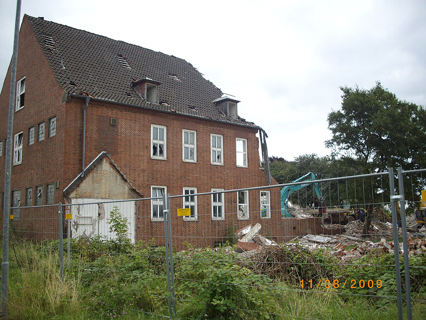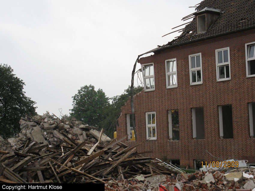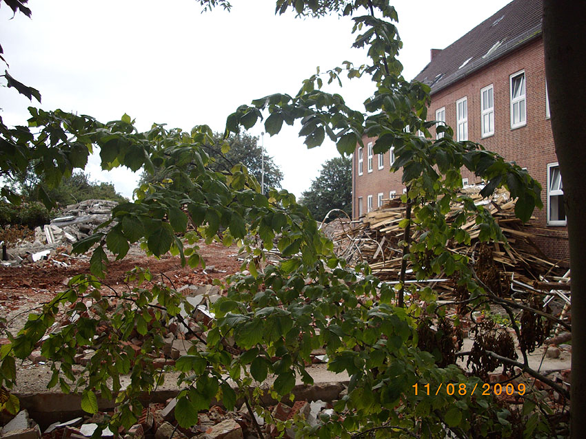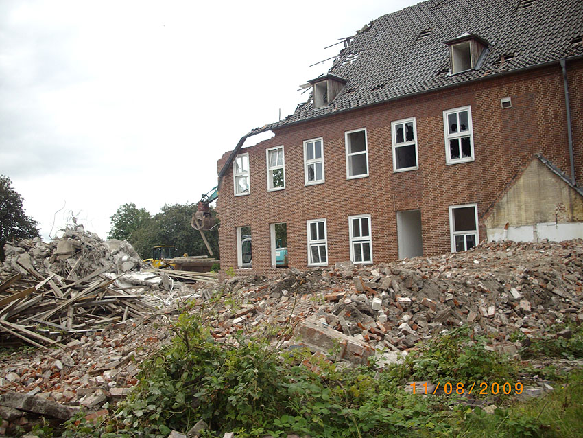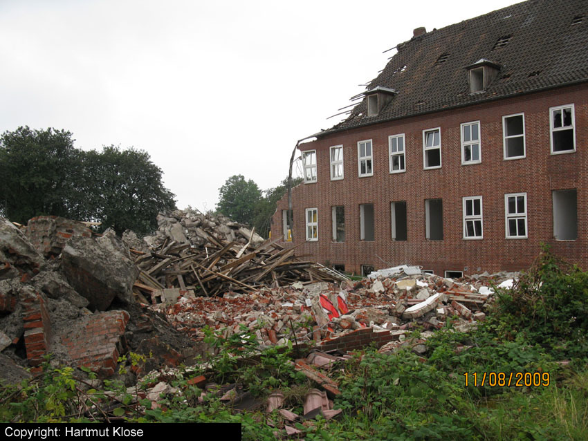 Banter Kaserne / übernächst östliches Gebäude der ehemaligen Kirche gänzlich entfernt / Hauptgebäude östlich des Biosphere-Instituts zu zwei Dritteln abgerissen / Kleinbau im Ostbereich längs der Emsstraße wird abgerissen / 11.08.09