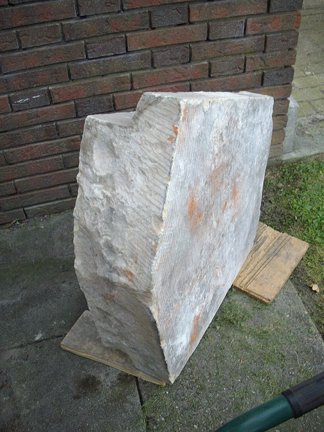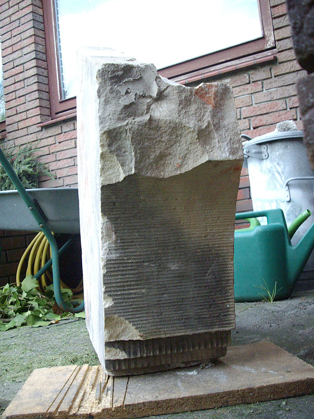 Der Stein wird sich wieder angleichen: Mit der Zeit werden die hässlichen Spuren seines Herabfallens während des Gebäudeabrisses abgewaschen werden und verblassen. Die sonstigen Abplatzungen sind als Folge der Geschichte des Steines zu betrachten.