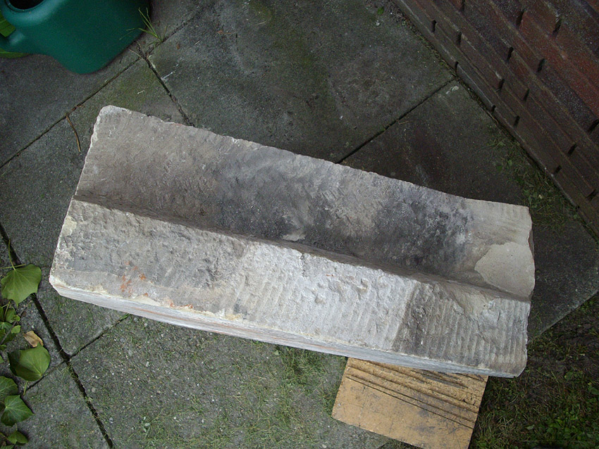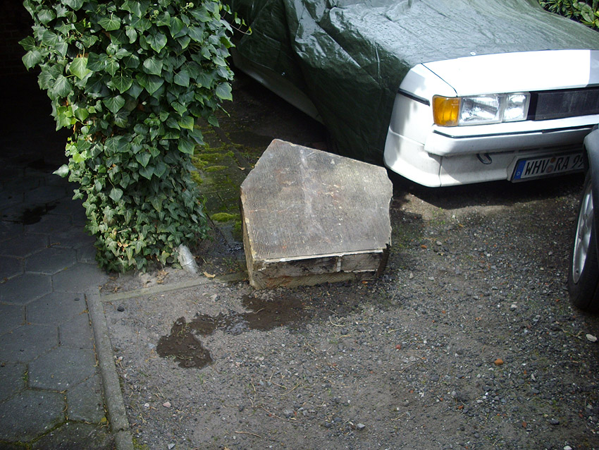 Nachtrag 28.05.14: Der Giebelstein, hier ersichtlich nahe des Splitterschutzunterstandes "Alaska", wurde später im Unterstand gelagert. Leider ist er 2013 oder bis Mai 2014 entwendet worden. Eine Suche blieb ergebnislos. Unser zweiter Giebelstein in Schortens ist weiter vor Ort existent und gesichert verwahrt.