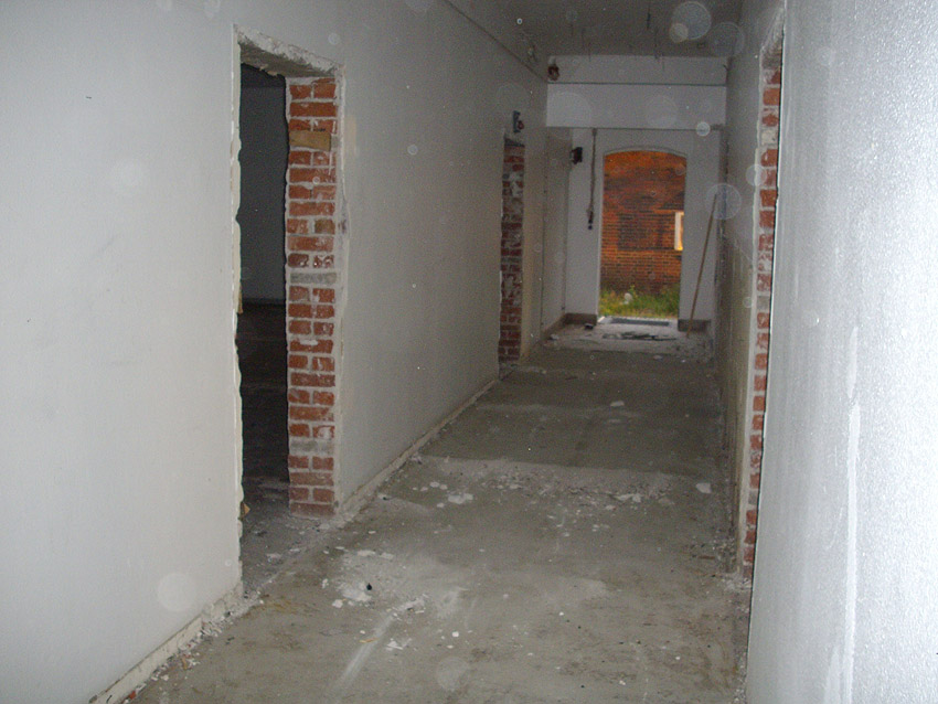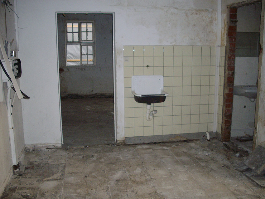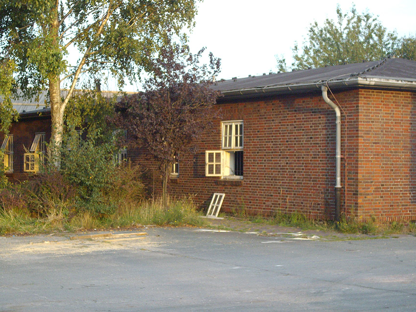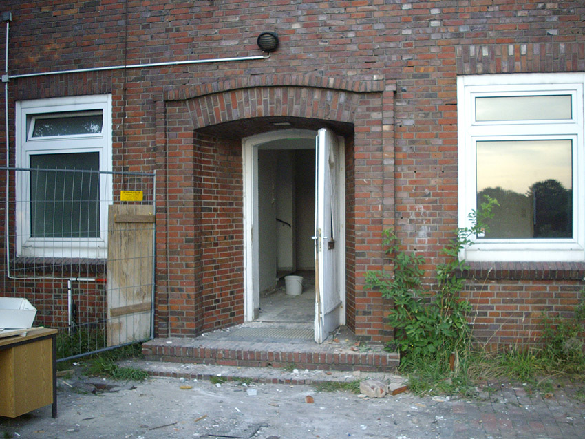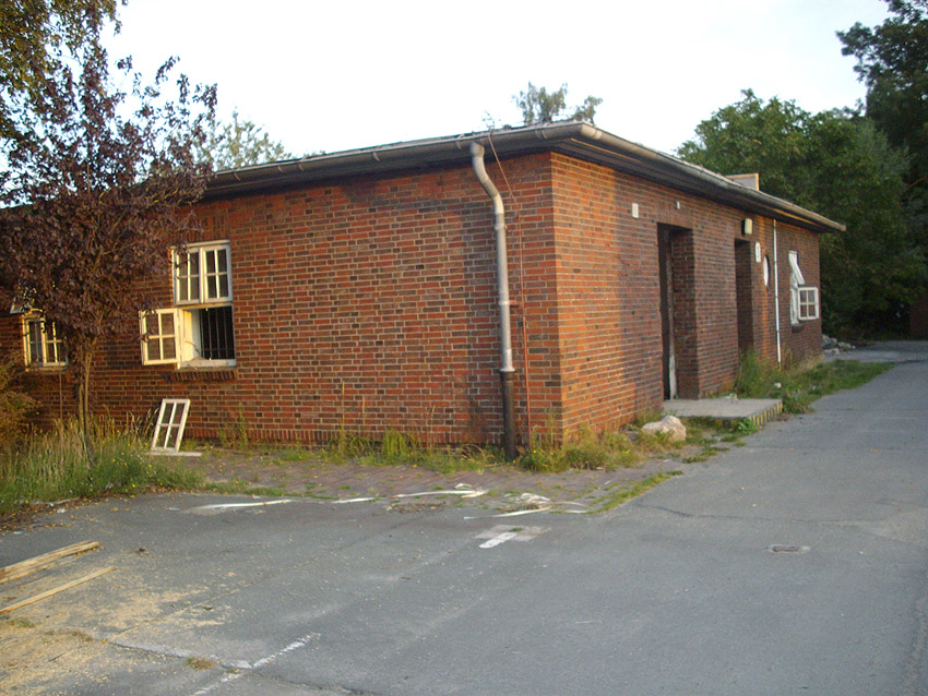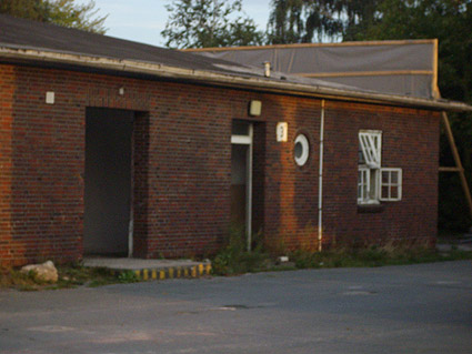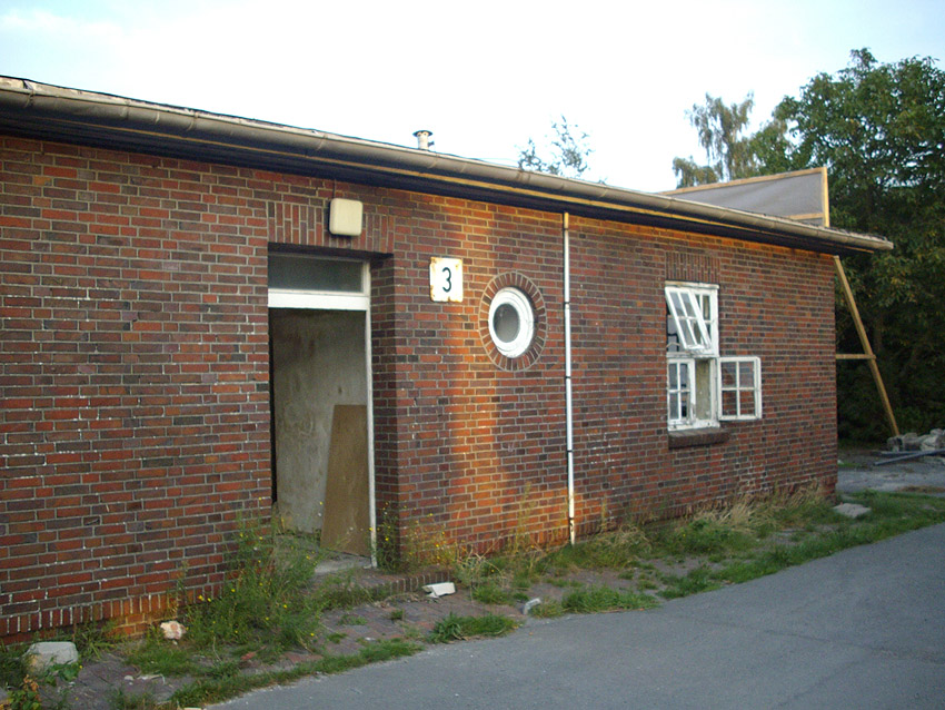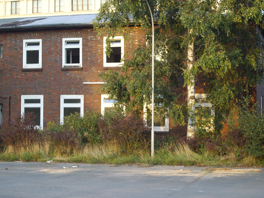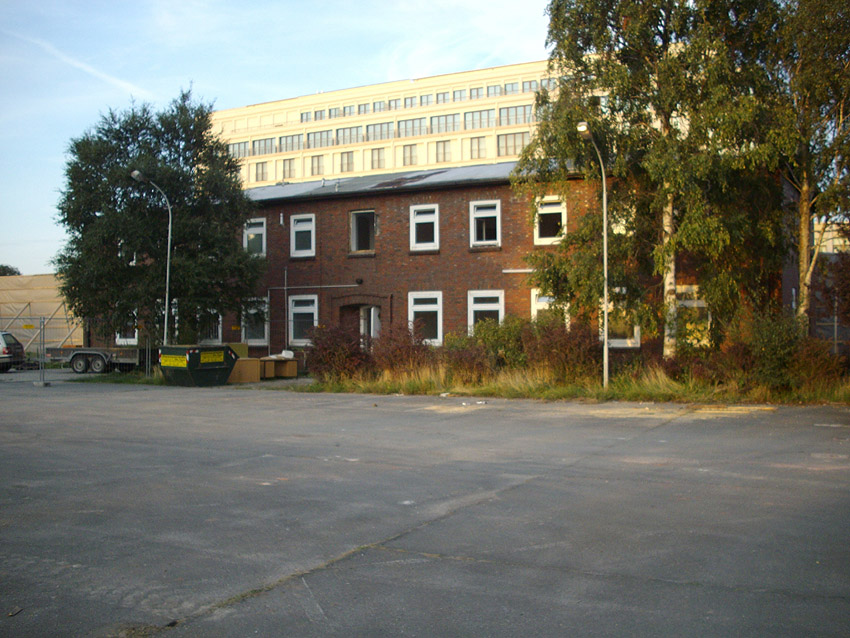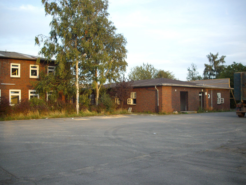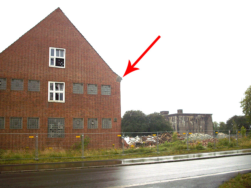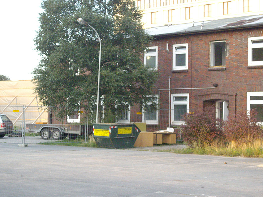 Banter Kaserne / letzte Aufnahmen der beiden Gebäude östlich des T 750 1 Banter Ruine vor dem Abriss / die beiden Sandsteinblenden an der Giebelsüdseite des Hauptgebäudes östlich des Biosphere-Instituts konnten geborgen werden / 19.08.09