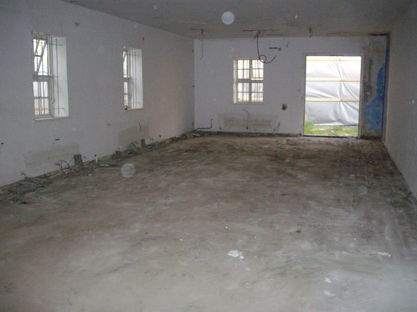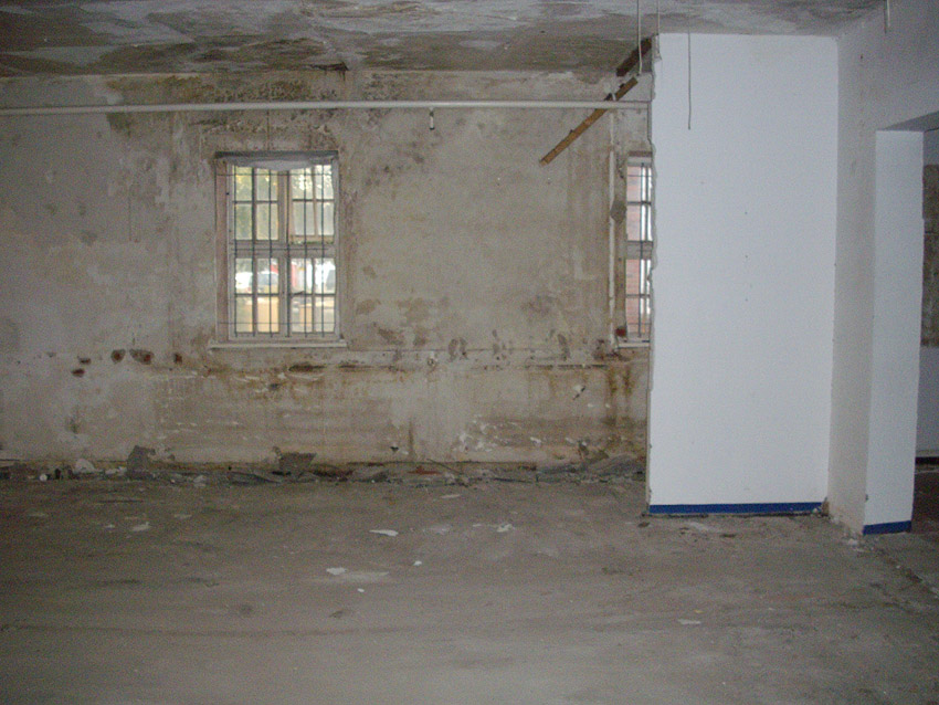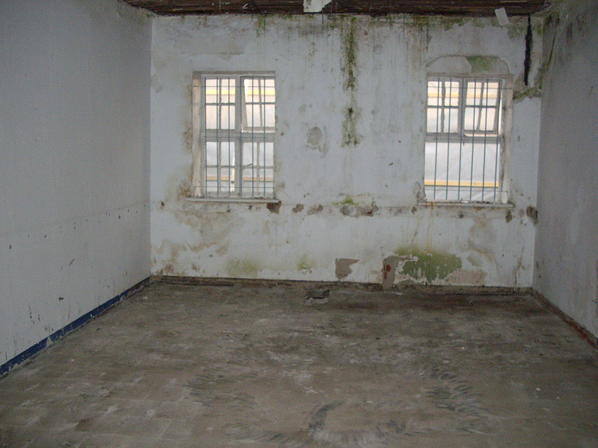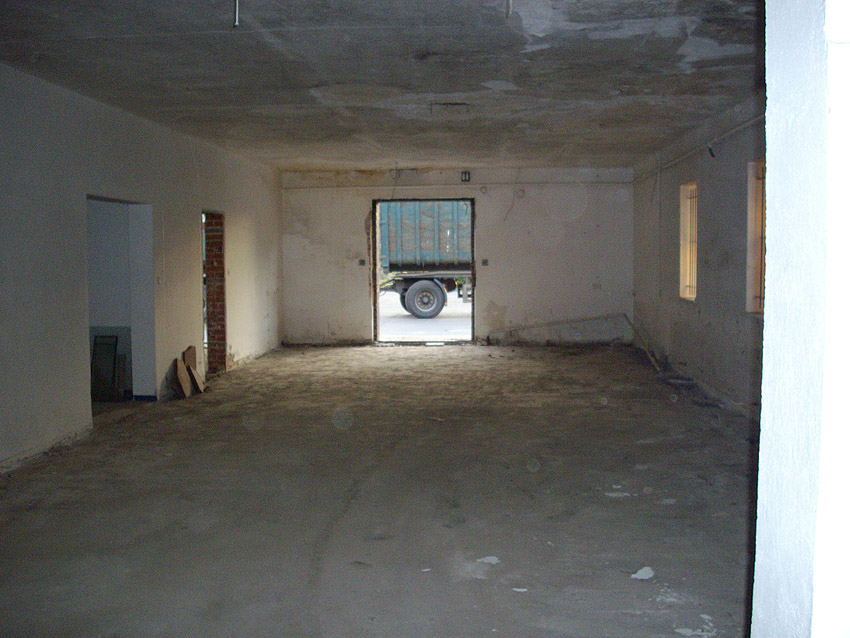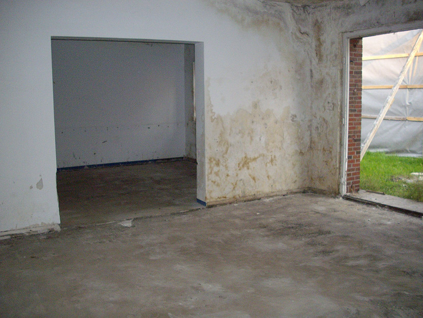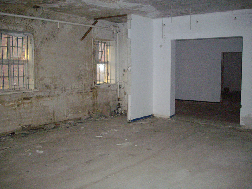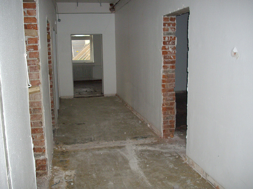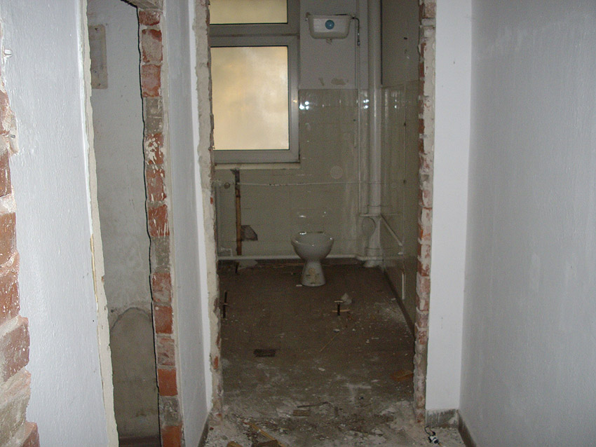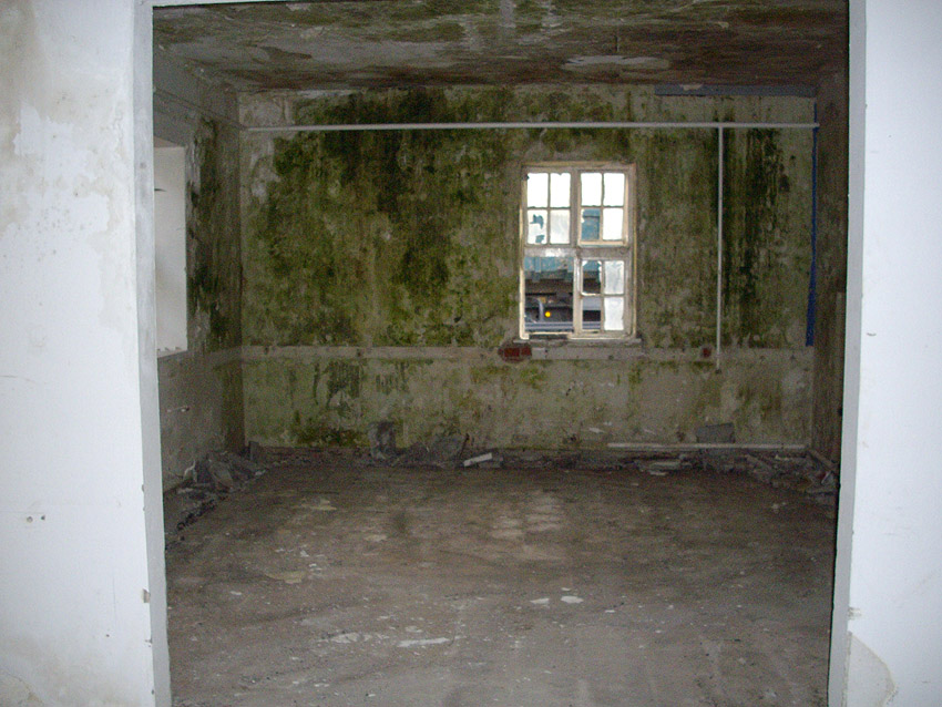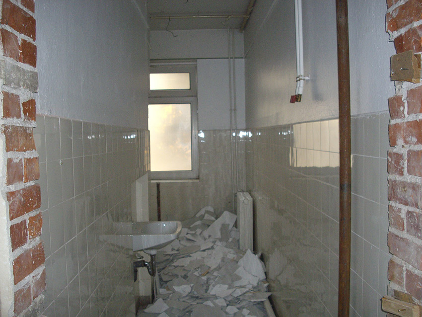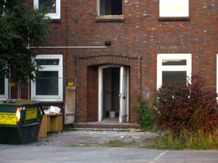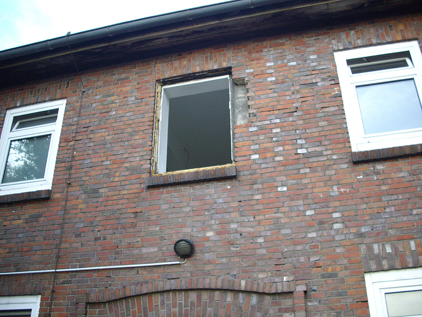 Banter Kaserne / letzte Aufnahmen der beiden Gebäude östlich des T 750 1 Banter Ruine vor dem Abriss / die beiden Sandsteinblenden an der Giebelsüdseite des Hauptgebäudes östlich des Biosphere-Instituts konnten geborgen werden / 19.08.09