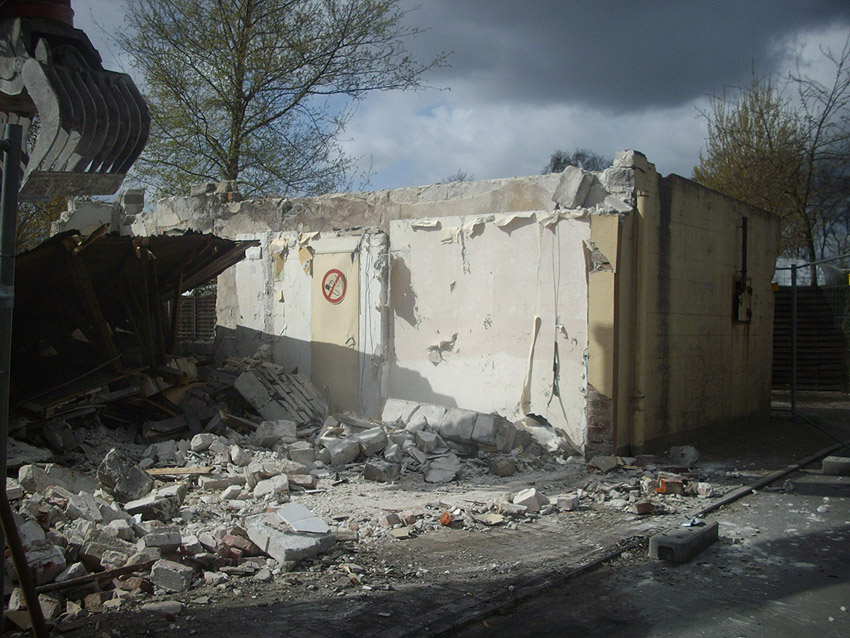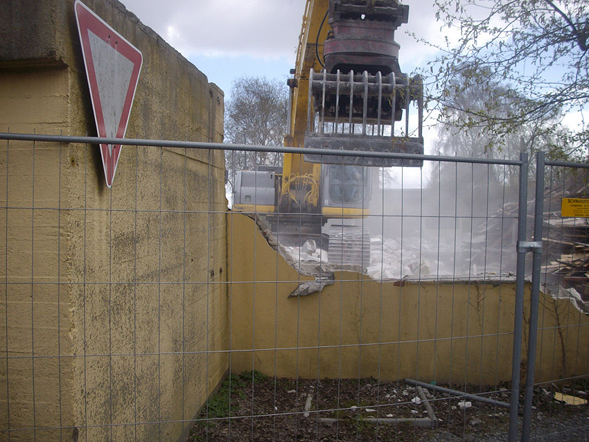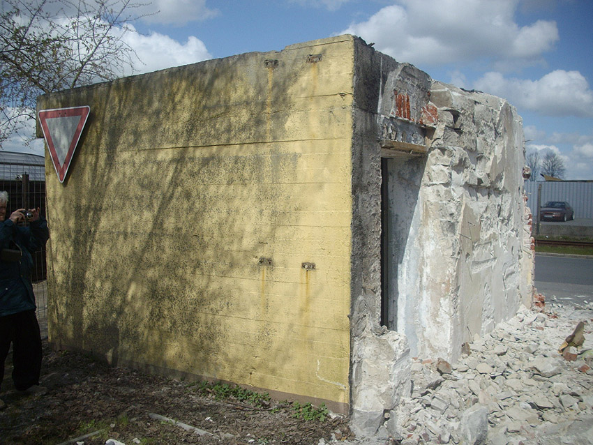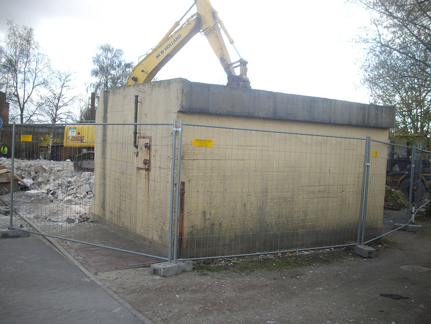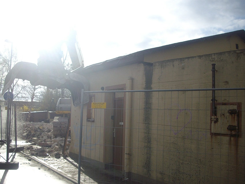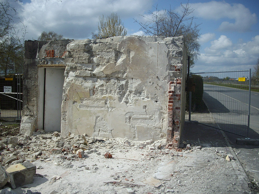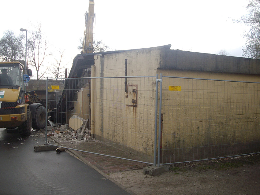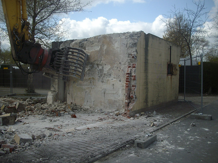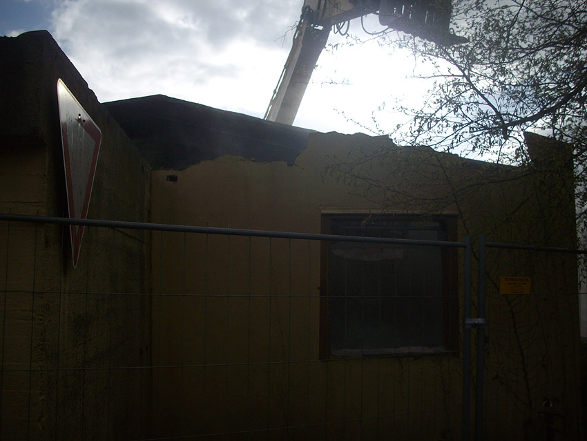 22.04.10: Das Gebäude wurde heute komplett entfernt. Der Bunker ist noch nicht zerstört (aufgrund einer noch nicht angelieferten Spezialabbruchzange). Das Bauwerk steht nun allein. Sein Abriss ist jedoch bereits für morgen, Freitag, 23.04.10 oder Montag, 26.04.10 angesetzt. Noch einmal konnten Innenaufnahmen des Bunkers gemacht werden.