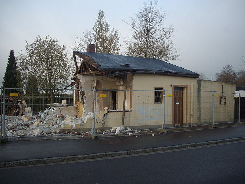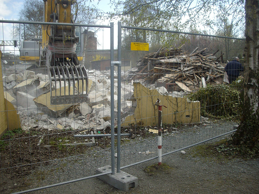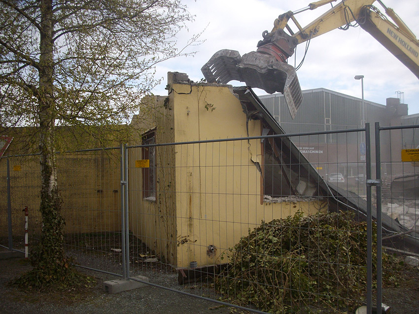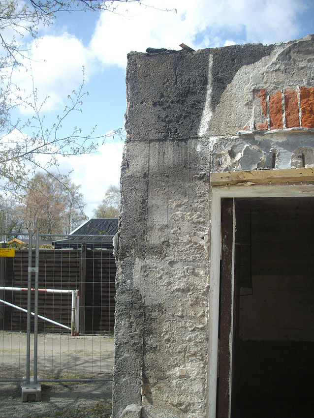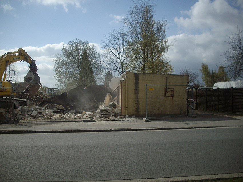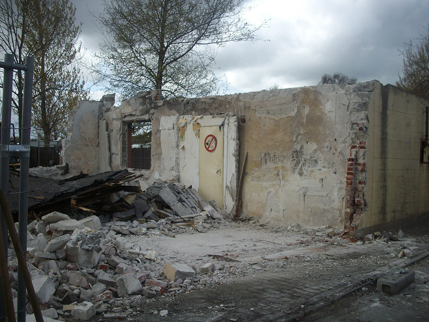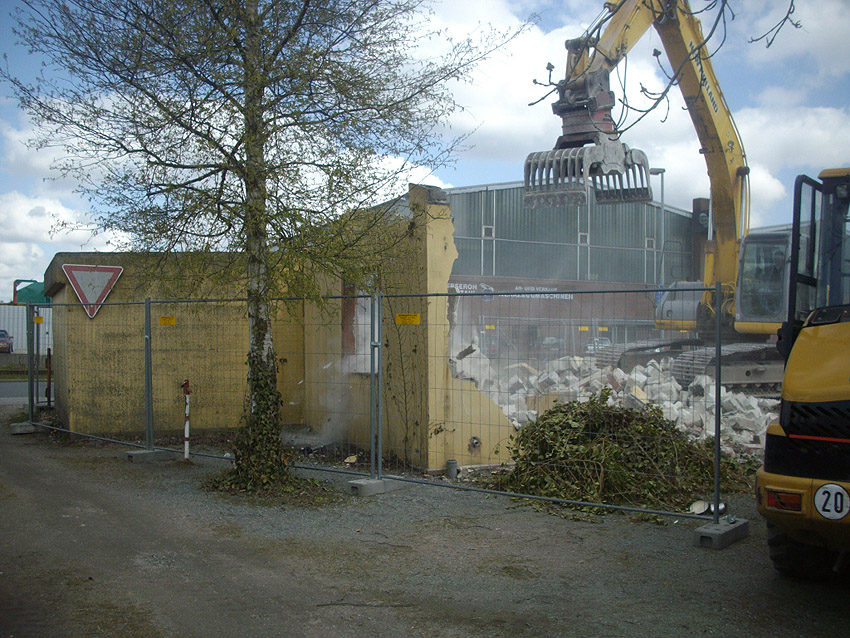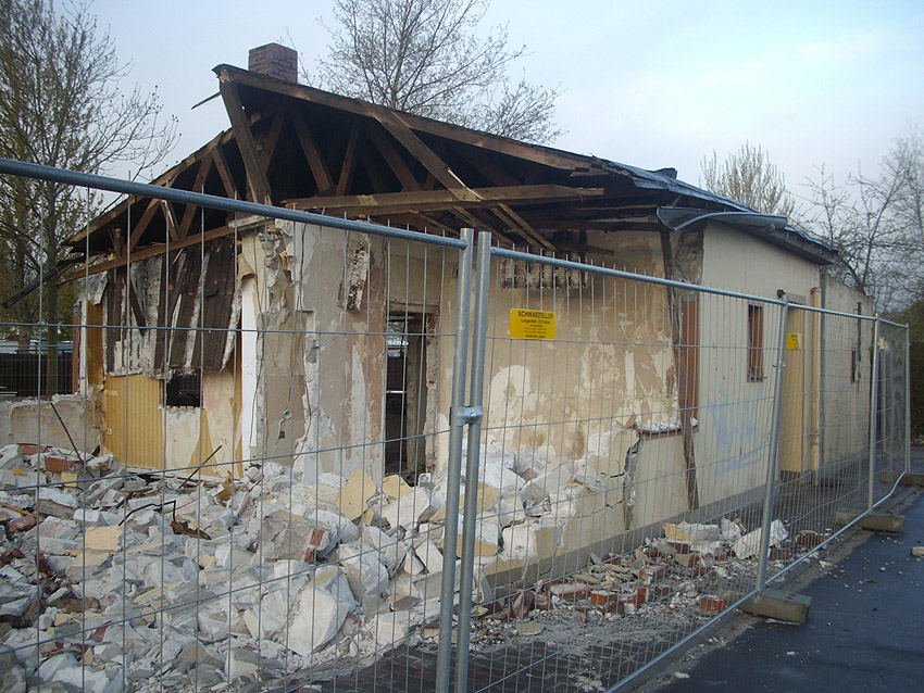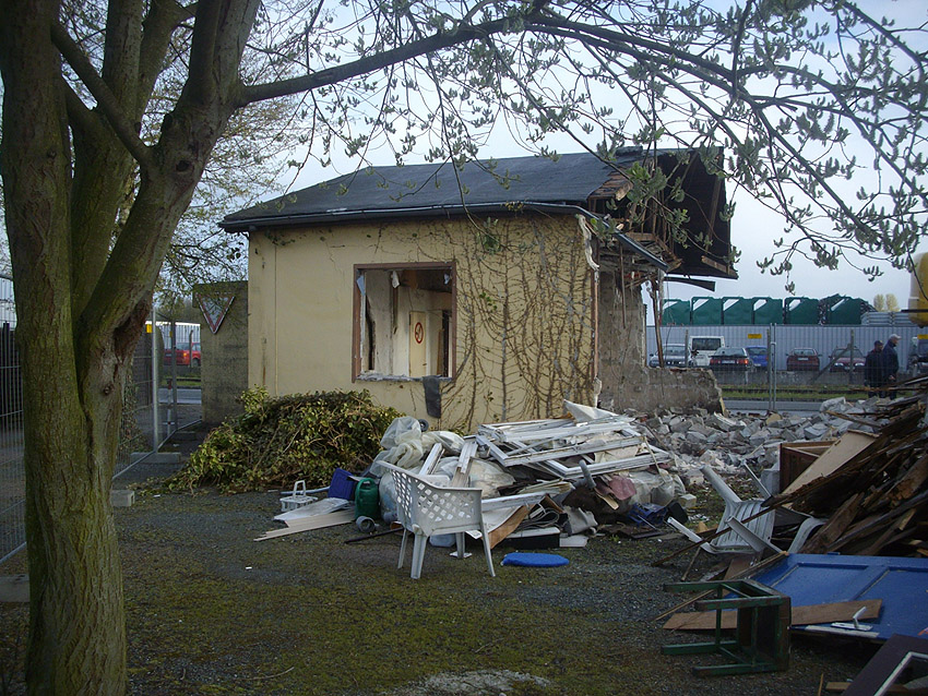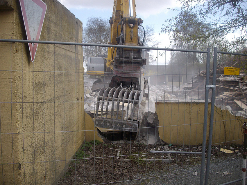 22.04.10: Das Gebäude wurde heute komplett entfernt. Der Bunker ist noch nicht zerstört (aufgrund einer noch nicht angelieferten Spezialabbruchzange). Das Bauwerk steht nun allein. Sein Abriss ist jedoch bereits für morgen, Freitag, 23.04.10 oder Montag, 26.04.10 angesetzt. Noch einmal konnten Innenaufnahmen des Bunkers gemacht werden.