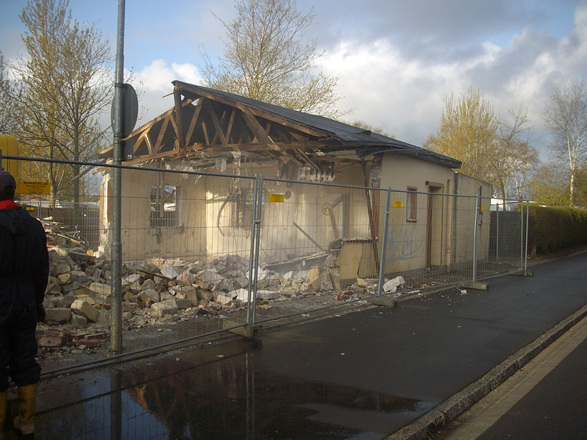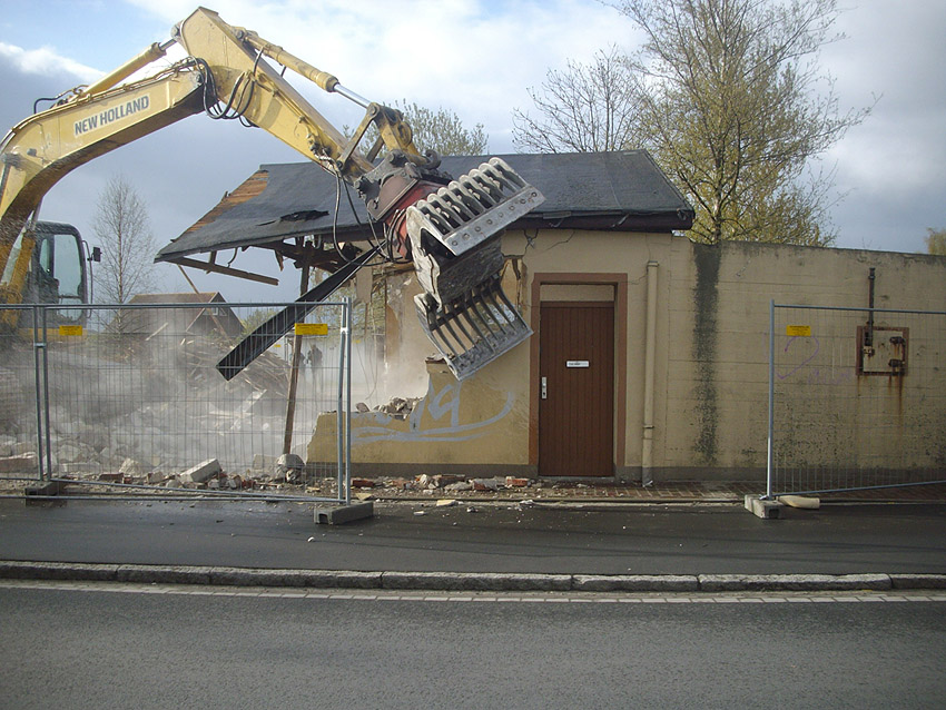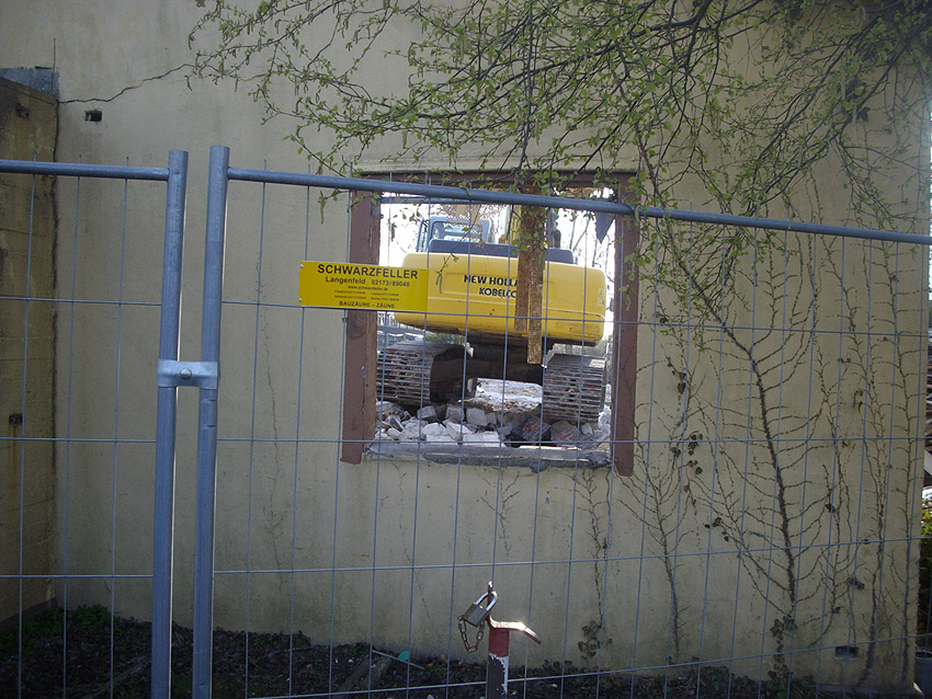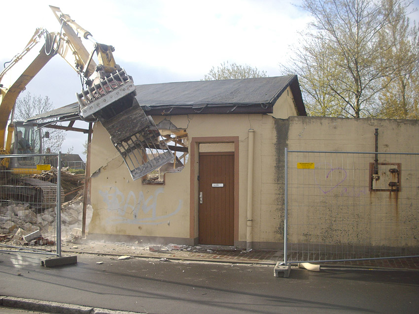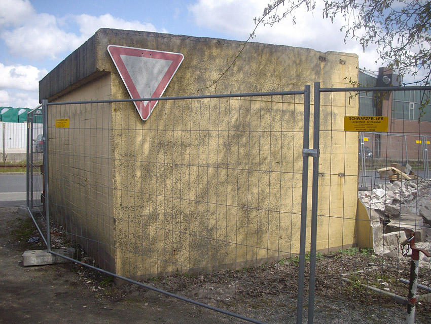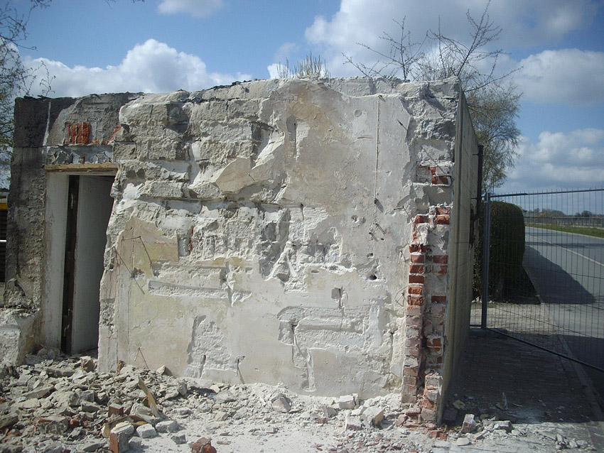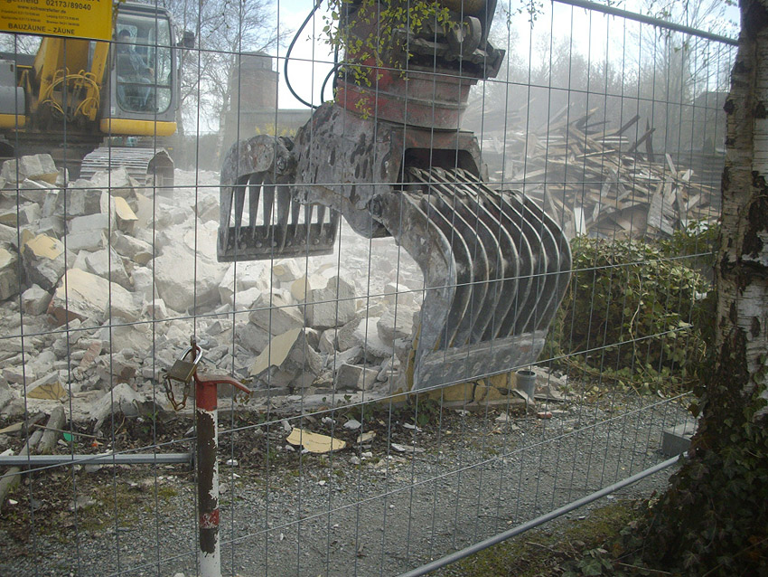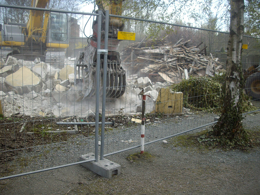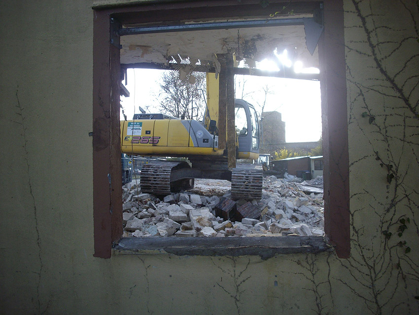 22.04.10: Das Gebäude wurde heute komplett entfernt. Der Bunker ist noch nicht zerstört (aufgrund einer noch nicht angelieferten Spezialabbruchzange). Das Bauwerk steht nun allein. Sein Abriss ist jedoch bereits für morgen, Freitag, 23.04.10 oder Montag, 26.04.10 angesetzt. Noch einmal konnten Innenaufnahmen des Bunkers gemacht werden.