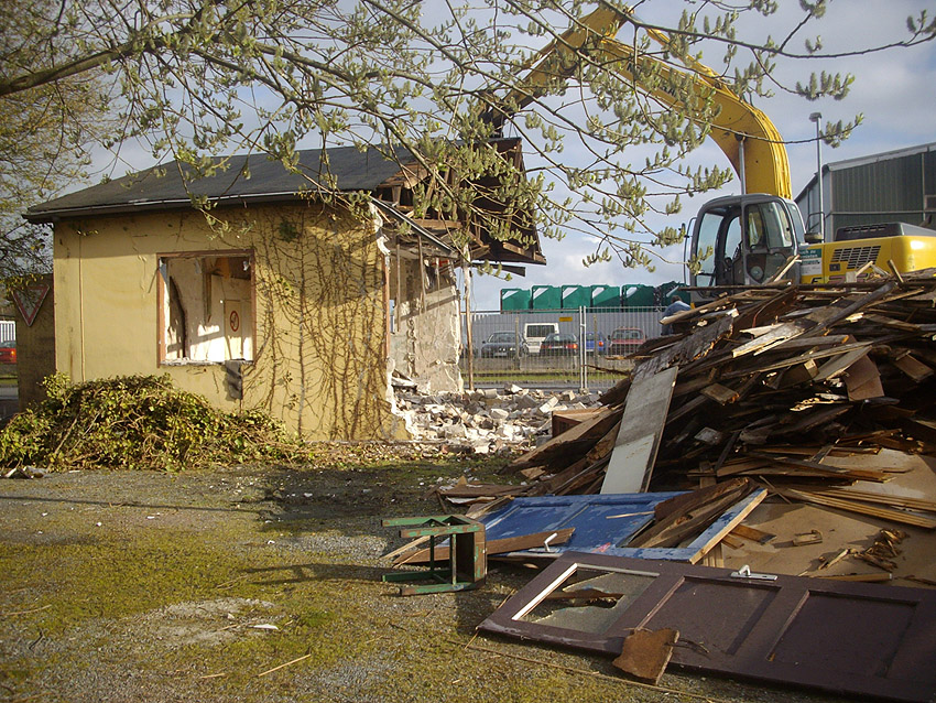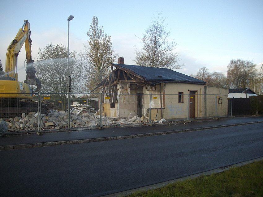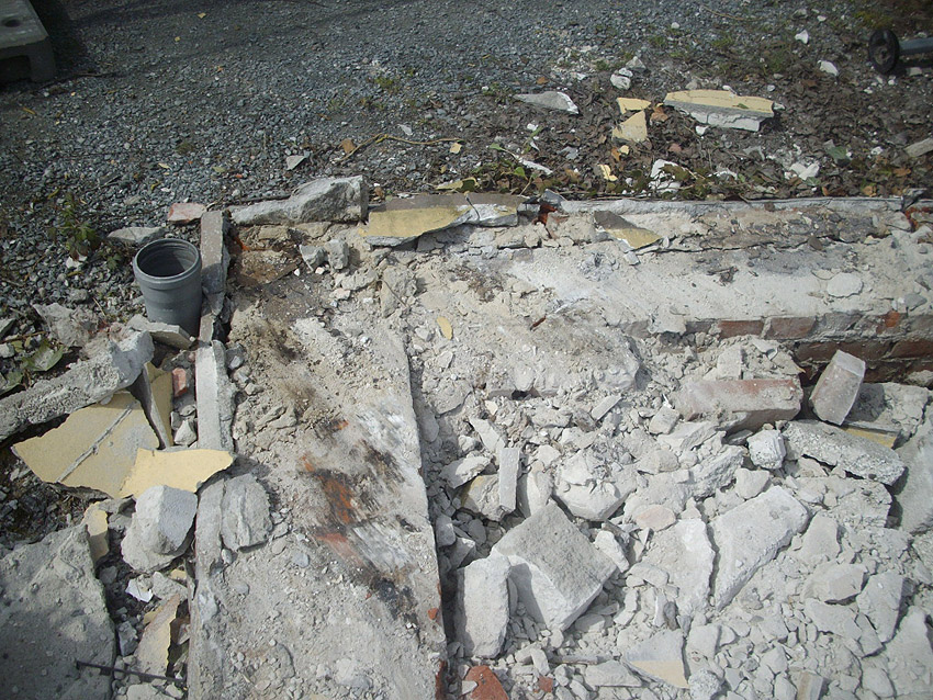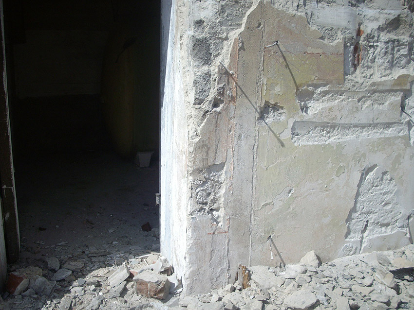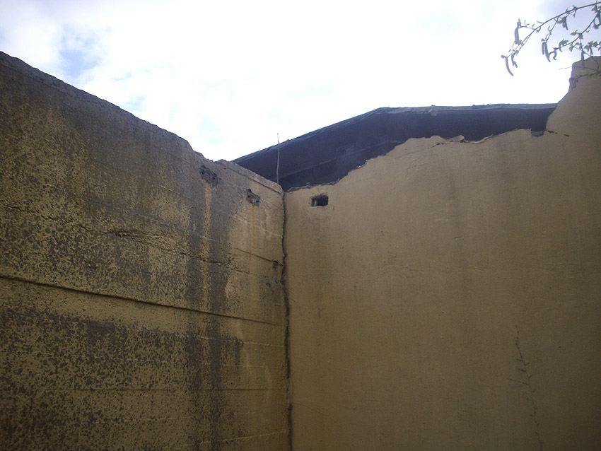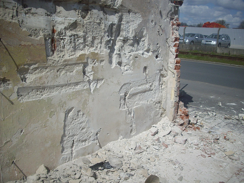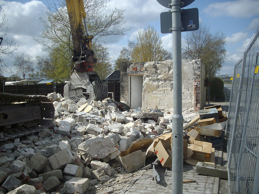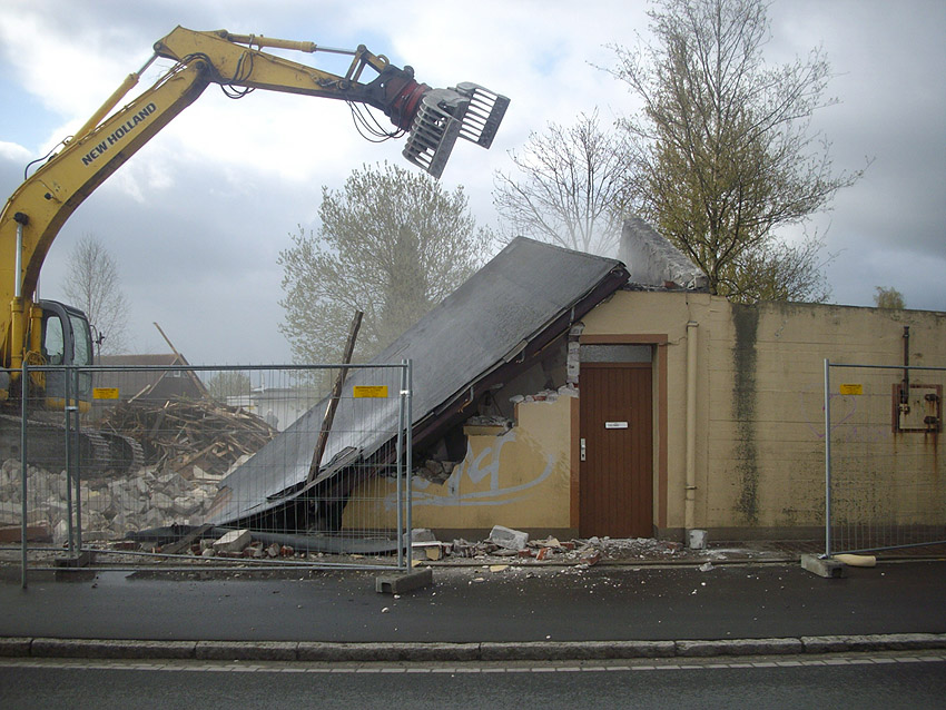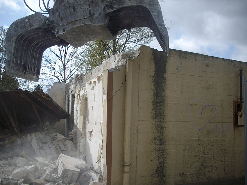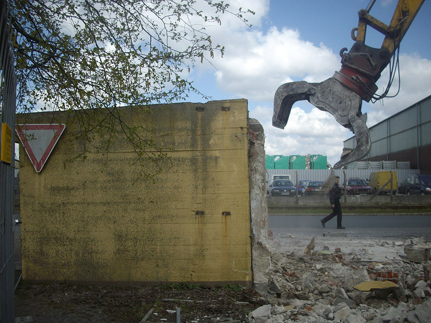 22.04.10: Das Gebäude wurde heute komplett entfernt. Der Bunker ist noch nicht zerstört (aufgrund einer noch nicht angelieferten Spezialabbruchzange). Das Bauwerk steht nun allein. Sein Abriss ist jedoch bereits für morgen, Freitag, 23.04.10 oder Montag, 26.04.10 angesetzt. Noch einmal konnten Innenaufnahmen des Bunkers gemacht werden.