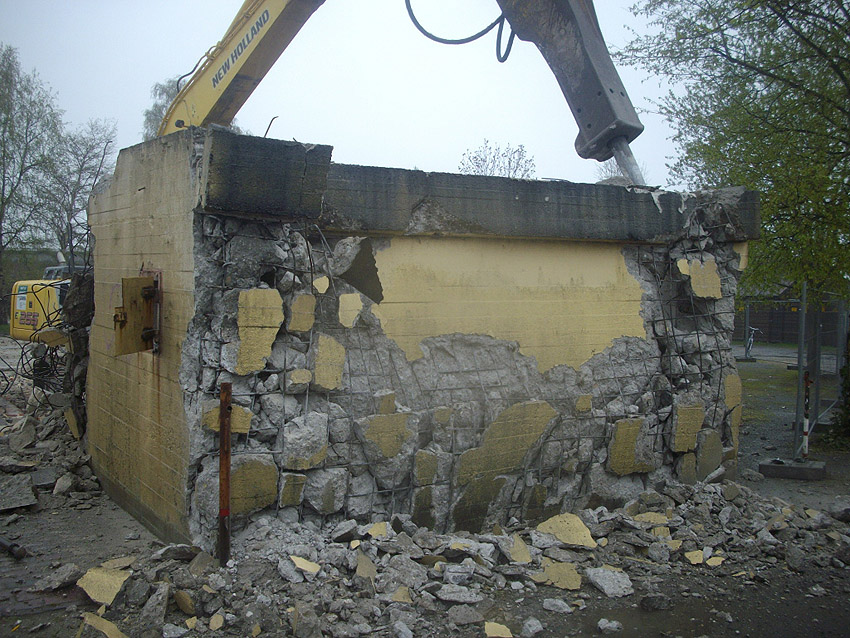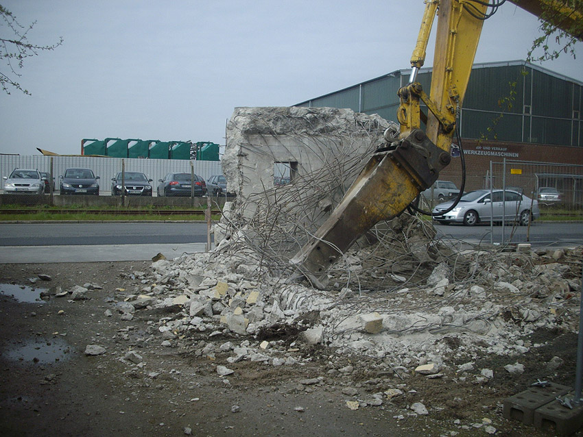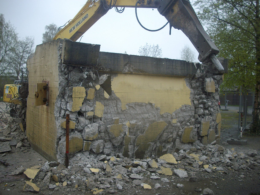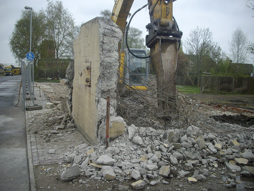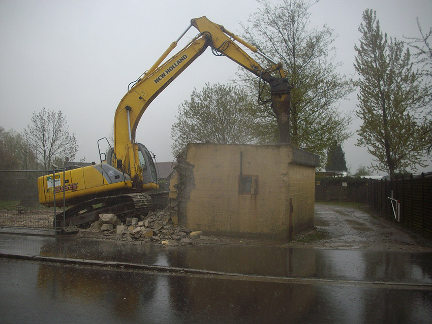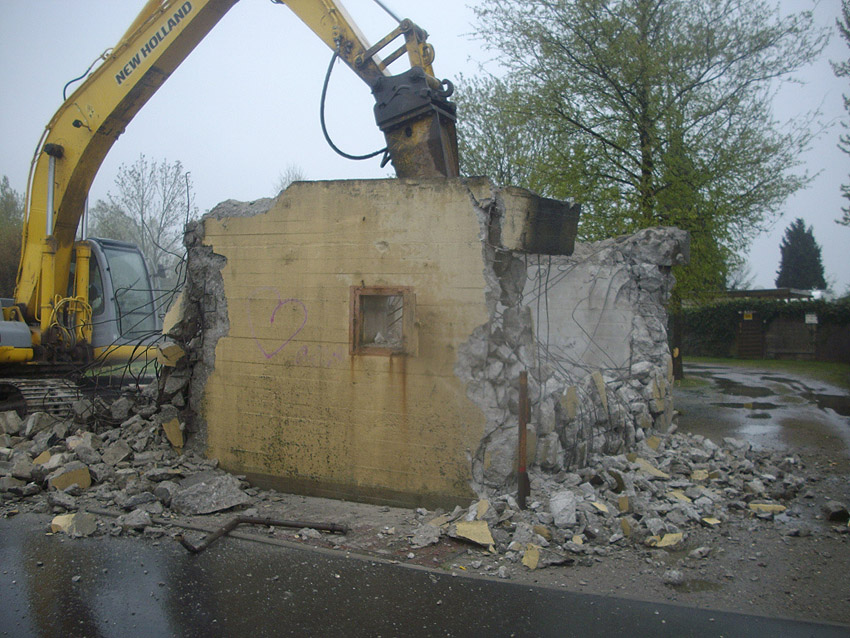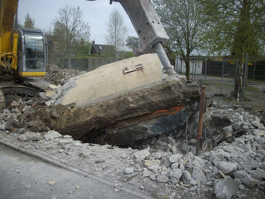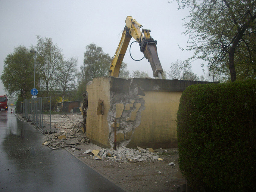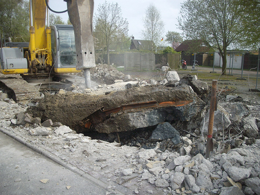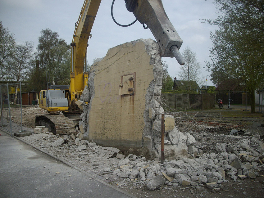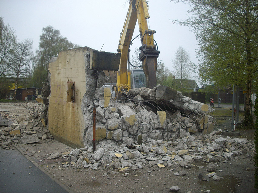 26.04.10: Wie erwartet wurde heute der Bunker abgerissen. Zwischen 13 und 17 Uhr erfolgte die Entfernung des Betonklotzes. Der Bunker erwies sich zäher als vermutet. Engmaschige Bewehrung trat sofort nach Abrissbeginn zum Vorschein. Sie verzögerte die Arbeiten erheblich. Der etwa 4,5 Meter lange, ungefähr 3,5 Meter breite und circa 3 Meter hohe Bunker mit 50 cm starken Wänden und Decke besaß zudem eine massive Fundamentplatte, die an den Kanten eine Tiefe von bis zu 80 cm aufwies. Zum Feierabend war vom Bunker jedoch nur noch ein Trümmerhaufen übrig. Trotz teilweise widrigster Witterungsbedingungen gelang es uns, einige interessante Bilder vom Abriss anzufertigen. Damit gehört auch dieses Bauwerk der Geschichte an. Die nächsten Tage werden noch einige Fotos von der Planierung des Geländes / Trümmerentfernung angefertigt. Aufgrund der 203 Bilddateien ist zum zügigen Betrachten eine DSL-Verbindung erforderlich!