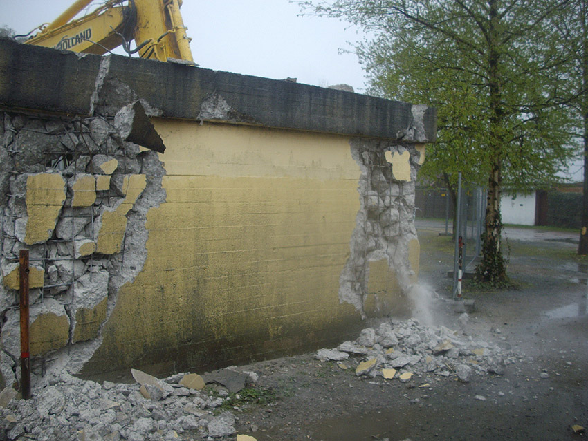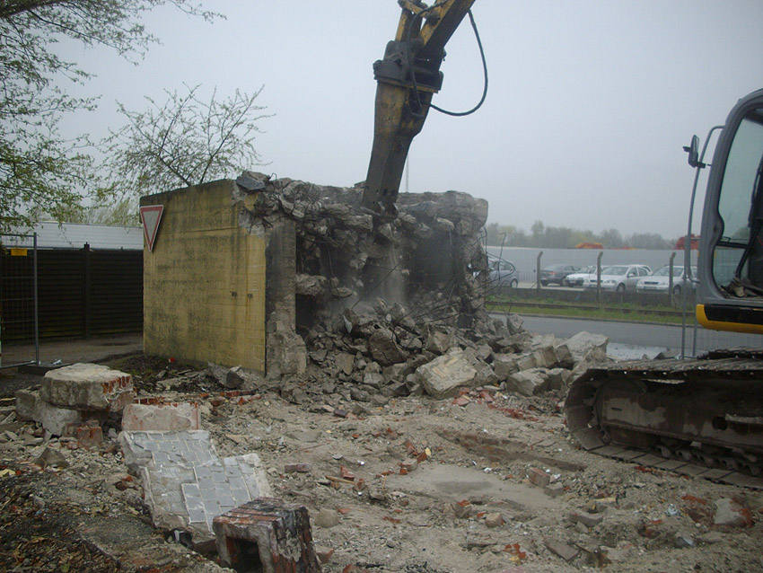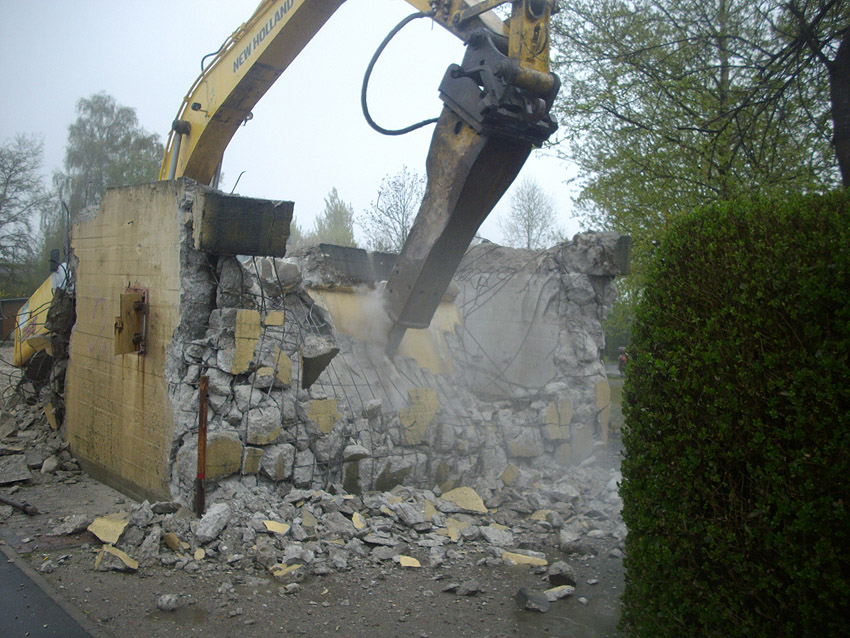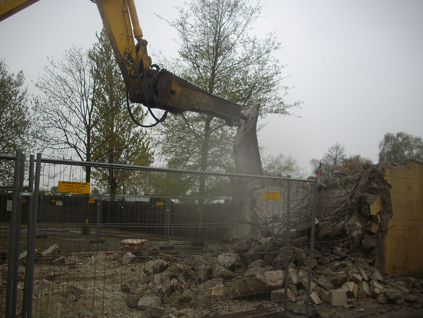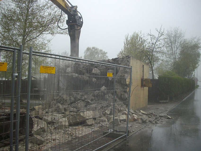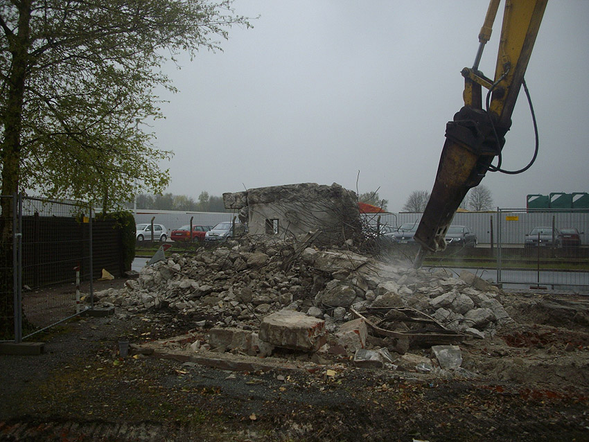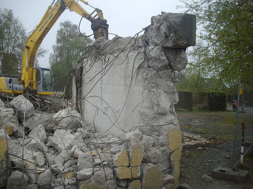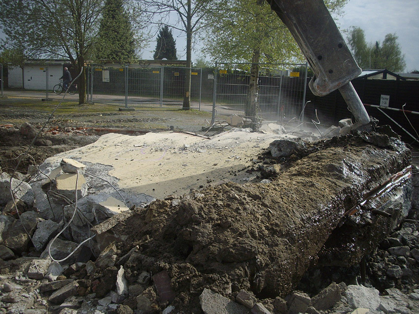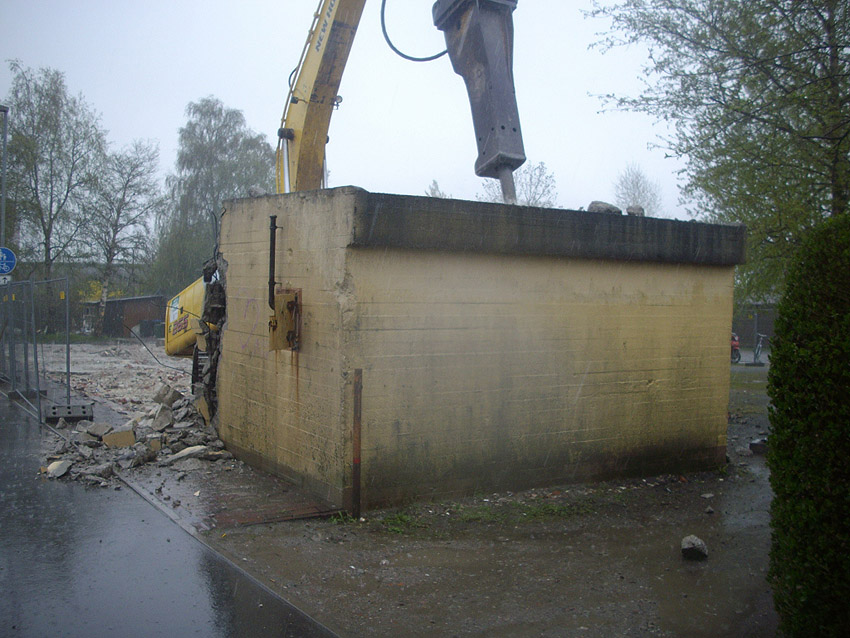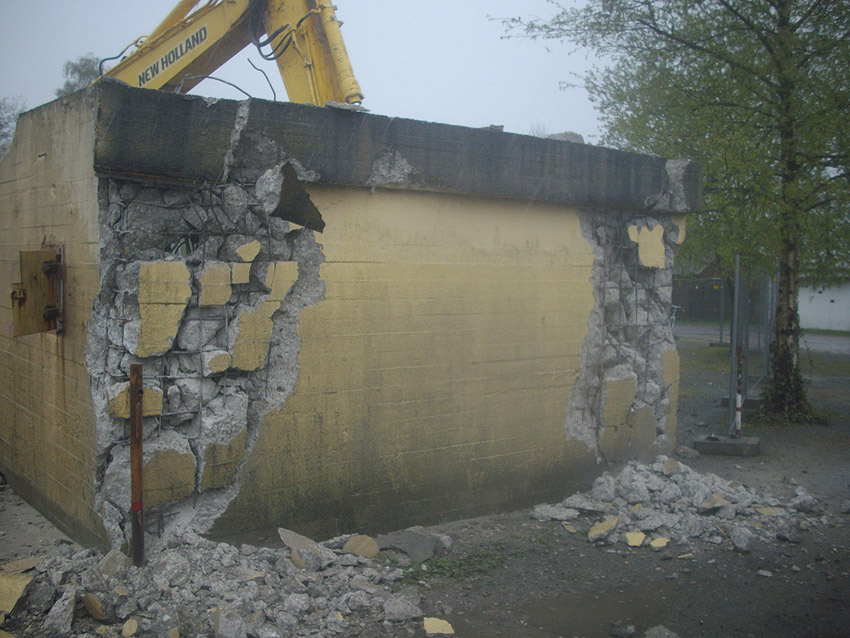 26.04.10: Wie erwartet wurde heute der Bunker abgerissen. Zwischen 13 und 17 Uhr erfolgte die Entfernung des Betonklotzes. Der Bunker erwies sich zäher als vermutet. Engmaschige Bewehrung trat sofort nach Abrissbeginn zum Vorschein. Sie verzögerte die Arbeiten erheblich. Der etwa 4,5 Meter lange, ungefähr 3,5 Meter breite und circa 3 Meter hohe Bunker mit 50 cm starken Wänden und Decke besaß zudem eine massive Fundamentplatte, die an den Kanten eine Tiefe von bis zu 80 cm aufwies. Zum Feierabend war vom Bunker jedoch nur noch ein Trümmerhaufen übrig. Trotz teilweise widrigster Witterungsbedingungen gelang es uns, einige interessante Bilder vom Abriss anzufertigen. Damit gehört auch dieses Bauwerk der Geschichte an. Die nächsten Tage werden noch einige Fotos von der Planierung des Geländes / Trümmerentfernung angefertigt. Aufgrund der 203 Bilddateien ist zum zügigen Betrachten eine DSL-Verbindung erforderlich!