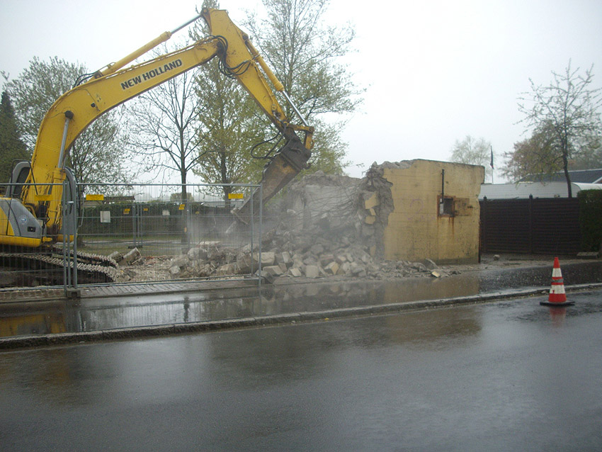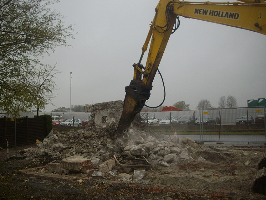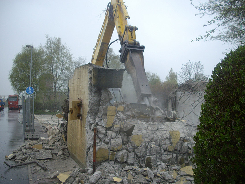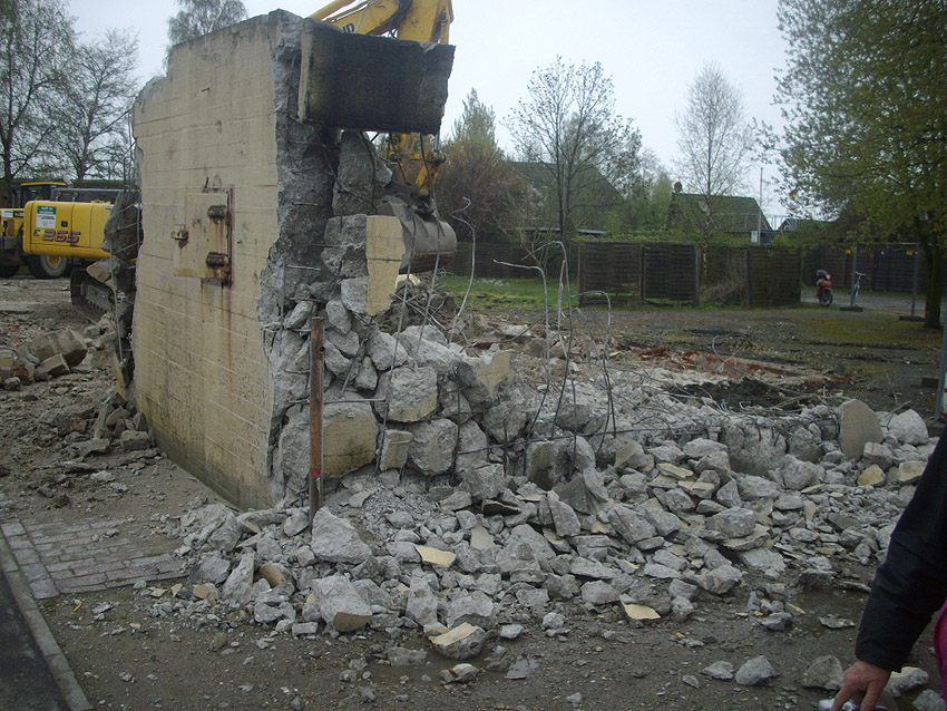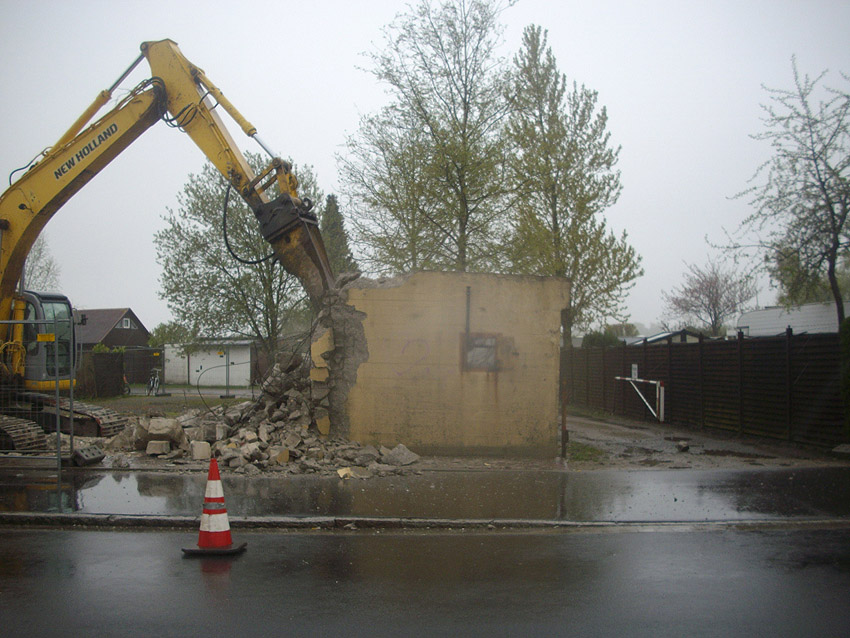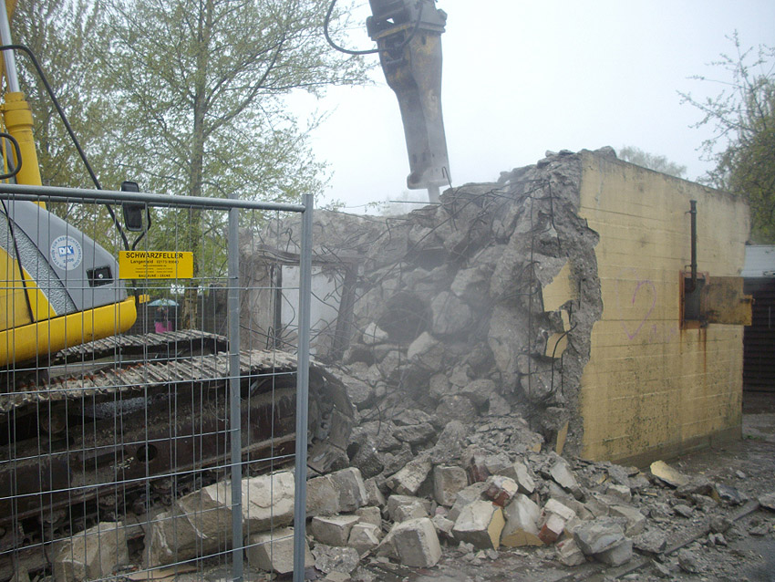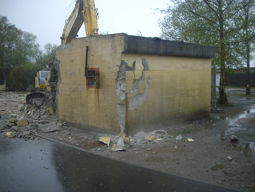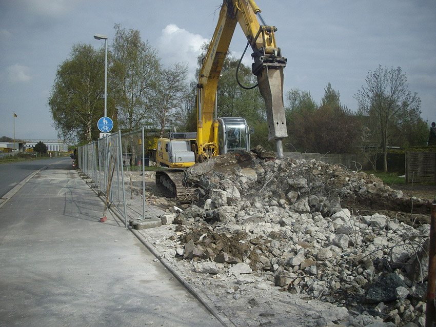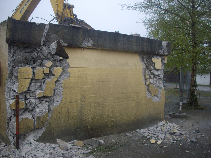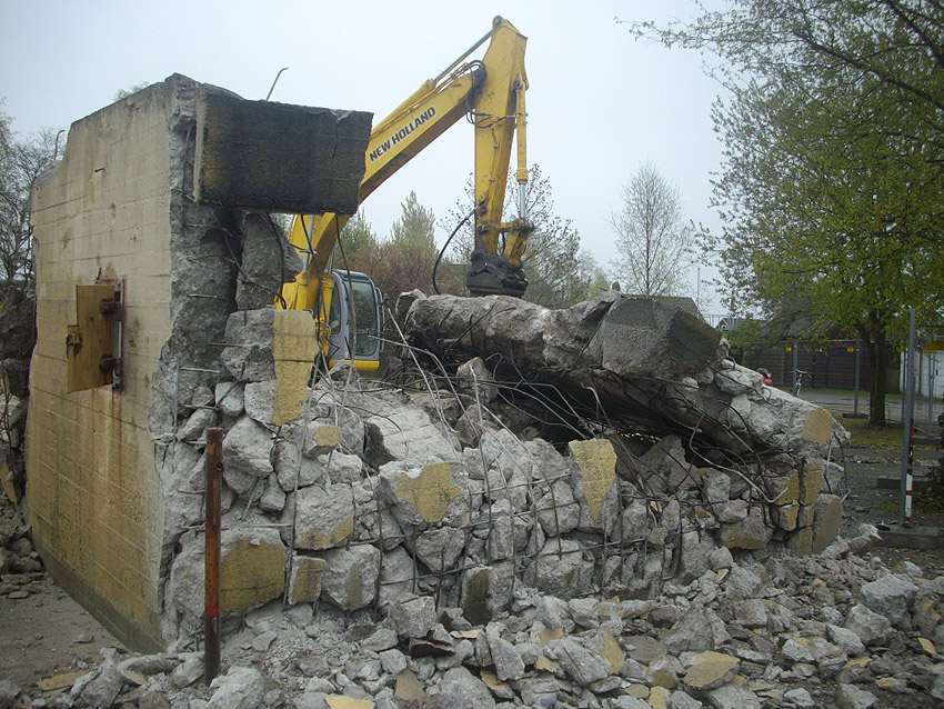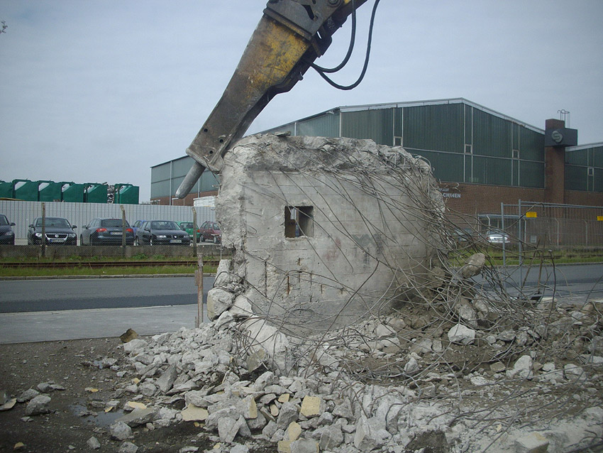 26.04.10: Wie erwartet wurde heute der Bunker abgerissen. Zwischen 13 und 17 Uhr erfolgte die Entfernung des Betonklotzes. Der Bunker erwies sich zäher als vermutet. Engmaschige Bewehrung trat sofort nach Abrissbeginn zum Vorschein. Sie verzögerte die Arbeiten erheblich. Der etwa 4,5 Meter lange, ungefähr 3,5 Meter breite und circa 3 Meter hohe Bunker mit 50 cm starken Wänden und Decke besaß zudem eine massive Fundamentplatte, die an den Kanten eine Tiefe von bis zu 80 cm aufwies. Zum Feierabend war vom Bunker jedoch nur noch ein Trümmerhaufen übrig. Trotz teilweise widrigster Witterungsbedingungen gelang es uns, einige interessante Bilder vom Abriss anzufertigen. Damit gehört auch dieses Bauwerk der Geschichte an. Die nächsten Tage werden noch einige Fotos von der Planierung des Geländes / Trümmerentfernung angefertigt. Aufgrund der 203 Bilddateien ist zum zügigen Betrachten eine DSL-Verbindung erforderlich!