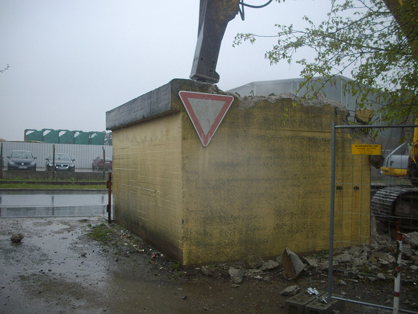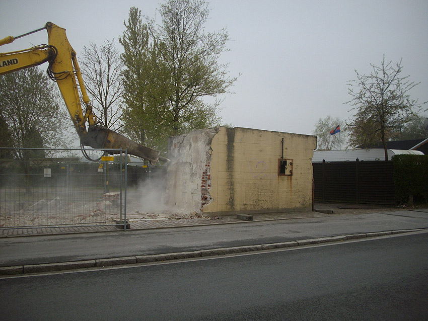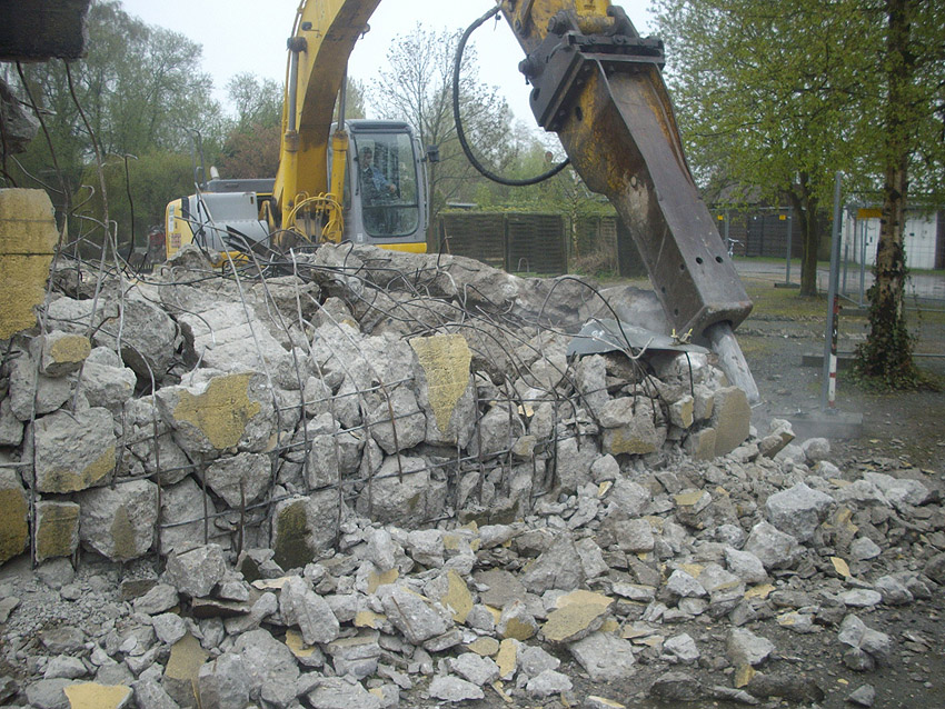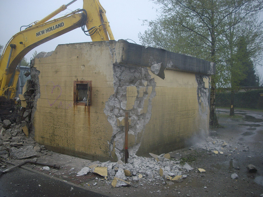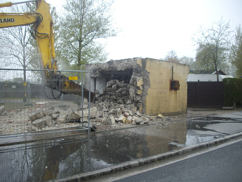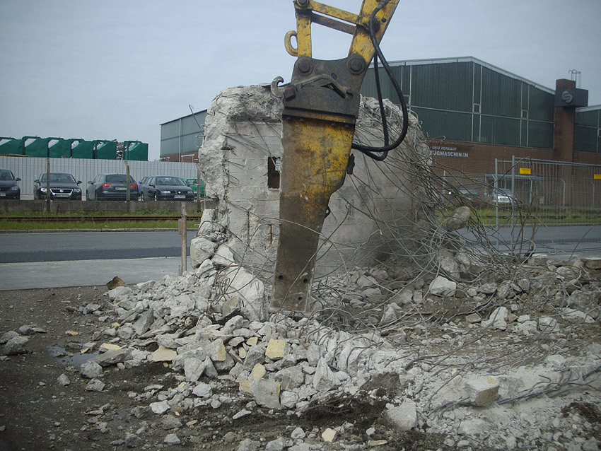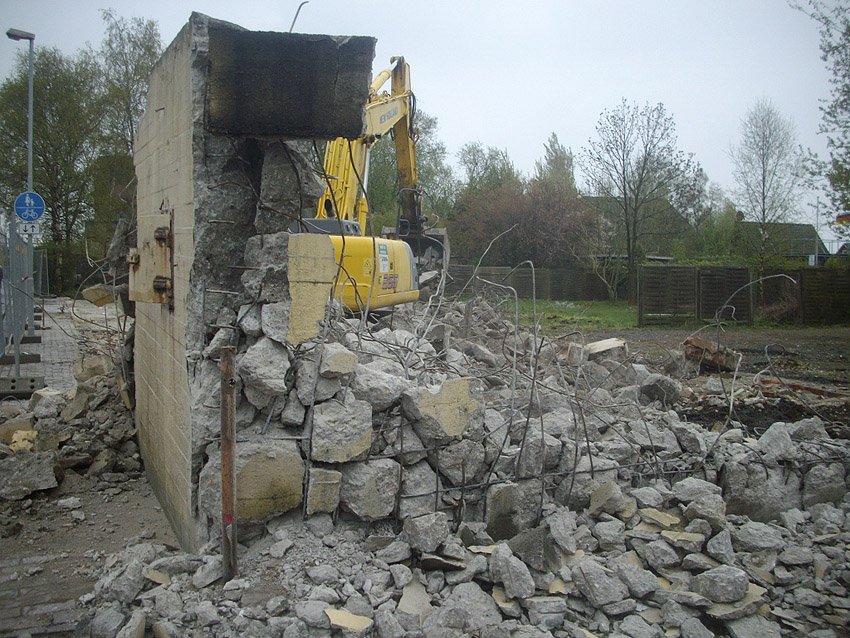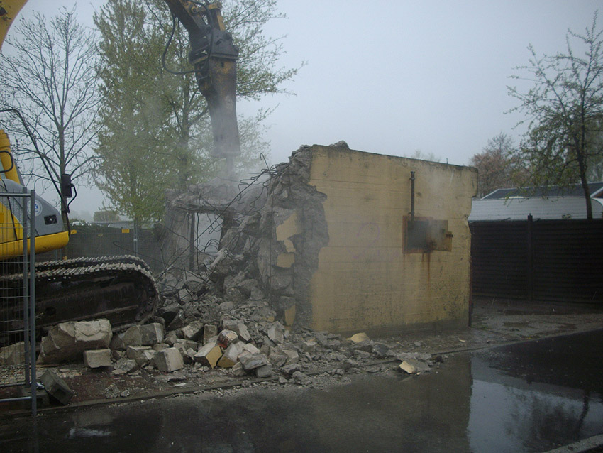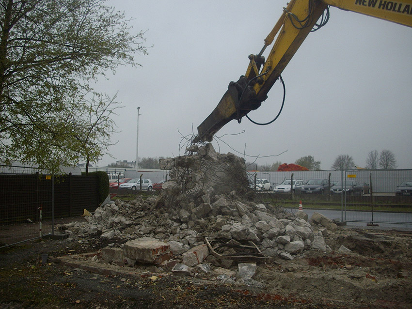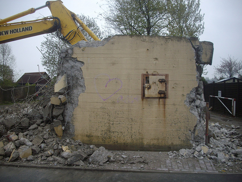 26.04.10: Wie erwartet wurde heute der Bunker abgerissen. Zwischen 13 und 17 Uhr erfolgte die Entfernung des Betonklotzes. Der Bunker erwies sich zäher als vermutet. Engmaschige Bewehrung trat sofort nach Abrissbeginn zum Vorschein. Sie verzögerte die Arbeiten erheblich. Der etwa 4,5 Meter lange, ungefähr 3,5 Meter breite und circa 3 Meter hohe Bunker mit 50 cm starken Wänden und Decke besaß zudem eine massive Fundamentplatte, die an den Kanten eine Tiefe von bis zu 80 cm aufwies. Zum Feierabend war vom Bunker jedoch nur noch ein Trümmerhaufen übrig. Trotz teilweise widrigster Witterungsbedingungen gelang es uns, einige interessante Bilder vom Abriss anzufertigen. Damit gehört auch dieses Bauwerk der Geschichte an. Die nächsten Tage werden noch einige Fotos von der Planierung des Geländes / Trümmerentfernung angefertigt. Aufgrund der 203 Bilddateien ist zum zügigen Betrachten eine DSL-Verbindung erforderlich!