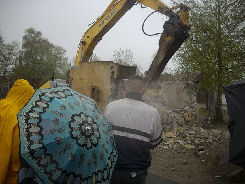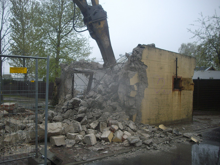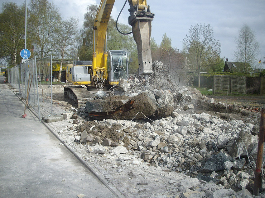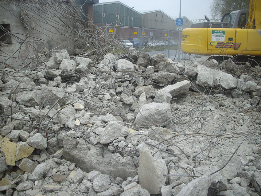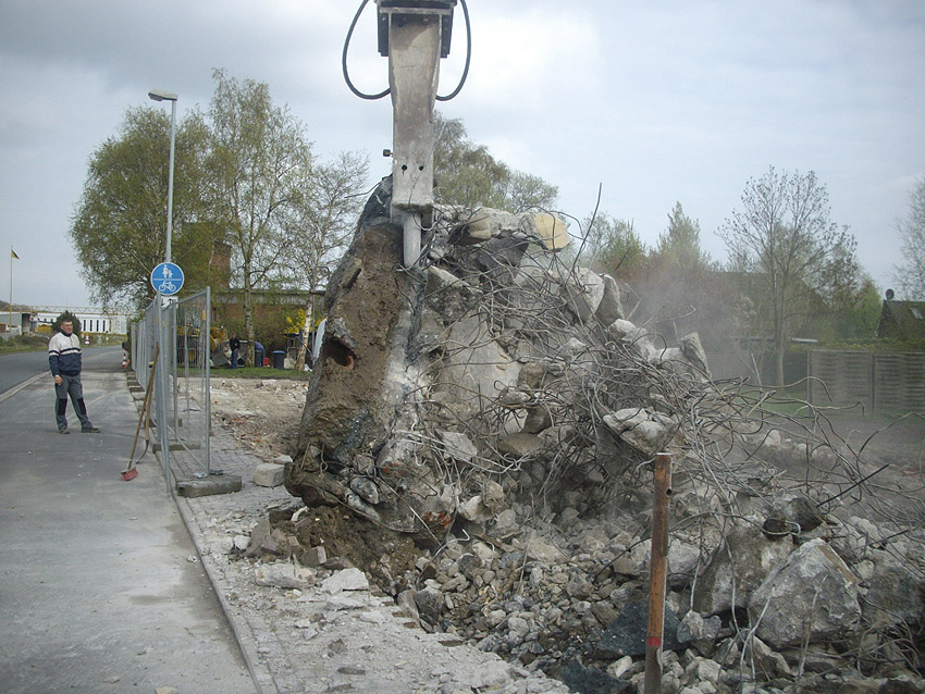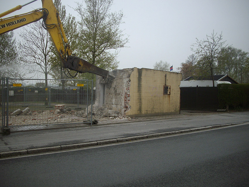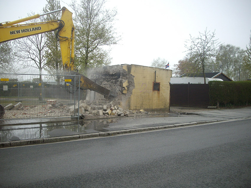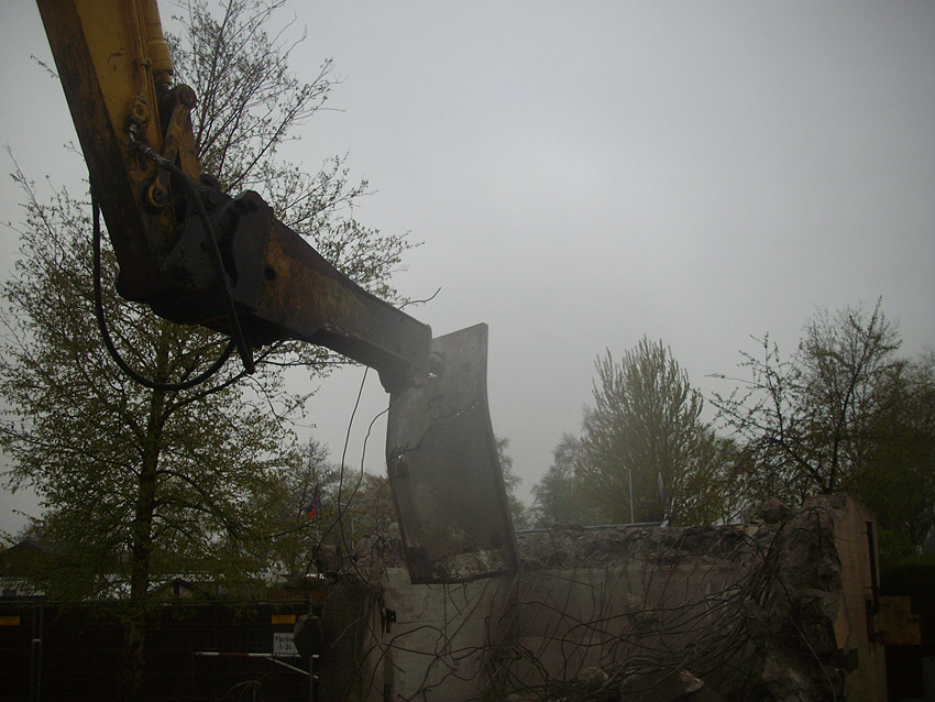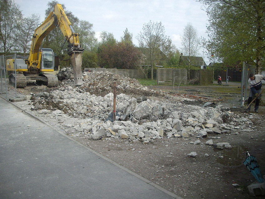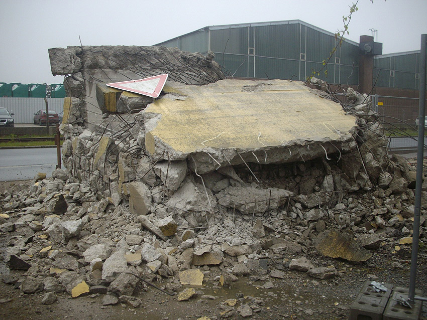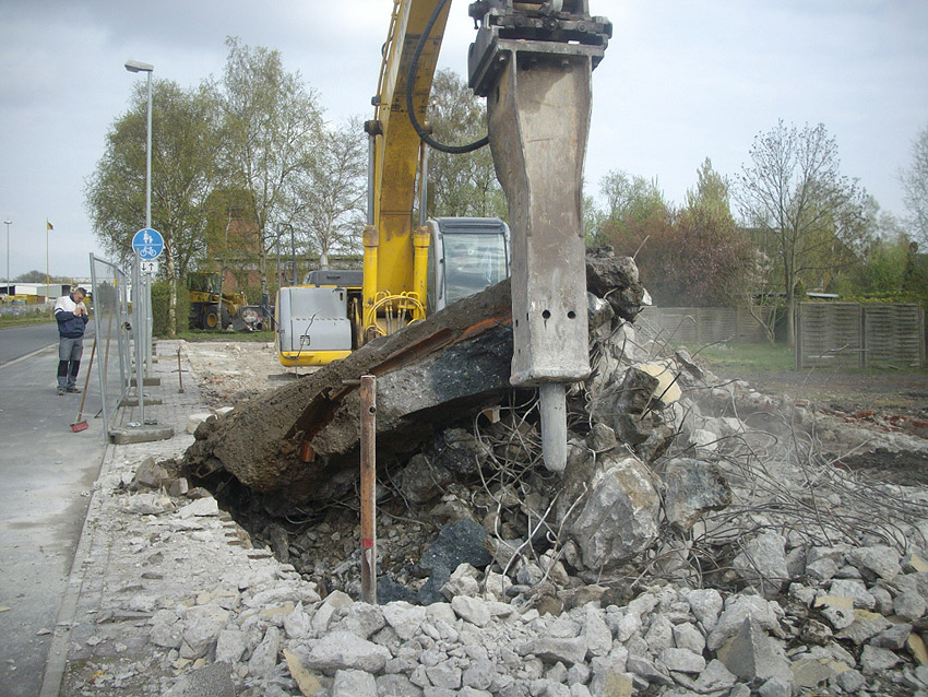 26.04.10: Wie erwartet wurde heute der Bunker abgerissen. Zwischen 13 und 17 Uhr erfolgte die Entfernung des Betonklotzes. Der Bunker erwies sich zäher als vermutet. Engmaschige Bewehrung trat sofort nach Abrissbeginn zum Vorschein. Sie verzögerte die Arbeiten erheblich. Der etwa 4,5 Meter lange, ungefähr 3,5 Meter breite und circa 3 Meter hohe Bunker mit 50 cm starken Wänden und Decke besaß zudem eine massive Fundamentplatte, die an den Kanten eine Tiefe von bis zu 80 cm aufwies. Zum Feierabend war vom Bunker jedoch nur noch ein Trümmerhaufen übrig. Trotz teilweise widrigster Witterungsbedingungen gelang es uns, einige interessante Bilder vom Abriss anzufertigen. Damit gehört auch dieses Bauwerk der Geschichte an. Die nächsten Tage werden noch einige Fotos von der Planierung des Geländes / Trümmerentfernung angefertigt. Aufgrund der 203 Bilddateien ist zum zügigen Betrachten eine DSL-Verbindung erforderlich!