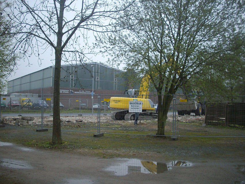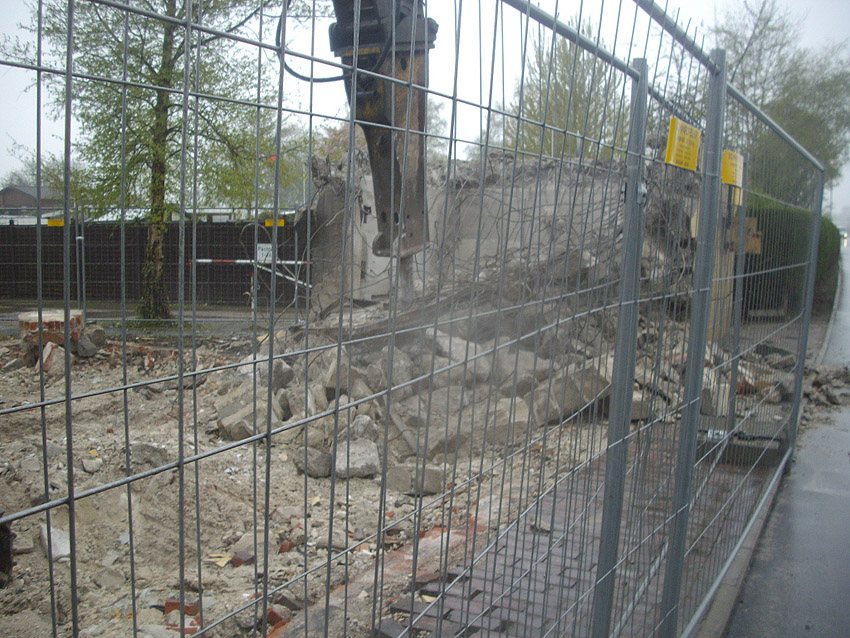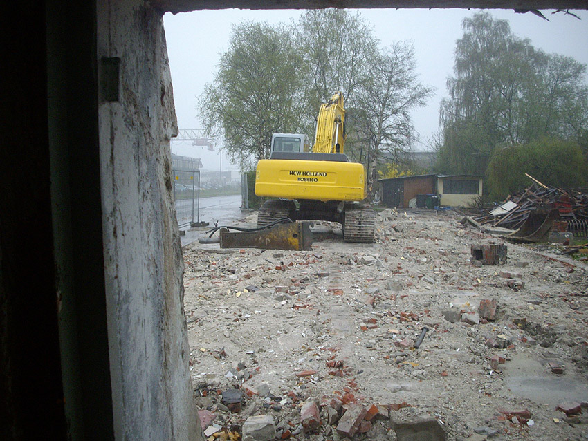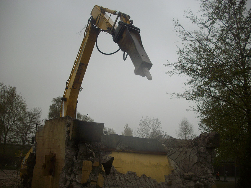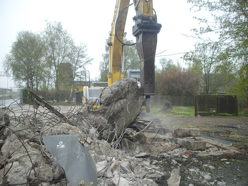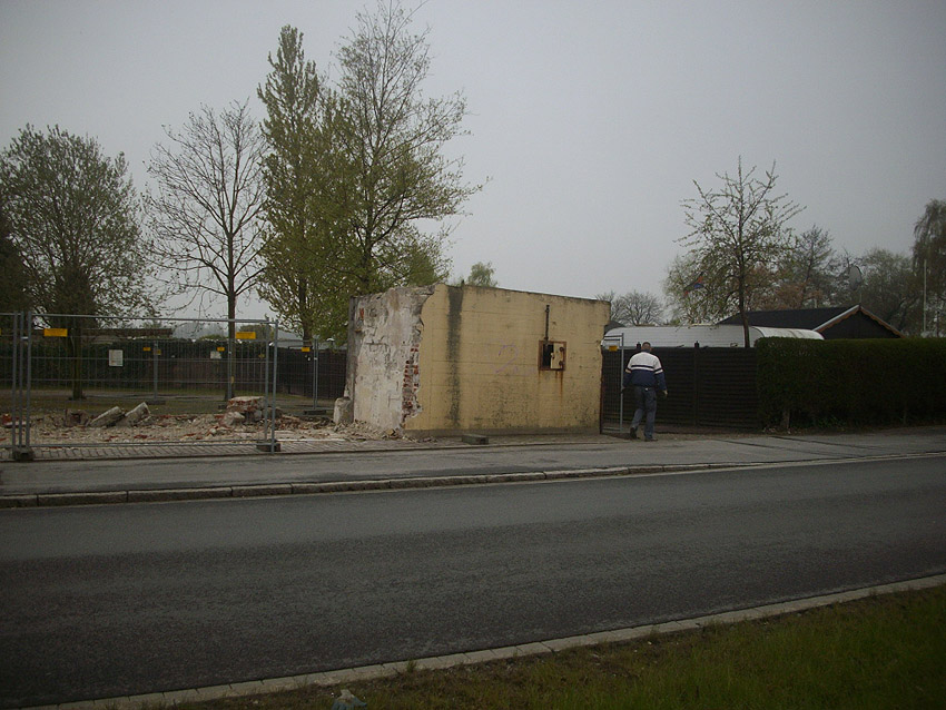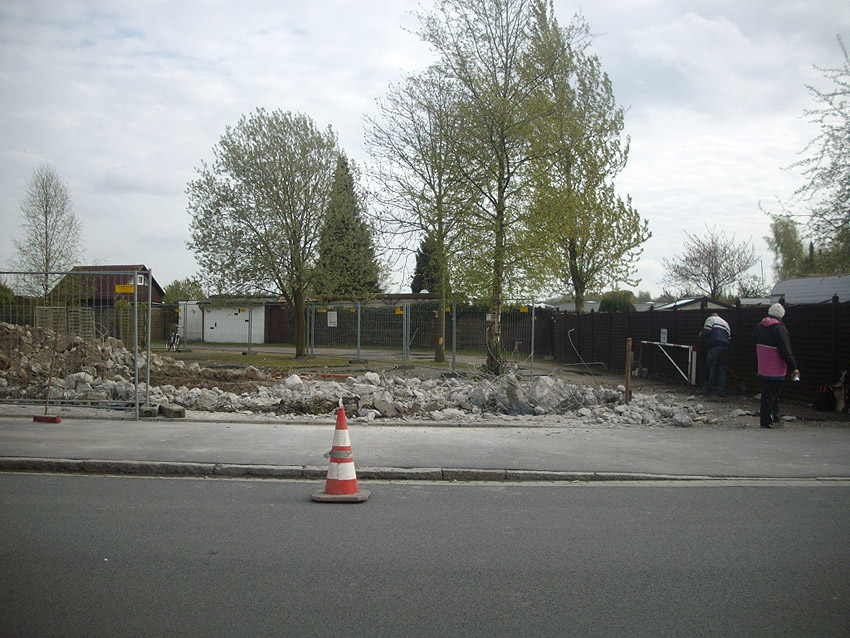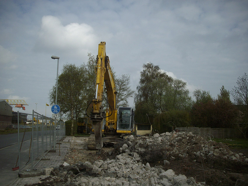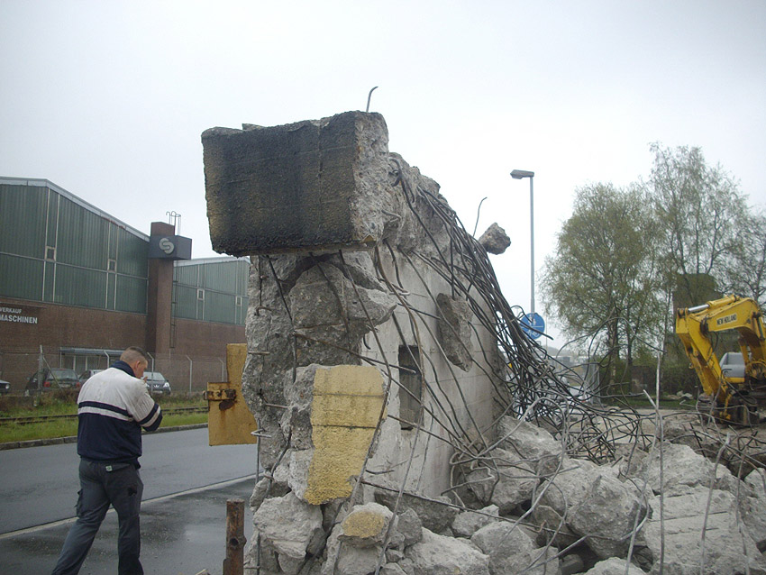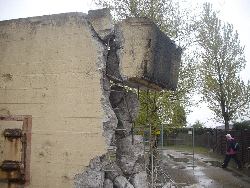 26.04.10: Wie erwartet wurde heute der Bunker abgerissen. Zwischen 13 und 17 Uhr erfolgte die Entfernung des Betonklotzes. Der Bunker erwies sich zäher als vermutet. Engmaschige Bewehrung trat sofort nach Abrissbeginn zum Vorschein. Sie verzögerte die Arbeiten erheblich. Der etwa 4,5 Meter lange, ungefähr 3,5 Meter breite und circa 3 Meter hohe Bunker mit 50 cm starken Wänden und Decke besaß zudem eine massive Fundamentplatte, die an den Kanten eine Tiefe von bis zu 80 cm aufwies. Zum Feierabend war vom Bunker jedoch nur noch ein Trümmerhaufen übrig. Trotz teilweise widrigster Witterungsbedingungen gelang es uns, einige interessante Bilder vom Abriss anzufertigen. Damit gehört auch dieses Bauwerk der Geschichte an. Die nächsten Tage werden noch einige Fotos von der Planierung des Geländes / Trümmerentfernung angefertigt. Aufgrund der 203 Bilddateien ist zum zügigen Betrachten eine DSL-Verbindung erforderlich!
