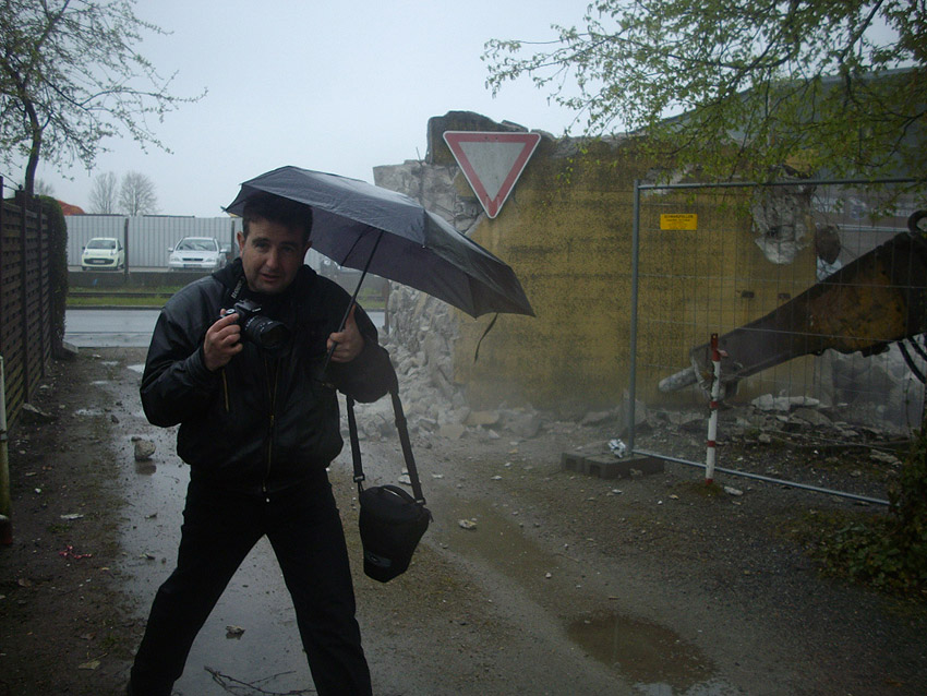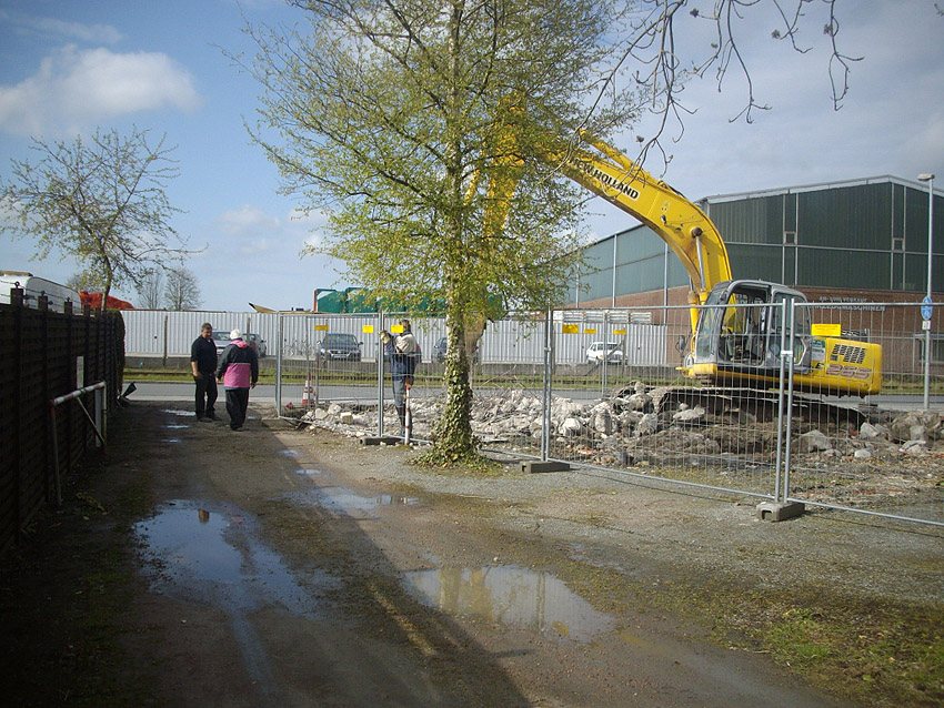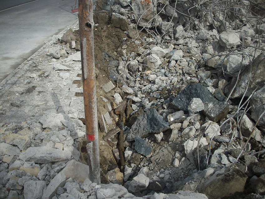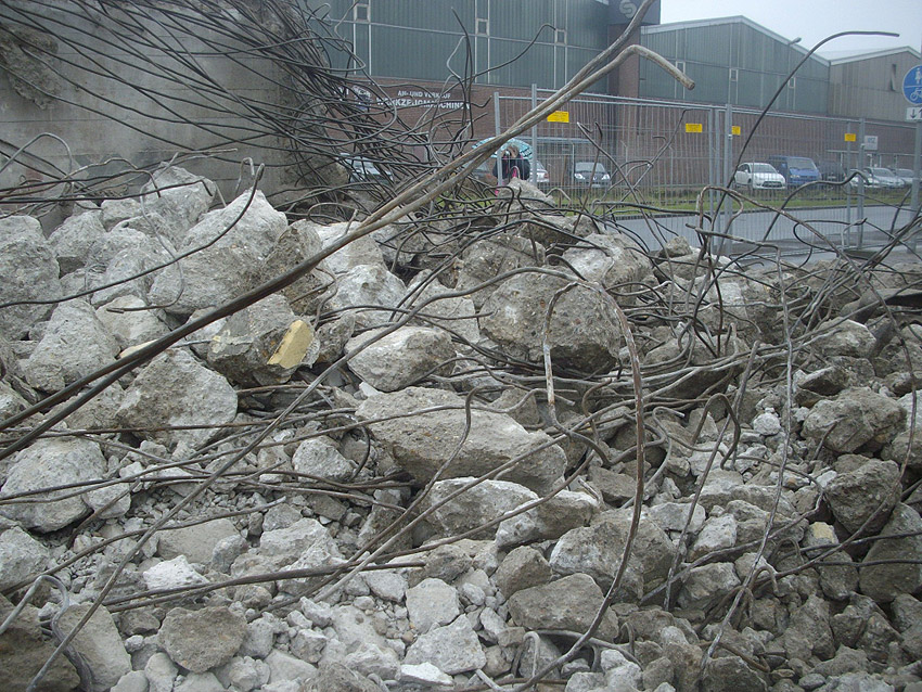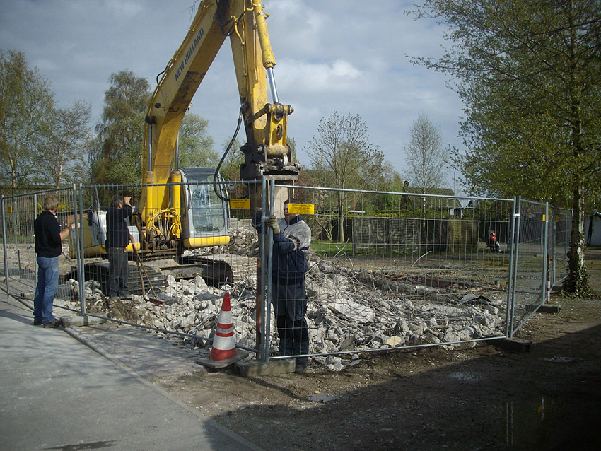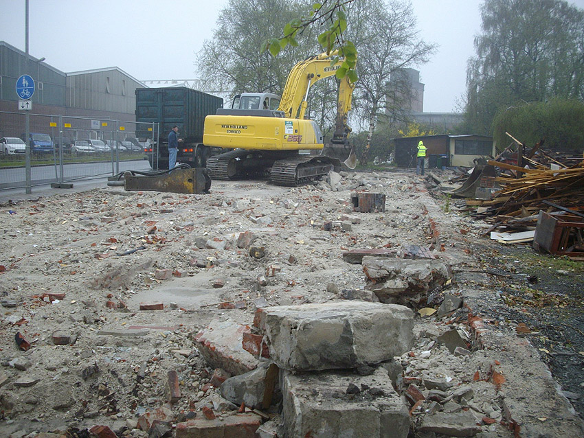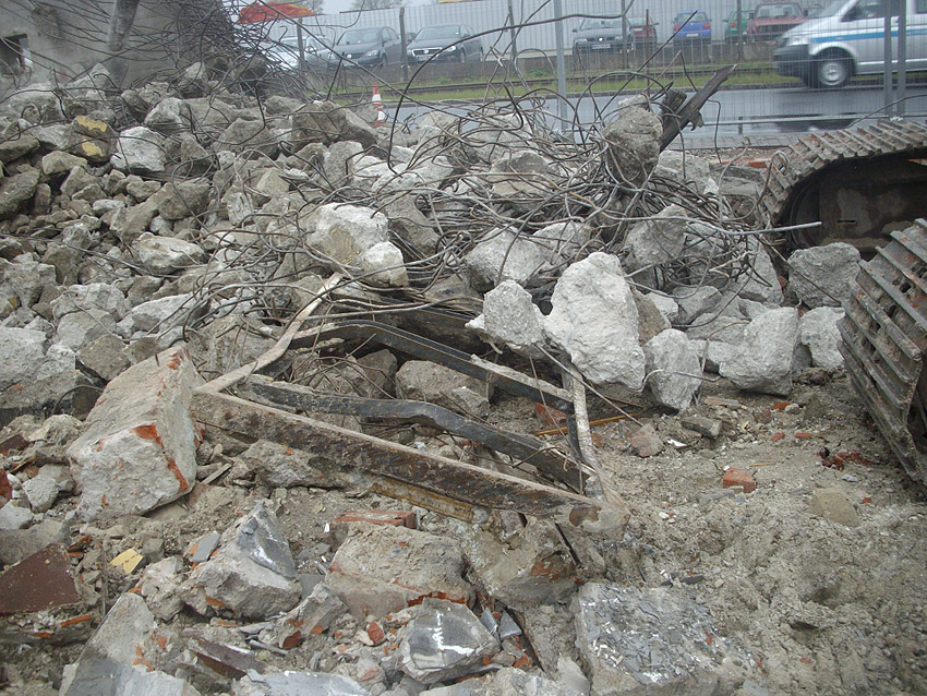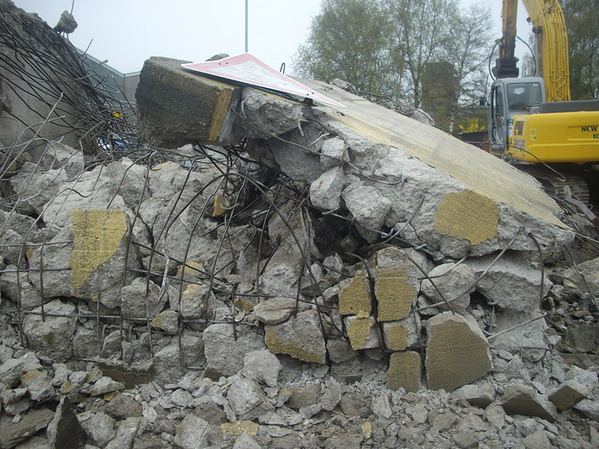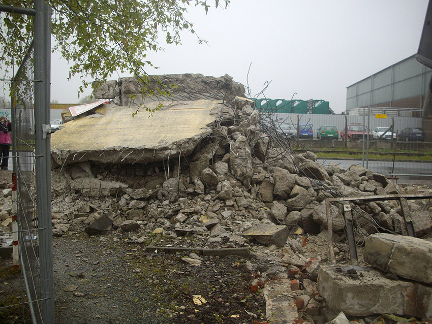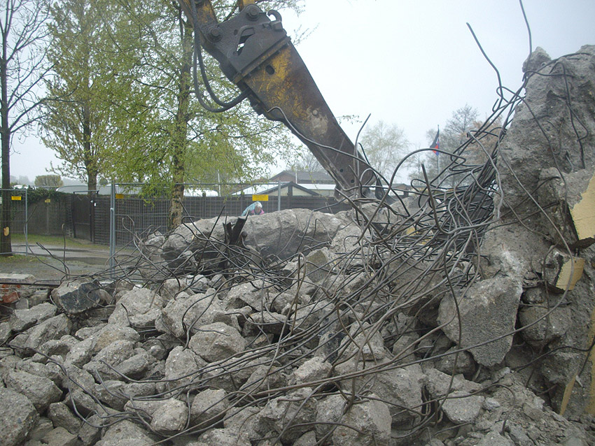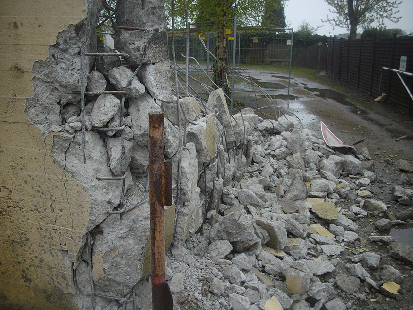 26.04.10: Wie erwartet wurde heute der Bunker abgerissen. Zwischen 13 und 17 Uhr erfolgte die Entfernung des Betonklotzes. Der Bunker erwies sich zäher als vermutet. Engmaschige Bewehrung trat sofort nach Abrissbeginn zum Vorschein. Sie verzögerte die Arbeiten erheblich. Der etwa 4,5 Meter lange, ungefähr 3,5 Meter breite und circa 3 Meter hohe Bunker mit 50 cm starken Wänden und Decke besaß zudem eine massive Fundamentplatte, die an den Kanten eine Tiefe von bis zu 80 cm aufwies. Zum Feierabend war vom Bunker jedoch nur noch ein Trümmerhaufen übrig. Trotz teilweise widrigster Witterungsbedingungen gelang es uns, einige interessante Bilder vom Abriss anzufertigen. Damit gehört auch dieses Bauwerk der Geschichte an. Die nächsten Tage werden noch einige Fotos von der Planierung des Geländes / Trümmerentfernung angefertigt. Aufgrund der 203 Bilddateien ist zum zügigen Betrachten eine DSL-Verbindung erforderlich!