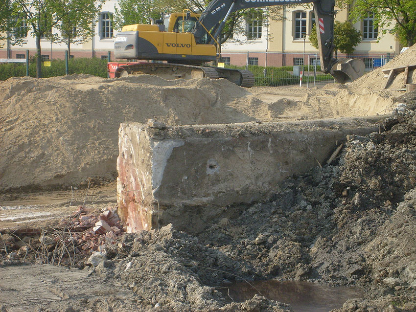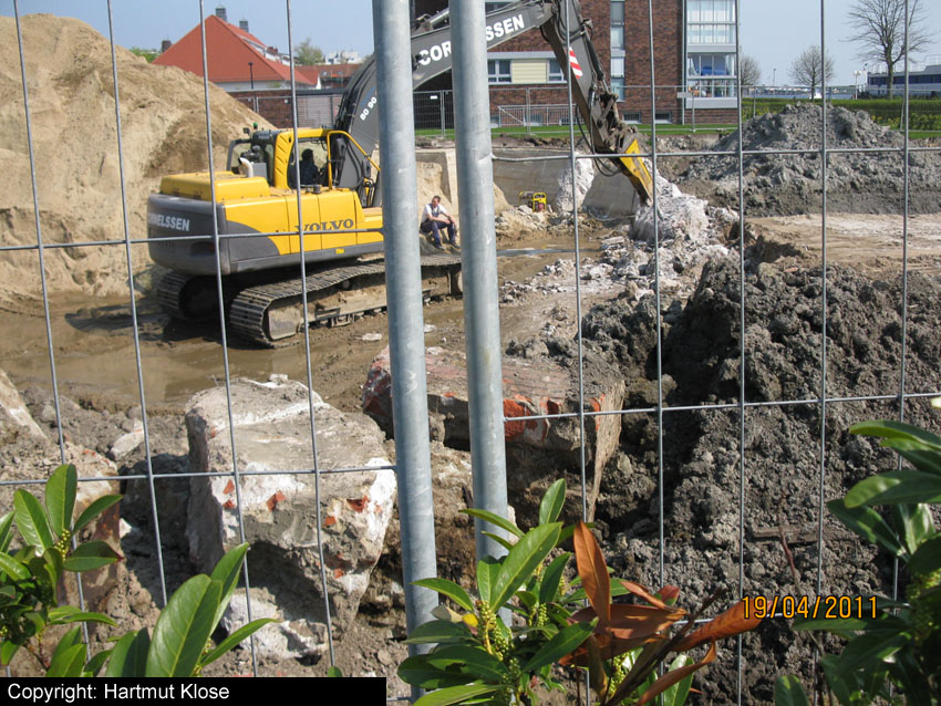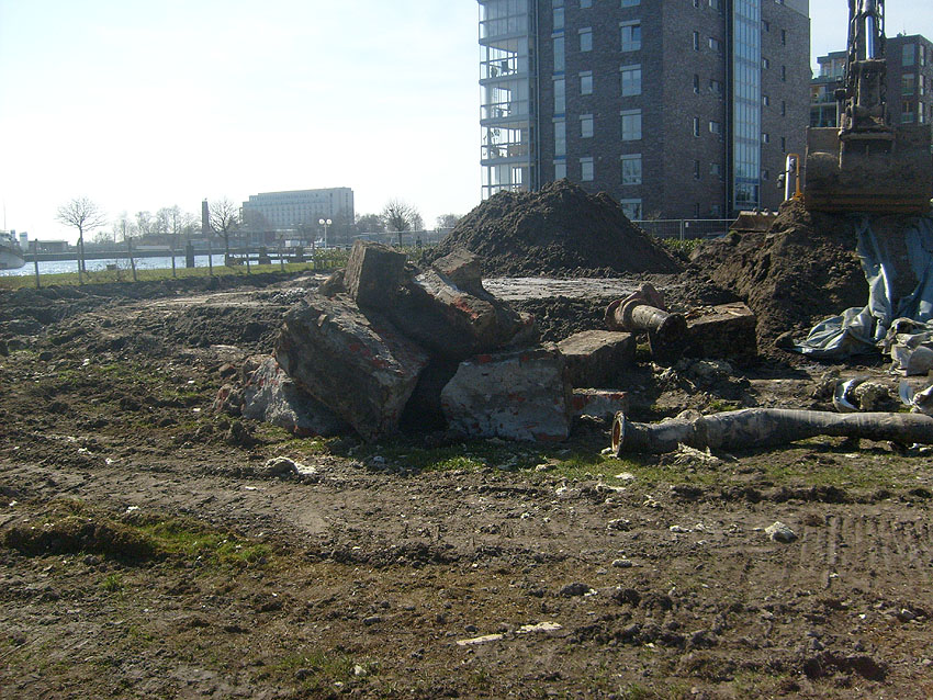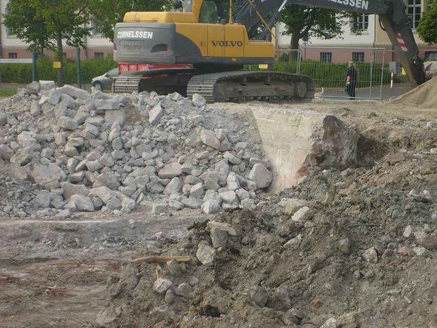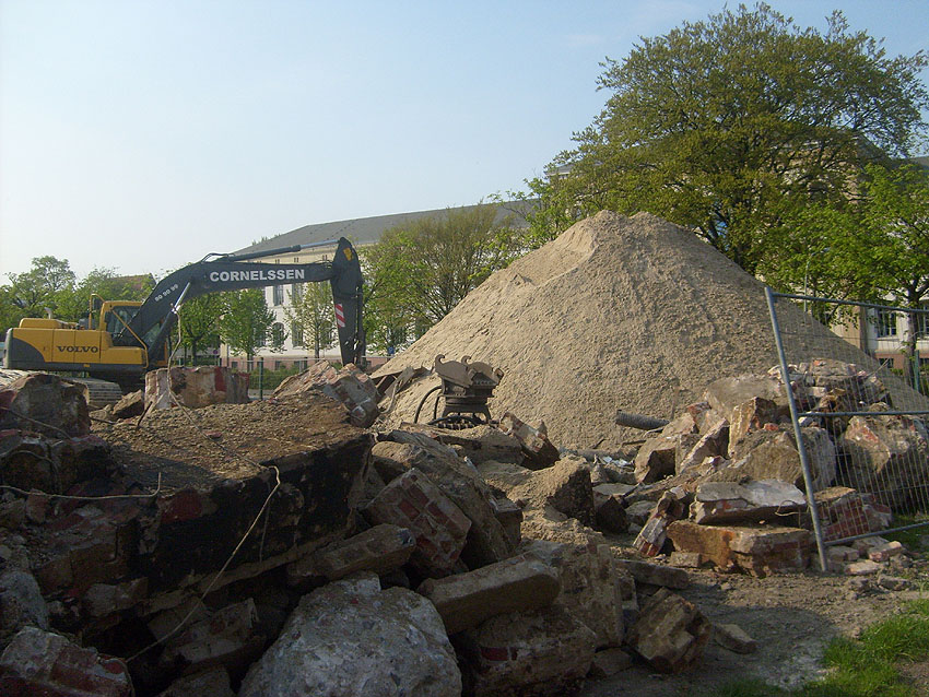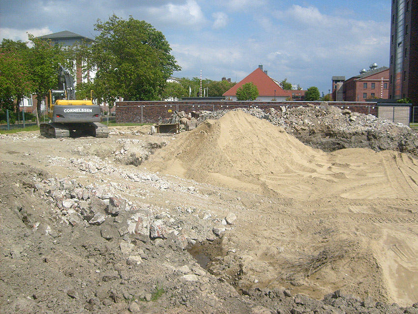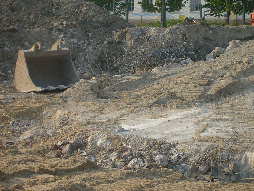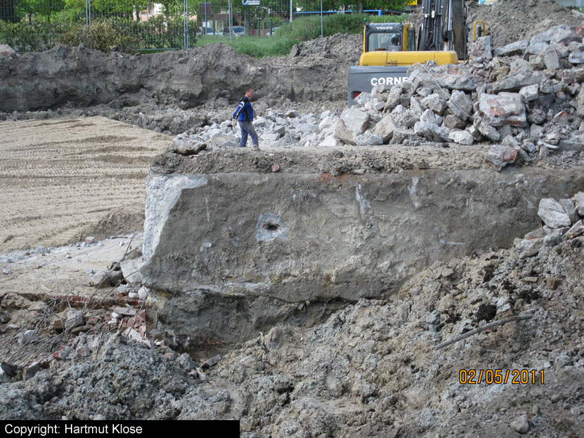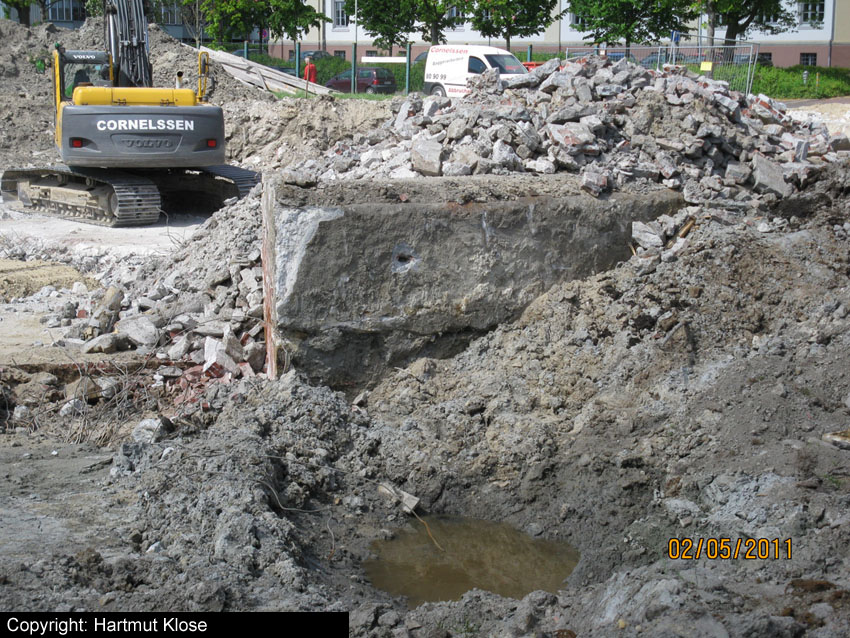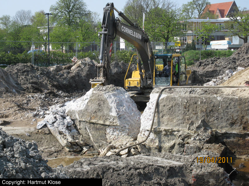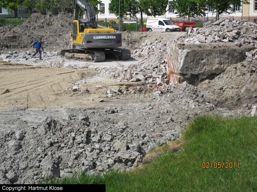 Das Tankfundament ist so gut wie beseitigt. Die Gründungsholzpfähle, beziehungsweise deren Reste verbleiben weiter im Erdreich. In den nächsten Tagen wird der Restschutt abgefahren. Dann ist alles bereit für die Errichtung eines neuen, hübschen Wohnbunkers, die Lücke in der Promenade wird damit dann geschlossen sein.