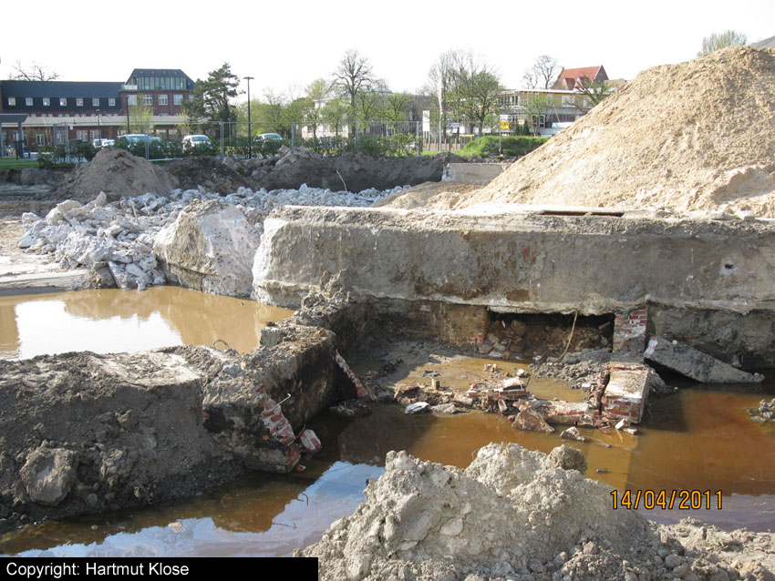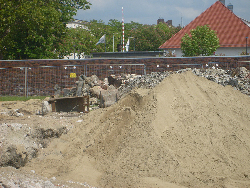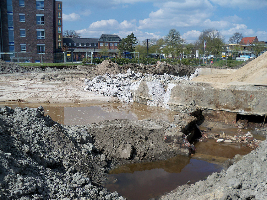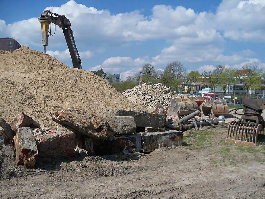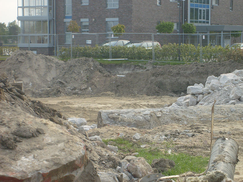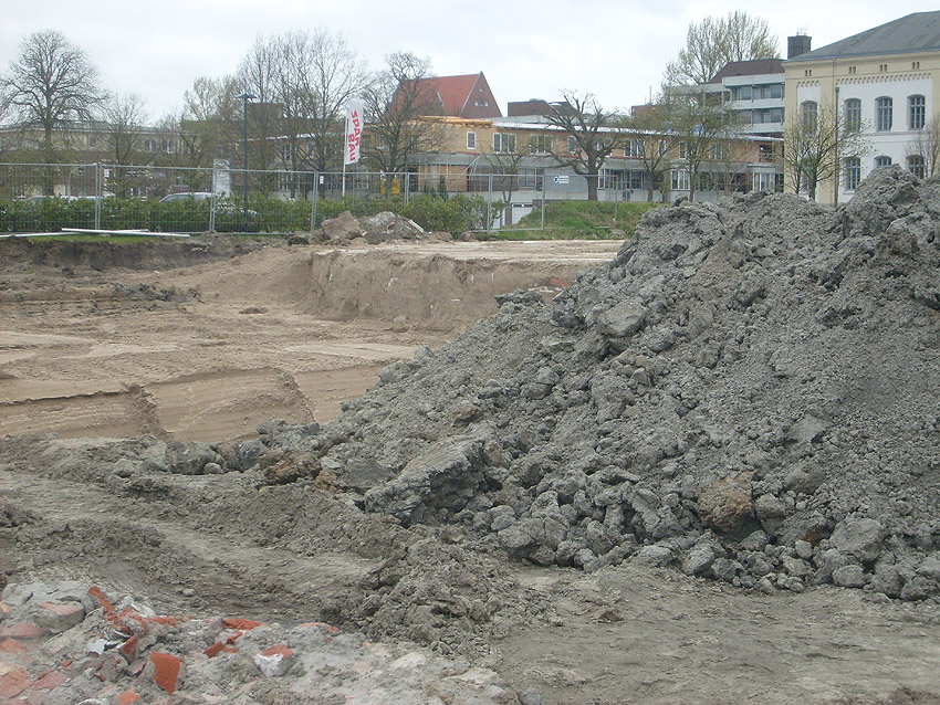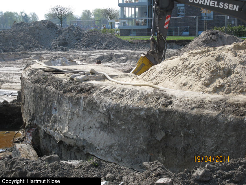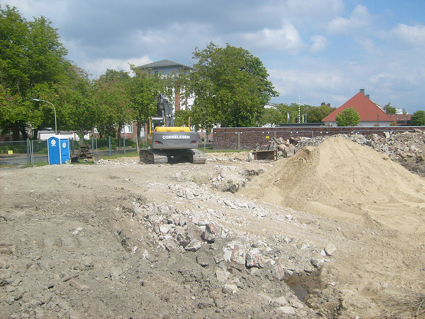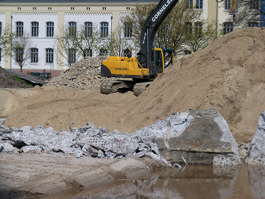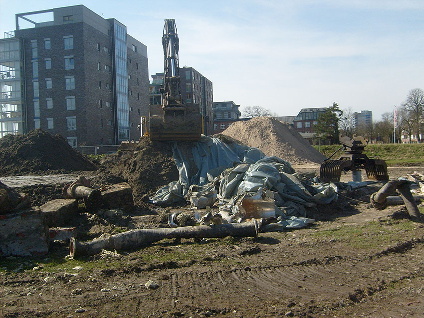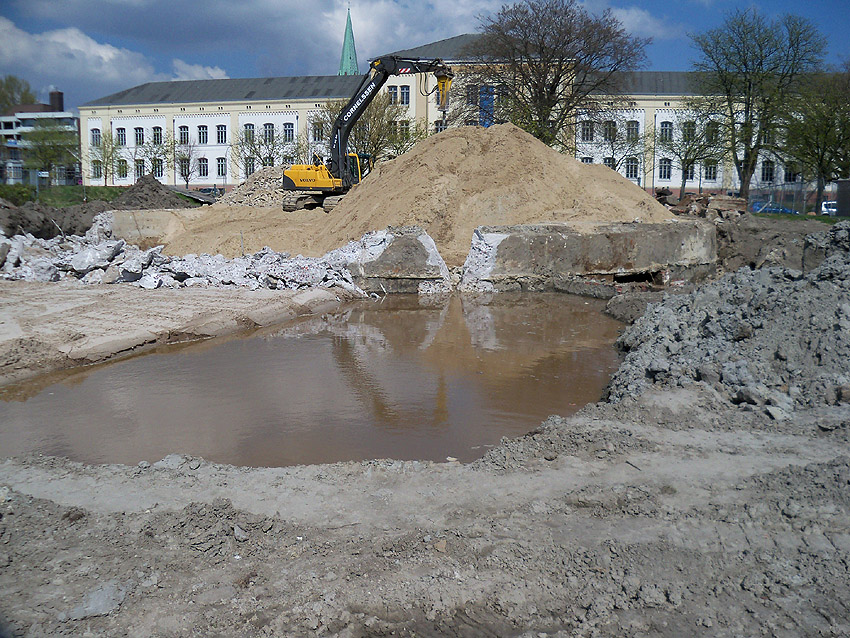 Das Tankfundament ist so gut wie beseitigt. Die Gründungsholzpfähle, beziehungsweise deren Reste verbleiben weiter im Erdreich. In den nächsten Tagen wird der Restschutt abgefahren. Dann ist alles bereit für die Errichtung eines neuen, hübschen Wohnbunkers, die Lücke in der Promenade wird damit dann geschlossen sein.