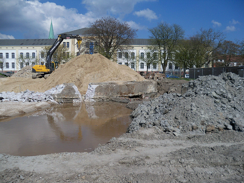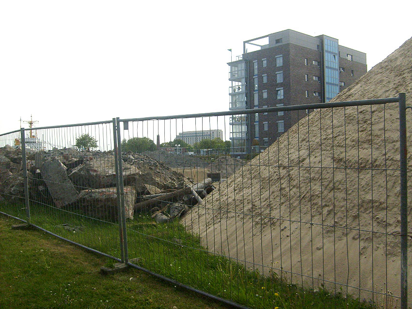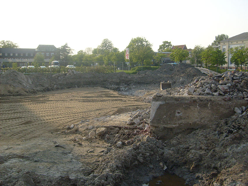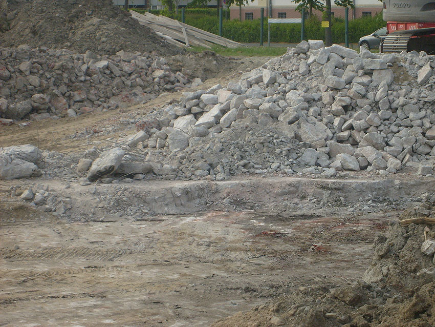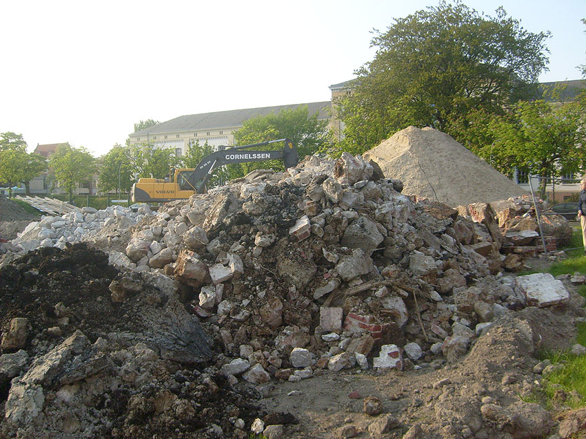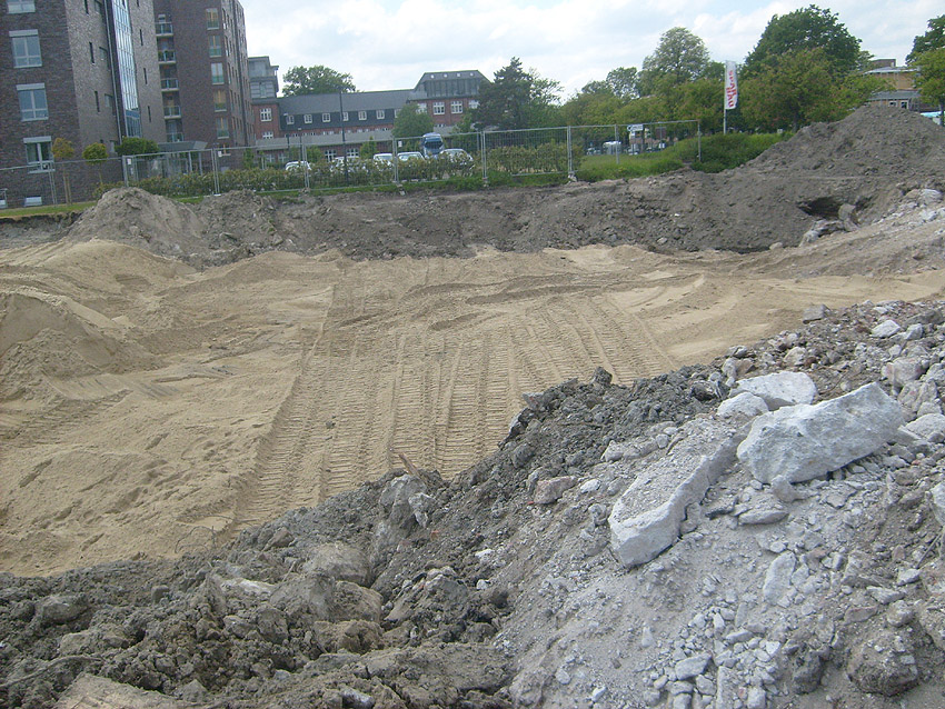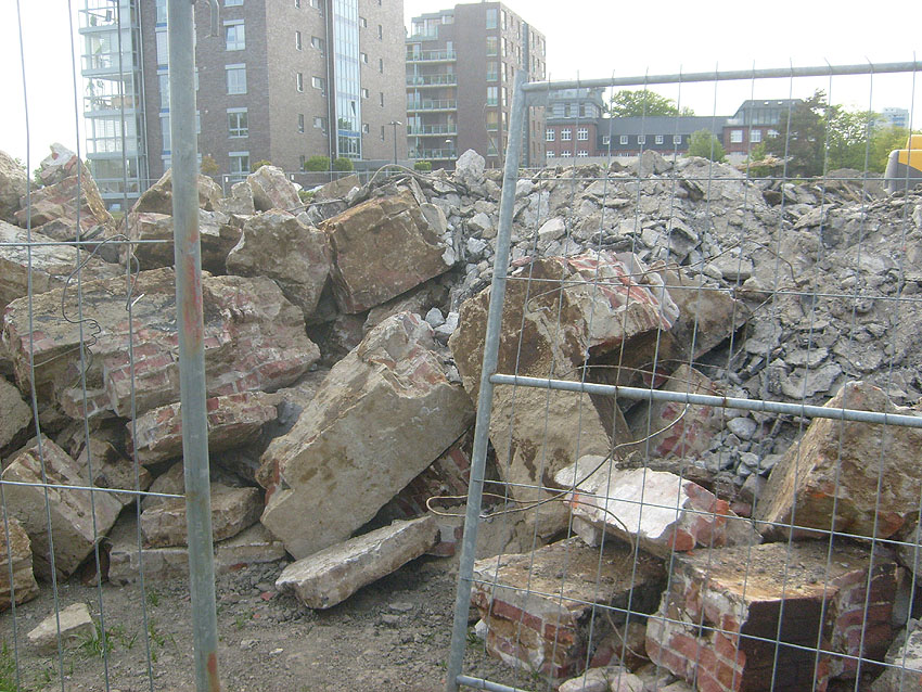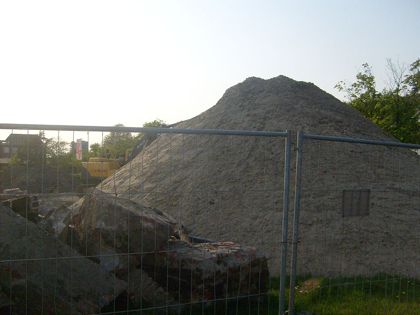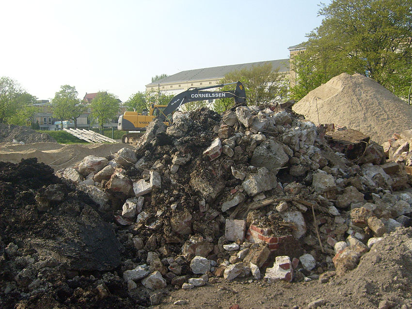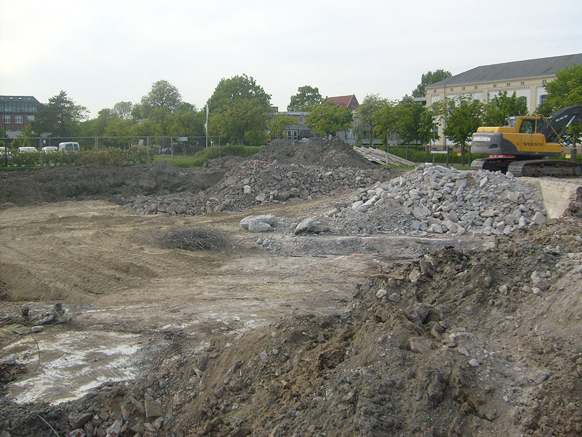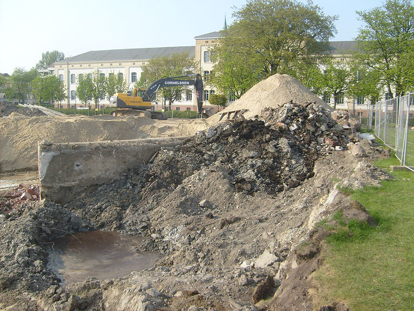 Das Tankfundament ist so gut wie beseitigt. Die Gründungsholzpfähle, beziehungsweise deren Reste verbleiben weiter im Erdreich. In den nächsten Tagen wird der Restschutt abgefahren. Dann ist alles bereit für die Errichtung eines neuen, hübschen Wohnbunkers, die Lücke in der Promenade wird damit dann geschlossen sein.