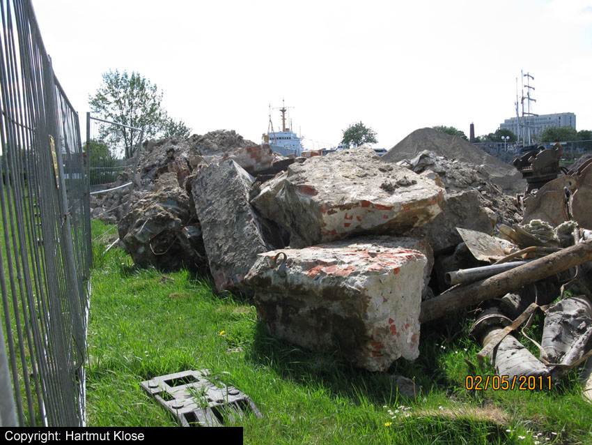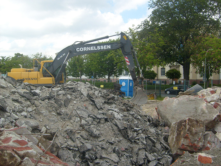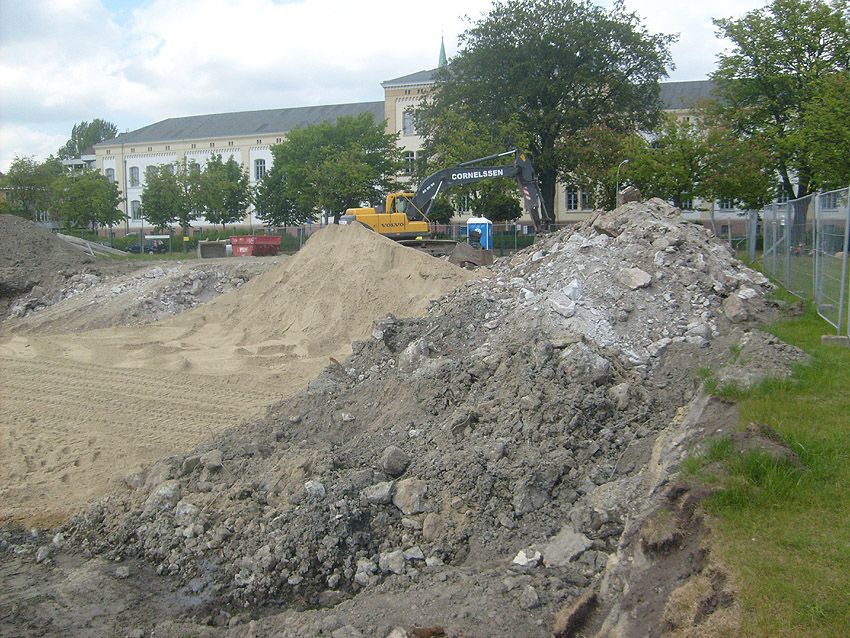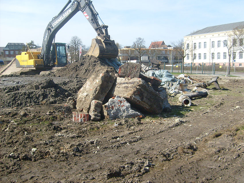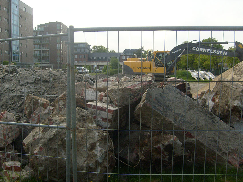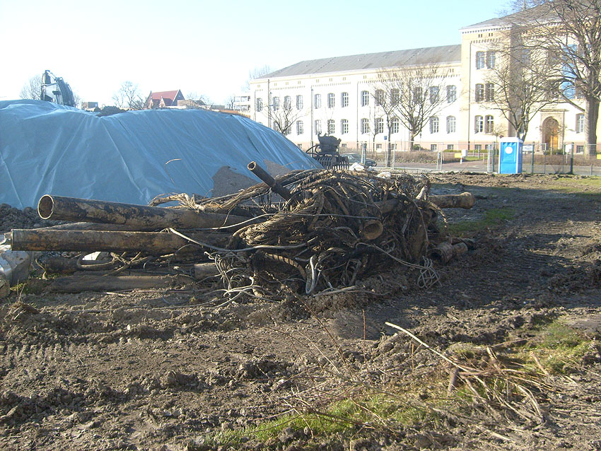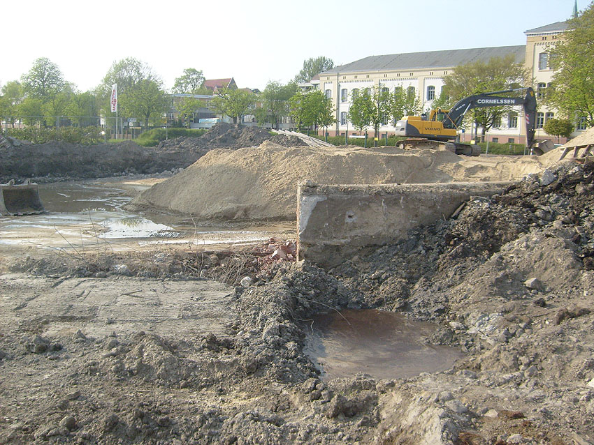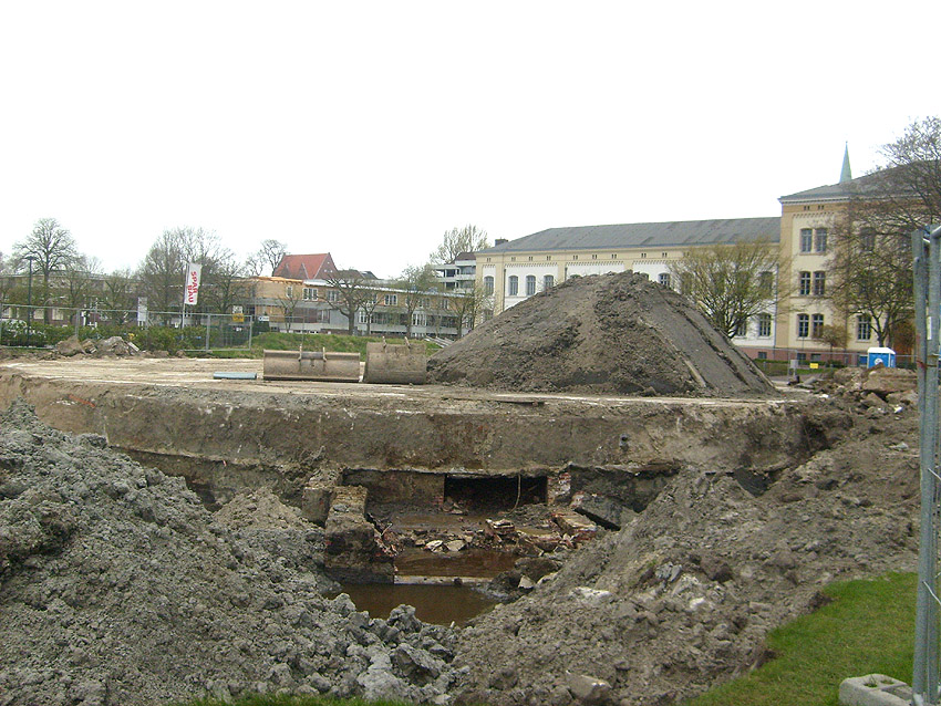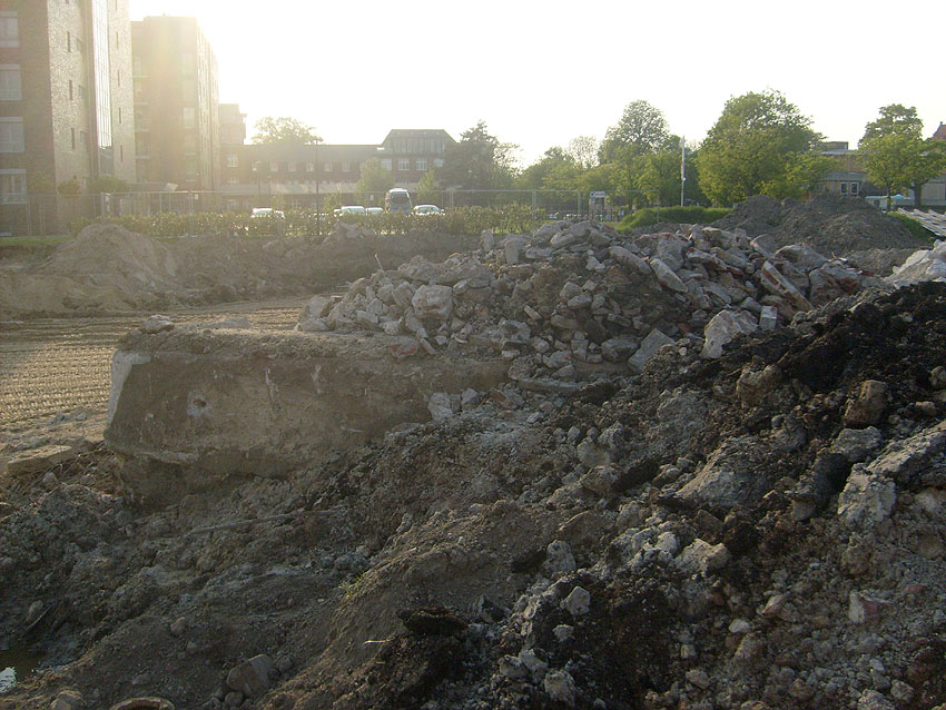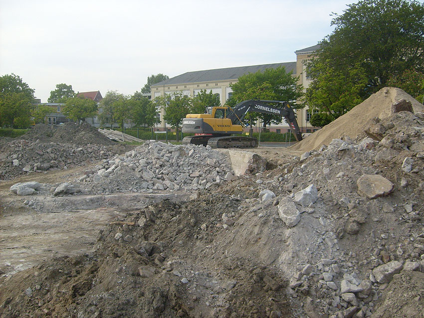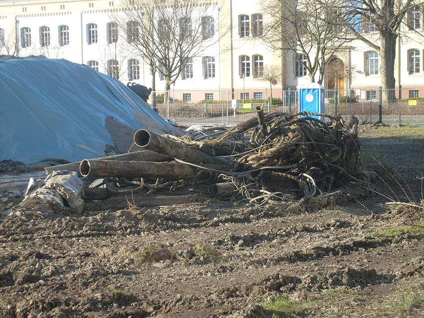 Das Tankfundament ist so gut wie beseitigt. Die Gründungsholzpfähle, beziehungsweise deren Reste verbleiben weiter im Erdreich. In den nächsten Tagen wird der Restschutt abgefahren. Dann ist alles bereit für die Errichtung eines neuen, hübschen Wohnbunkers, die Lücke in der Promenade wird damit dann geschlossen sein.