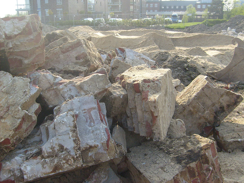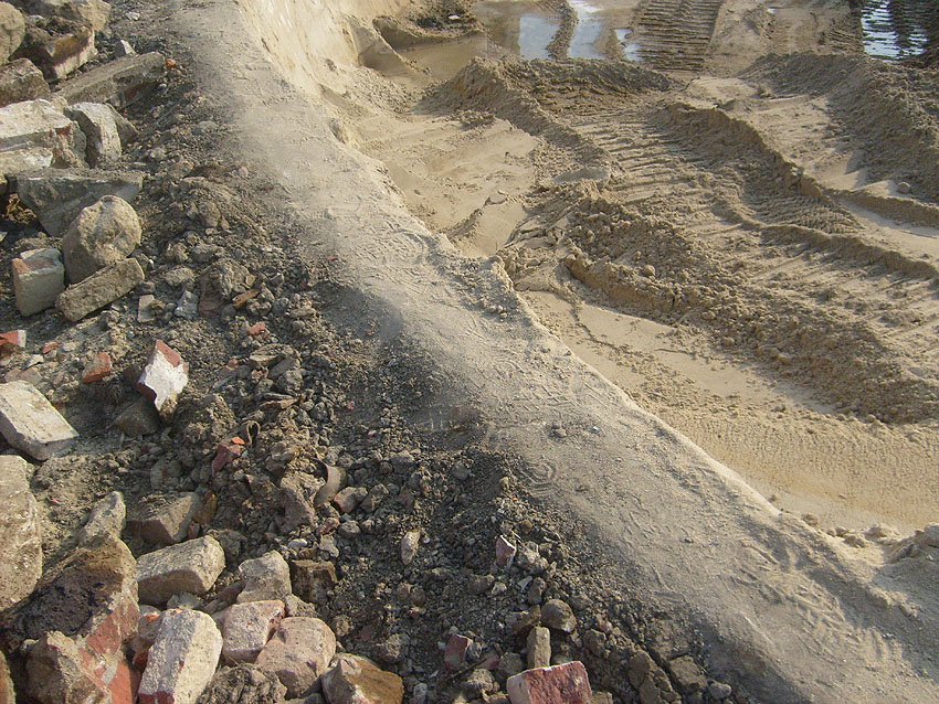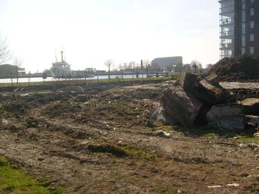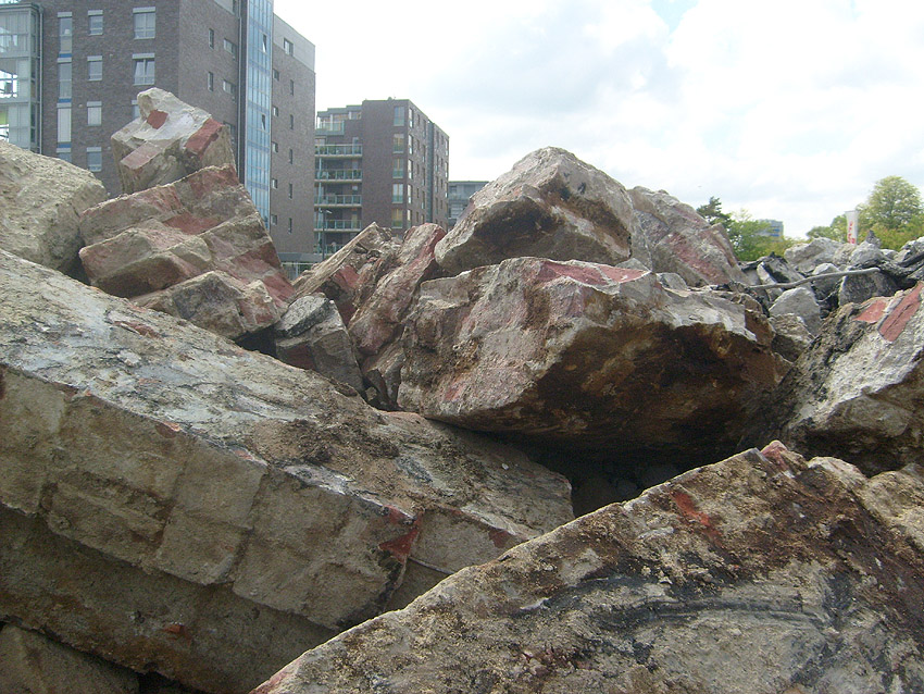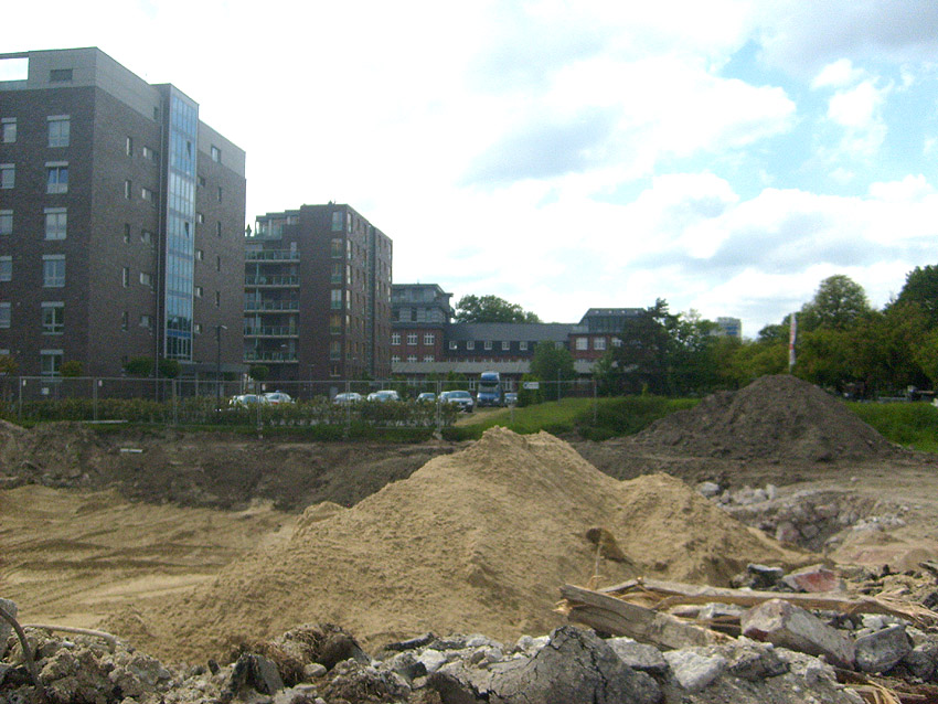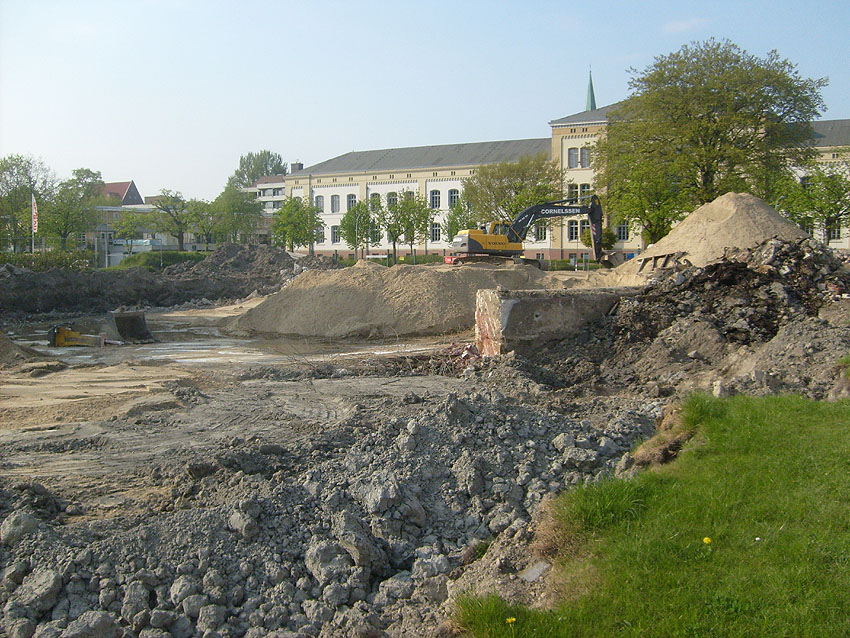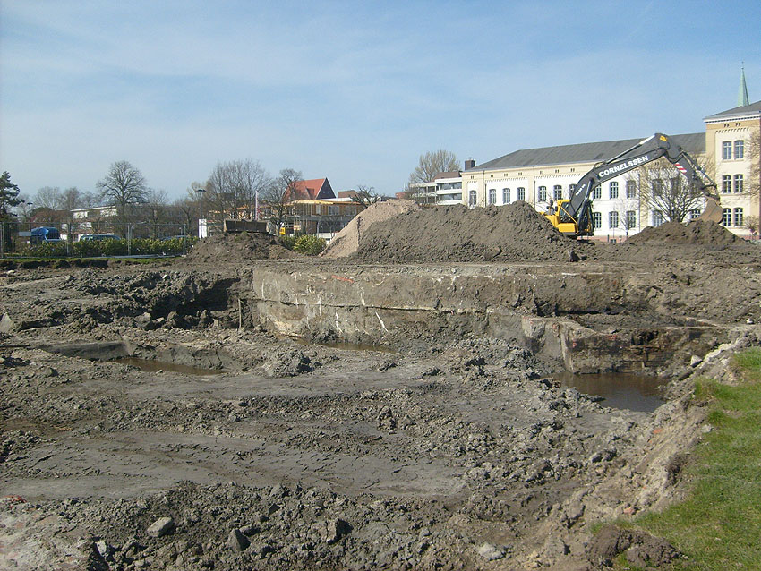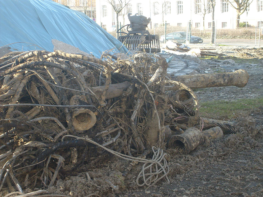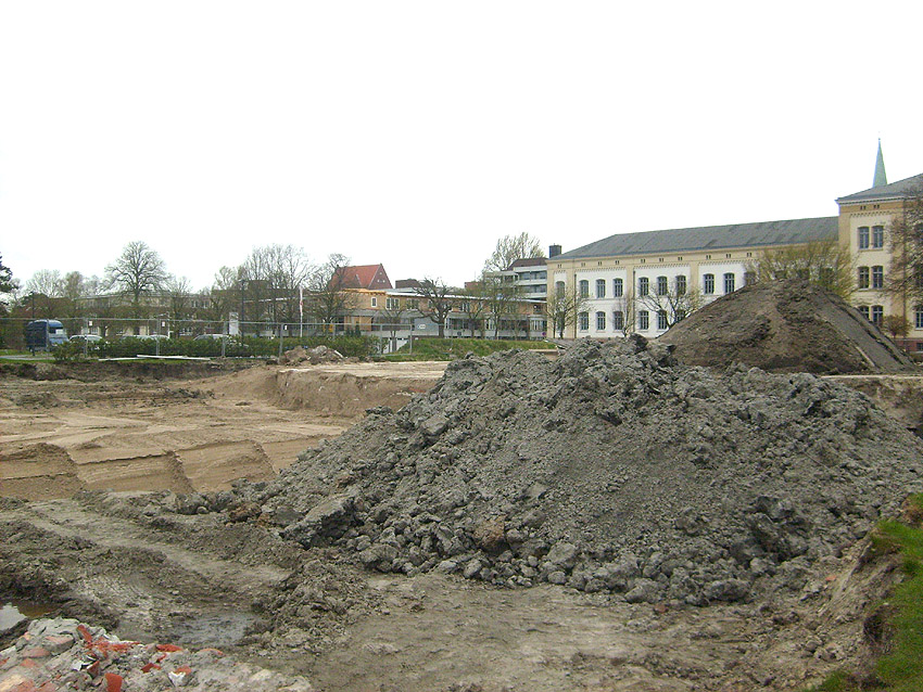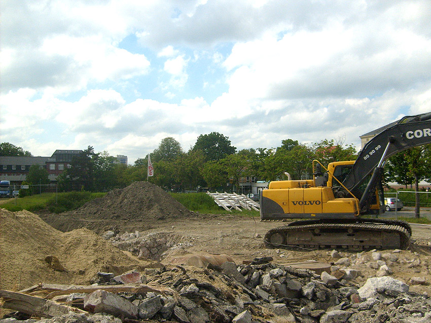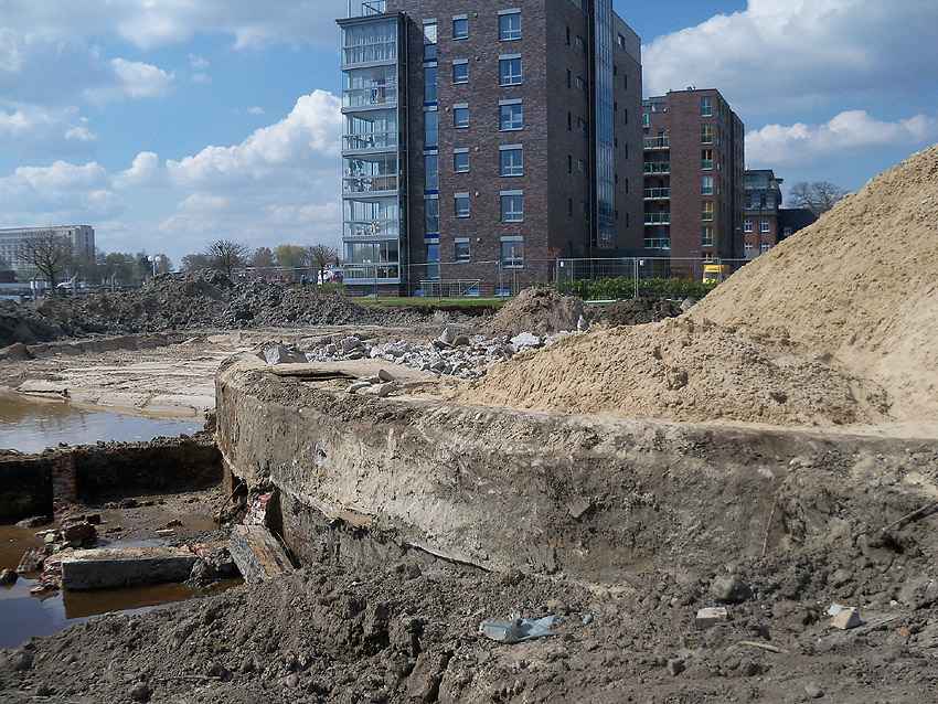 Das Tankfundament ist so gut wie beseitigt. Die Gründungsholzpfähle, beziehungsweise deren Reste verbleiben weiter im Erdreich. In den nächsten Tagen wird der Restschutt abgefahren. Dann ist alles bereit für die Errichtung eines neuen, hübschen Wohnbunkers, die Lücke in der Promenade wird damit dann geschlossen sein.